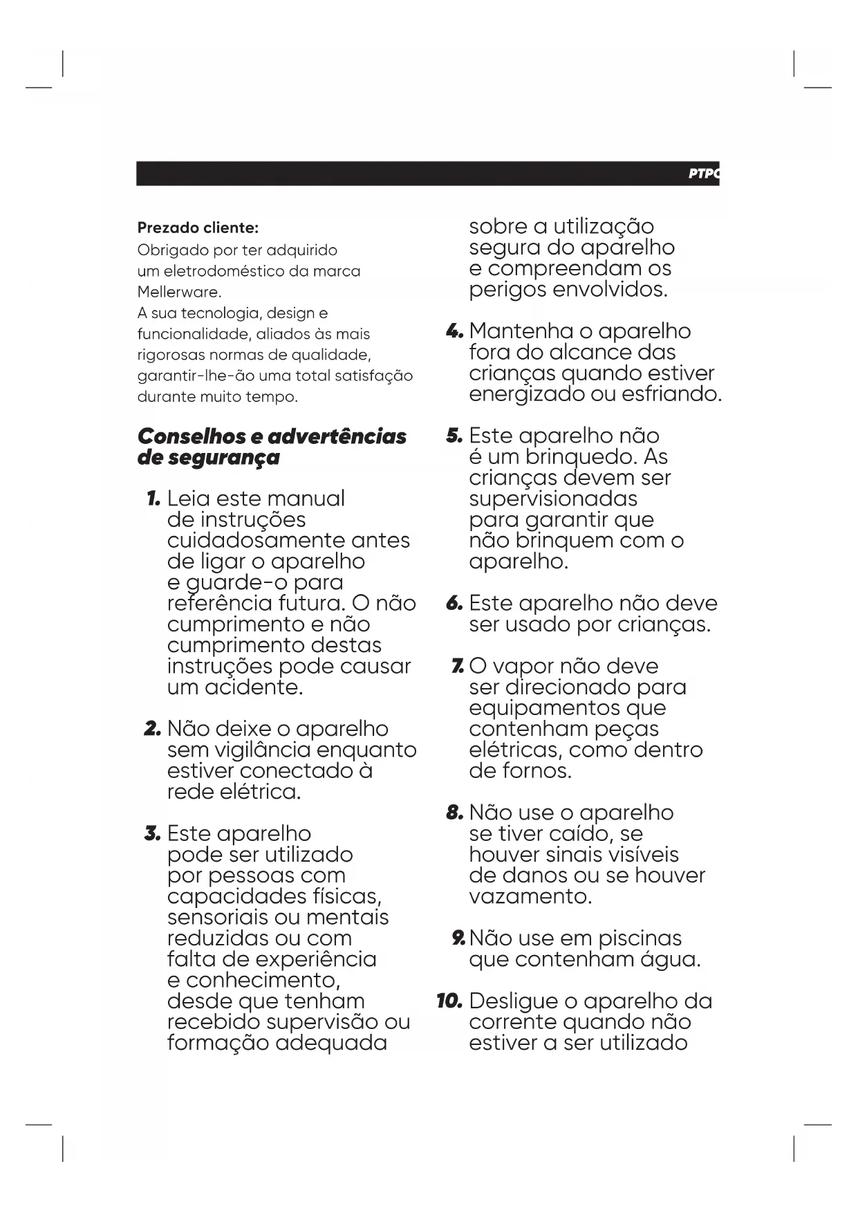 –ES PTPORTUGUÊS Prezado cliente: Obrigado por ter adquirido um eletrodoméstico da marca Mellerware. A sua tecnologia, design e funcionalidade, aliados às mais rigorosas normas de qualidade, garantir-lhe-ão uma total satisfação durante muito tempo. Leia este manual de instruções cuidadosamente antes de ligar o aparelho e guarde-o para referência futura. O não cumprimento e não cumprimento destas instruções pode causar um acidente. Não deixe o aparelho sem vigilância enquanto estiver conectado à rede elétrica. Este aparelho pode ser utilizado por pessoas com capacidades físicas, sensoriais ou mentais reduzidas ou com falta de experiência e conhecimento, desde que tenham recebido supervisão ou formação adequada Conselhos e advertências de segurança sobre a utilização segura do aparelho e compreendam os perigos envolvidos. Mantenha o aparelho fora do alcance das crianças quando estiver energizado ou esfriando. Este aparelho não é um brinquedo. As crianças devem ser supervisionadas para garantir que não brinquem com o aparelho. Este aparelho não deve ser usado por crianças. O vapor não deve ser direcionado para equipamentos que contenham peças elétricas, como dentro de fornos. Não use o aparelho se tiver caído, se houver sinais visíveis de danos ou se houver vazamento. Não use em piscinas que contenham água. Desligue o aparelho da corrente quando não estiver a ser utilizado