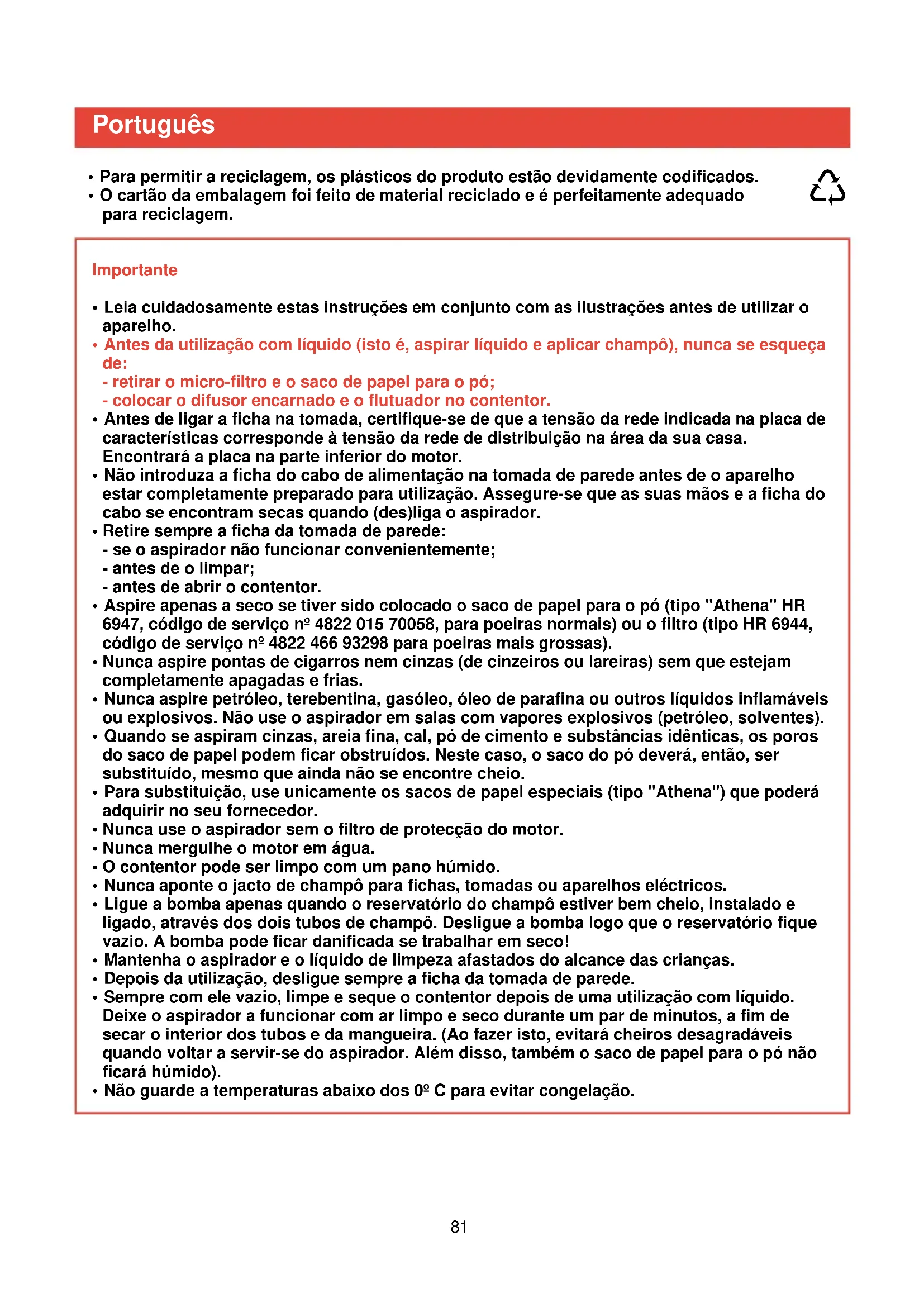 Bocal pequeno com dois colectores (vermelhos) para o cotão (fig. 3). Especialmente apropriado para móveis, cortinados, tapeçarias. Unicamente para uso a seco Bico (fig. 4) para espaços estreitos. Para utilização em seco ou com líquido Bocal convertível para alcatifas e soalhos (unicamente para uso a seco) (fig. 2). Escova saída: soalhos (madeira, cerâmica, pedra, sintéticos). Escova recolhida: soalhos macios (carpetes, tapetes). Contentor. Capacidade: máximo de 17 litros em seco; 10 litros em seco (com saco para o pó "Athena"); 9 litros com líquido (com o flutuador). Motor Saco para o pó (de papel, tipo "Athena", HR 6947). Deve ser colocado para uso a seco e retirado para uso com líquido. Ligação da mangueira Pega Tecla de enrolamento do cabo (carregar) "Micro" filtro (filtro electroestático que retira as partículas pequenas da saída do ar; este filtro deve ser colocado para uso a seco e retirado para uso com líquido) Tubos de sucção (de aço inox, apropriados tanto para uso a seco como com líquido) Controlo mecânico da potência de sucção (rodar) 1 = máximo O = mínimo Suporte do tubo (para arrumar o tubo após a utilização) Grampos (para fixar / soltar o motor) Facilidade de arrumação do bocal pequeno e do bico Cabo de alimentação (puxar) Encaixe do tubo Tecla de ligar/desligar o motor (carregar) Mangueira de sucção (flexível) Utilização a seco83