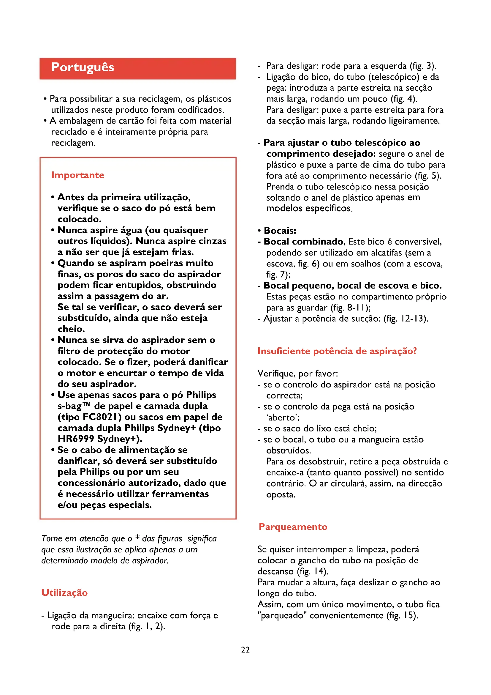 - Se o cabo de alimentação se danificar, só deverá ser substituído pela Philips ou por um seu concessionário autorizado, dado que é necessário utilizar ferramentas e/ou peças especiais. Português Tome em atenção que o * das figuras significa que essa ilustração se aplica apenas a um determinado modelo de aspirador. Utilização - Ligação da mangueira: encaixe com força e rode para a direita (fig. 1, 2).23 Arrumação - Desligue o aspirador. - Retire a ficha da tomada de corrente. - Carregue no pedal do enrolador para recolher o cabo de alimentação (i). - Prenda a parte inferior do tubo ao aspirador (fig. 16-17). Poderá deslizar o gancho ao longo do tubo para lhe mudar a altura. Substituição do saco do lixo Substitua o saco logo que o “indicador de saco cheio” fique encarnado, mesmo que o bocal não esteja assente sobre nenhuma superfície (fig. 18). - Desligue o aspirador. - Abra a cobertura (fig. 19). - Empurre o suporte com o saco do lixo para trás (fig. 20). - Retire o saco do lixo cheio do suporte, puxando a extremidade de cartão (fig. 21). O saco de papel fecha-se automaticamente. - Faça deslizar a placa de cartão do novo saco para os dois encaixes do suporte do saco, o máximo que for possível (fig. 22). - Empurre o suporte com o novo saco para a frente (‘Clique’) (fig. 23). Nota: Se não tiver sido colocado nenhum saco, a cobertura não se fechará.
