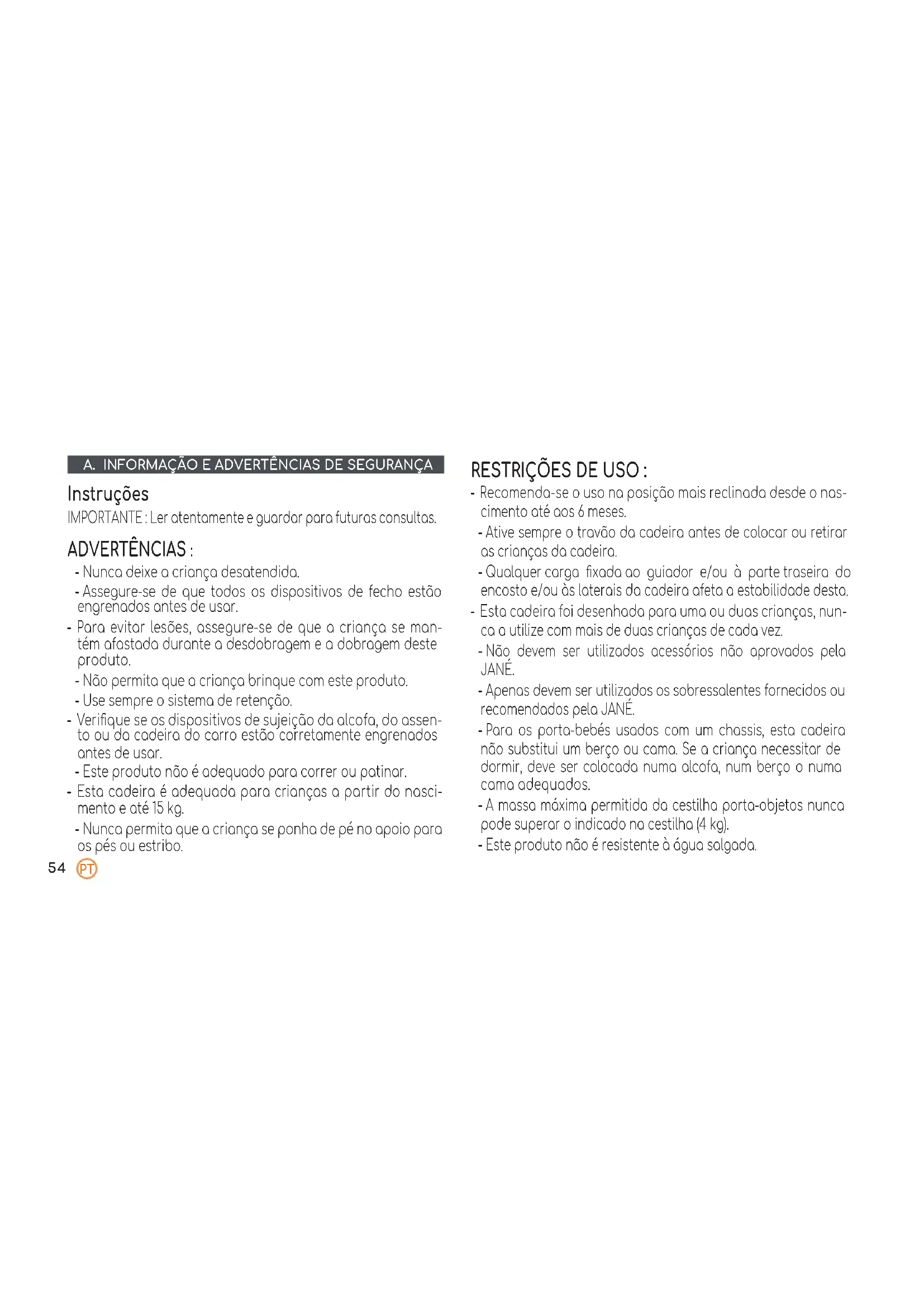 A. INFORMAÇÃO E ADVERTÊNCIAS DE SEGURANÇA Instruções IMPORTANTE : Ler atentamente e guardar para futuras consultas. ADVERTÊNCIAS : - Nunca deixe a criança desatendida. - Assegure-se de que todos os dispositivos de fecho estão engrenados antes de usar. - Para evitar lesões, assegure-se de que a criança se man- tém afastada durante a desdobragem e a dobragem deste produto. - Não permita que a criança brinque com este produto. - Use sempre o sistema de retenção. - Verique se os dispositivos de sujeição da alcofa, do assen- to ou da cadeira do carro estão corretamente engrenados antes de usar. - Este produto não é adequado para correr ou patinar. - Esta cadeira é adequada para crianças a partir do nasci- mento e até 15 kg. - Nunca permita que a criança se ponha de pé no apoio para os pés ou estribo. RESTRIÇÕES DE USO : - Recomenda-se o uso na posição mais reclinada desde o nas- cimento até aos 6 meses. - Ative sempre o travão da cadeira antes de colocar ou retirar as crianças da cadeira. - Qualquer carga xada ao guiador e/ou à parte traseira do encosto e/ou às laterais da cadeira afeta a estabilidade desta. - Esta cadeira foi desenhada para uma ou duas crianças, nun- ca a utilize com mais de duas crianças de cada vez. - Não devem ser utilizados acessórios não aprovados pela JANÉ. - Apenas devem ser utilizados os sobressalentes fornecidos ou recomendados pela JANÉ. - Para os porta-bebés usados com um chassis, esta cadeira não substitui um berço ou cama. Se a criança necessitar de dormir, deve ser colocada numa alcofa, num berço o numa cama adequados. - A massa máxima permitida da cestilha porta-objetos nunca pode superar o indicado na cestilha (4 kg). - Este produto não é resistente à água salgada.55