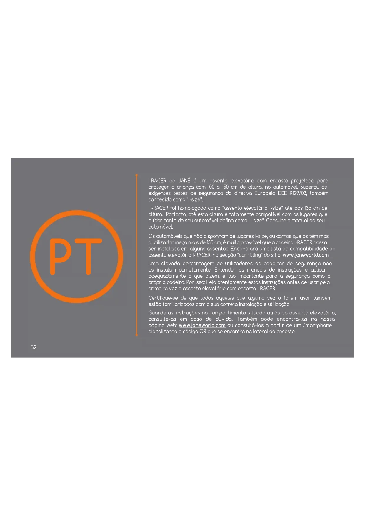 i-RACER da JANÉ é um assento elevatório com encosto projetado para proteger a criança com 100 a 150 cm de altura, no automóvel. Superou os exigentes testes de segurança da diretiva Europeia ECE R129/03, também conhecida como “i-size”. i-RACER foi homologado como “assento elevatório i-size” até aos 135 cm de altura. Portanto, até esta altura é totalmente compatível com os lugares que o fabricante do seu automóvel dena como “i-size”. Consulte o manual do seu automóvel. Os automóveis que não disponham de lugares i-size, ou carros que os têm mas o utilizador meça mais de 135 cm, é muito provável que a cadeira i-RACER possa ser instalada em alguns assentos. Encontrará uma lista de compatibilidade do assento elevatório i-RACER, na secção “car tting” do sítio: www.janeworld.com. Uma elevada percentagem de utilizadores de cadeiras de segurança não as instalam corretamente. Entender os manuais de instruções e aplicar adequadamente o que dizem, é tão importante para a segurança como a própria cadeira. Por isso: Leia atentamente estas instruções antes de usar pela primeira vez o assento elevatório com encosto i-RACER. Certique-se de que todos aqueles que alguma vez o forem usar também estão familiarizados com a sua correta instalação e utilização. Guarde as instruções no compartimento situado atrás do assento elevatório, consulte-as em caso de dúvida. Também pode encontrá-las na nossa página web: www.janeworld.com ou consultá-las a partir de um Smartphone digitalizando o código QR que se encontra na lateral do encosto.53