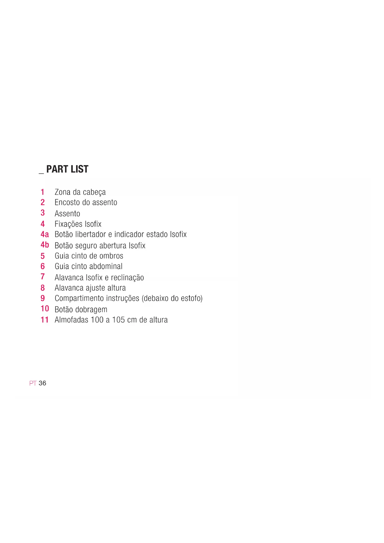 _ PART LIST Zona da cabeça Encosto do assento Assento Fixações Isofix Botão libertador e indicador estado Isofix Botão seguro abertura Isofix Guia cinto de ombros Guia cinto abdominal Alavanca Isofix e reclinação Alavanca ajuste altura Compartimento instruções (debaixo do estofo) Botão dobragem Almofadas 100 a 105 cm de altura