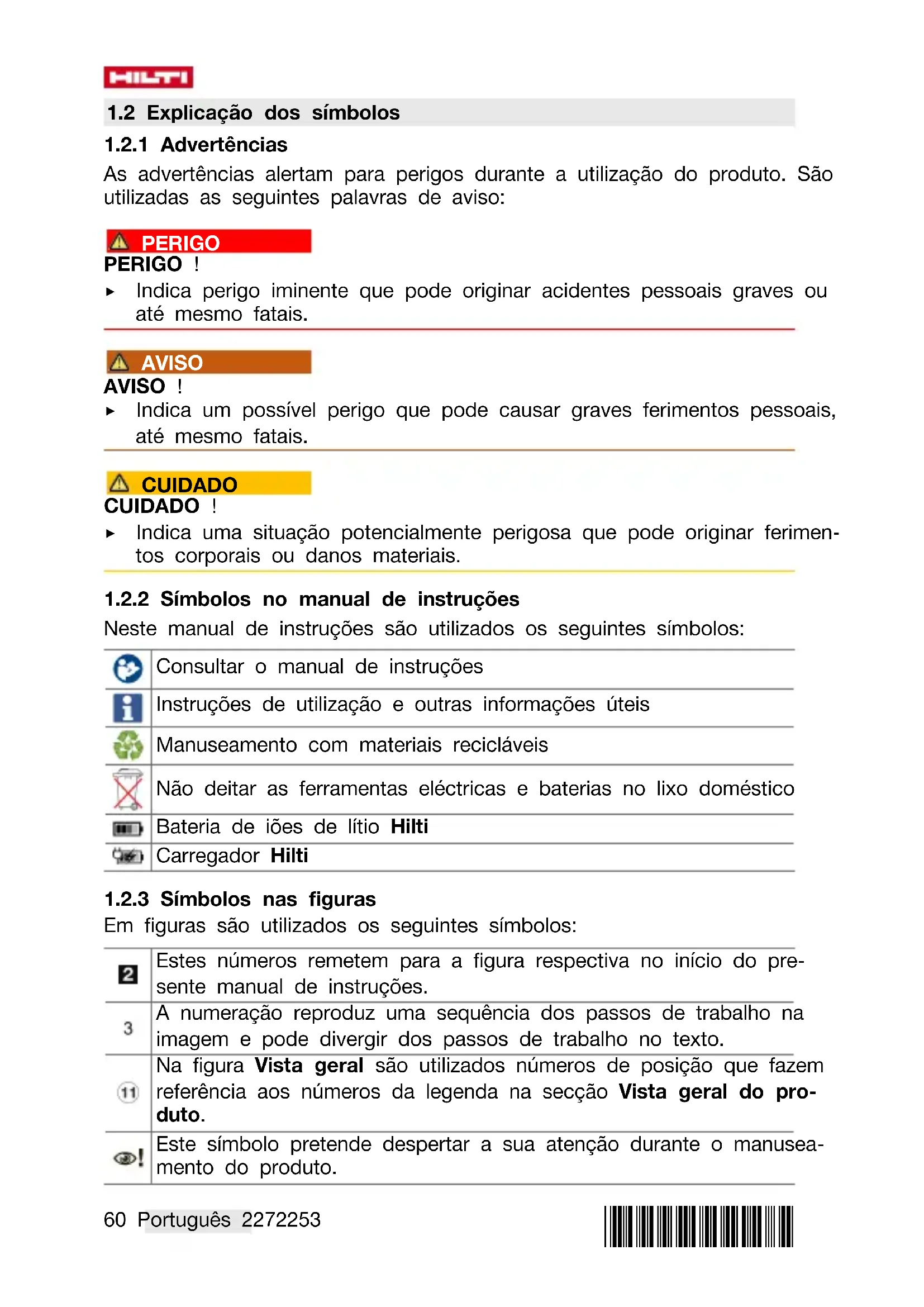 Neste manual de instruções são utilizados os seguintes símbolos: Consultar o manual de instruções Instruções de utilização e outras informações úteis Manuseamento com materiais recicláveis Não deitar as ferramentas eléctricas e baterias no lixo doméstico Bateria de iões de lítio Hilti Carregador Hilti