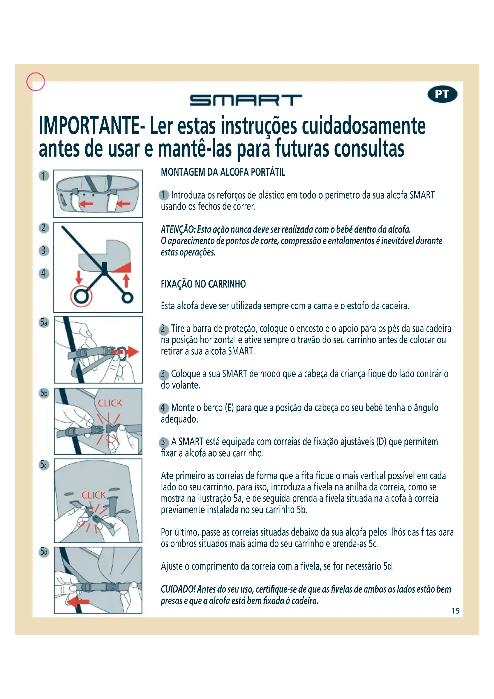 Esta alcofa deve ser utilizada sempre com a cama e o estofo da cadeira. 2 Tire a barra de proteção, coloque o encosto e o apoio para os pés da sua cadeira na posição horizontal e ative sempre o travão do seu carrinho antes de colocar ou retirar a sua alcofa SMART. 3 Coloque a sua SMART de modo que a cabeça da criança fique do lado contrário do volante. 4 Monte o berço (E) para que a posição da cabeça do seu bebé tenha o ângulo adequado. 5 A SMART está equipada com correias de fixação ajustáveis (D) que permitem fixar a alcofa ao seu carrinho. Ate primeiro as correias de forma que a fita fique o mais vertical possível em cada lado do seu carrinho, para isso, introduza a fivela na anilha da correia, como se mostra na ilustração 5a, e de seguida prenda a fivela situada na alcofa à correia previamente instalada no seu carrinho 5b. Por último, passe as correias situadas debaixo da sua alcofa pelos ilhós das fitas para os ombros situados mais acima do seu carrinho e prenda-as 5c. Ajuste o comprimento da correia com a fivela, se for necessário 5d. CUIDADO! Antes do seu uso, certique-se de que as velas de ambos os lados estão bem presas e que a alcofa está bem xada à cadeira. IMPORTANTE- Ler estas instruções cuidadosamente antes de usar e mantê-las para futuras consultas