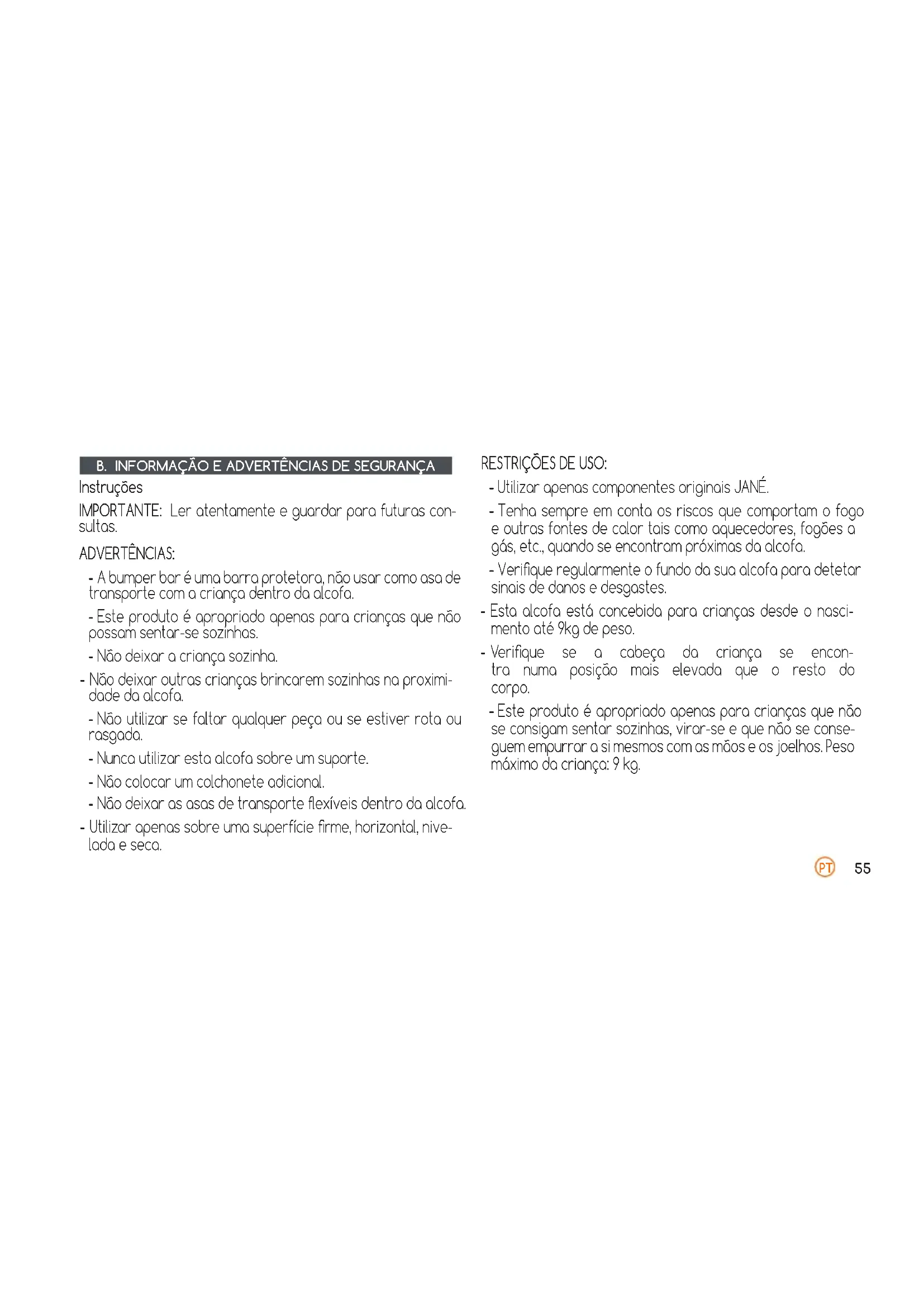 B. INFORMAÇÃO E ADVERTÊNCIAS DE SEGURANÇA Instruções IMPORTANTE: Ler atentamente e guardar para futuras con- sultas. ADVERTÊNCIAS: - A bumper bar é uma barra protetora, não usar como asa de transporte com a criança dentro da alcofa. - Este produto é apropriado apenas para crianças que não possam sentar-se sozinhas. - Não deixar a criança sozinha. - Não deixar outras crianças brincarem sozinhas na proximi- dade da alcofa. - Não utilizar se faltar qualquer peça ou se estiver rota ou rasgada. - Nunca utilizar esta alcofa sobre um suporte. - Não colocar um colchonete adicional. - Não deixar as asas de transporte exíveis dentro da alcofa. - Utilizar apenas sobre uma superfície rme, horizontal, nive- lada e seca. RESTRIÇÕES DE USO: - Utilizar apenas componentes originais JANÉ. - Tenha sempre em conta os riscos que comportam o fogo e outras fontes de calor tais como aquecedores, fogões a gás, etc., quando se encontram próximas da alcofa. - Verique regularmente o fundo da sua alcofa para detetar sinais de danos e desgastes. - Esta alcofa está concebida para crianças desde o nasci- mento até 9kg de peso. - Verique se a cabeça da criança se encon- tra numa posição mais elevada que o resto do corpo. - Este produto é apropriado apenas para crianças que não se consigam sentar sozinhas, virar-se e que não se conse- guem empurrar a si mesmos com as mãos e os joelhos. Peso máximo da criança: 9 kg. IM 1987,04 MICRO BB ins janeworld.indd 55 12/7/21 10:56PT