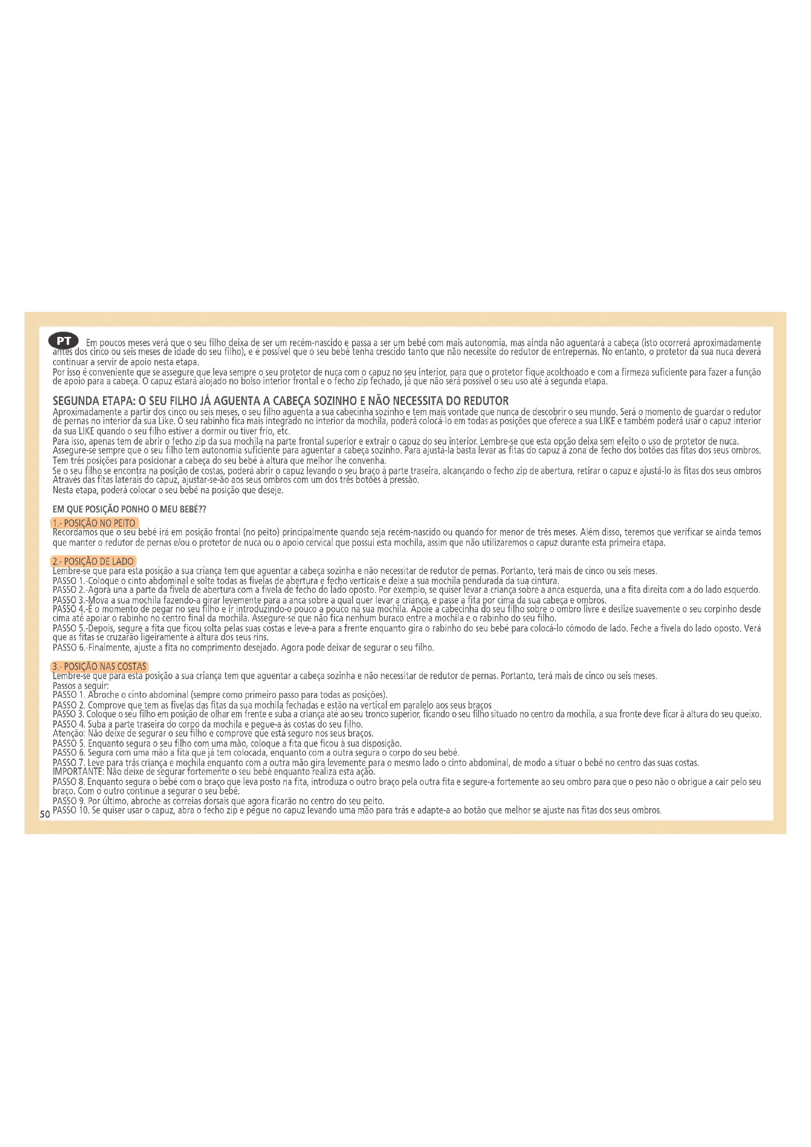 A Like foi desenhada para que possa levar o seu bebé adormecido. A opção do seu capuz extraível a partir do seu bolso frontal ajudá-lo-á a protegê-lo para que continue a dormir comoda- mente, ao mesmo tempo que faz a função de apoio para a cabeça até que o seu filho seja autónomo. AS ETAPAS DO SEU FILHO E A SUA MOCHILA LIKE A SUA PRIMEIRA ETAPA DESDE O NASCIMENTO Desde o seu nascimento, o seu bebé passará por várias etapas até conseguir caminhar por si só. A LIKE ajudá-lo-á com o carregamento em todas as etapas do seu filho até que este caminhe. A LIKE pode ser utilizada como mochila ou como pano porta-bebés. A diferencia baseia-se na idade do bebé. Quando o bebé é recém-nascido e até ter três meses e meio aproximadamente, é conveniente o uso como mochila com a opção do redutor de pernas (Ver página 3 do pormenor dos componentes) devido ao bebé ser muito pequeno e tanto o seu corpo como as suas perninhas devem andar protegidas dentro da mochila. O redutor de pernas evitará que a criança possa cair por alguma das aberturas laterais, ao mesmo tempo que ajudará a proteger o seu corpo, para que fique bem sentado no interior da sua mochila LIKE. A primeira etapa do seu bebé estará condicionada a uma só posição no peito (olhando para si de frente). Fortalecerá os vossos laços ao mesmo tempo que lhe proporcionará a máxima proteção e calor. Nesta primeira etapa, as fitas da sua LIKE jogam um papel muito importante. Poderá levá-las retas na vertical ou cruzadas.47