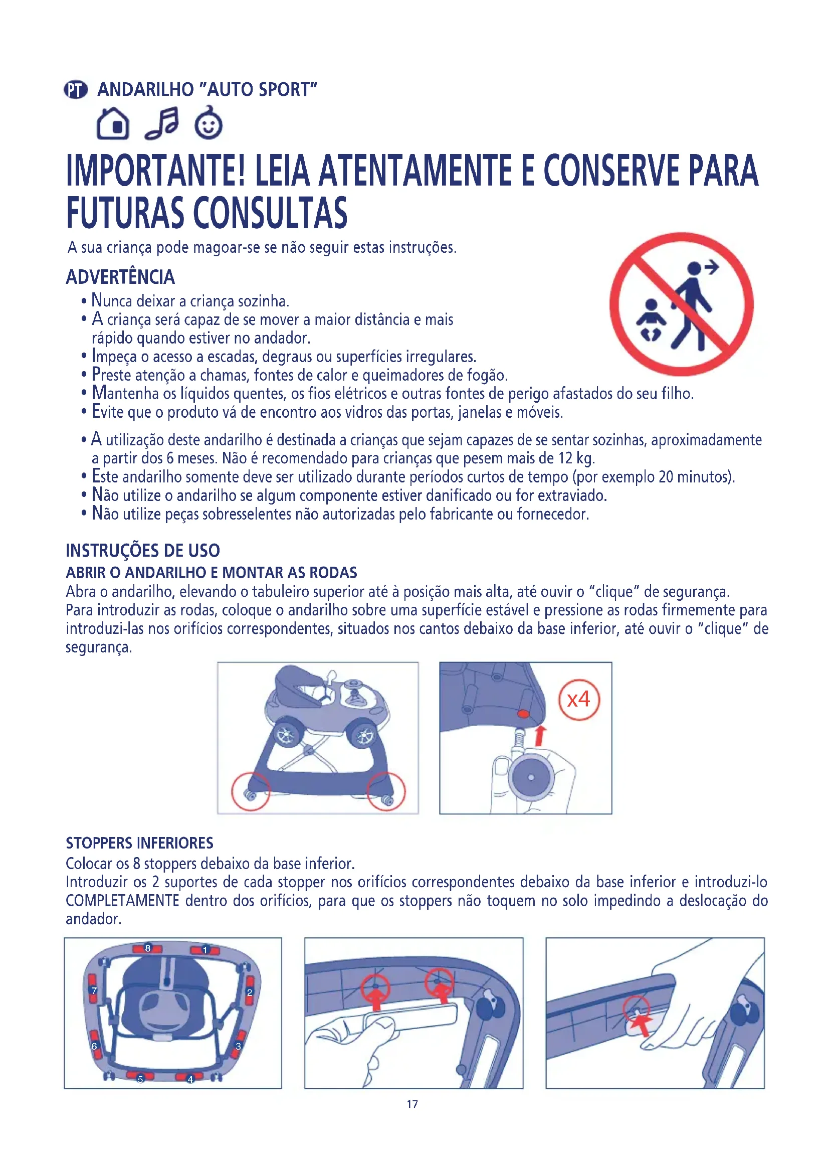 ABRIR O ANDARILHO E MONTAR AS RODAS Abra o andarilho, elevando o tabuleiro superior até à posição mais alta, até ouvir o “clique” de segurança.Para introduzir as rodas, coloque o andarilho sobre uma superfície estável e pressione as rodas firmemente para introduzi-las nos orifícios correspondentes, situados nos cantos debaixo da base inferior, até ouvir o “clique” de segurança.INSTRUÇÕES DE USO STOPPERS INFERIORES Colocar os 8 stoppers debaixo da base inferior.Introduzir os 2 suportes de cada stopper nos orifícios correspondentes debaixo da base inferior e introduzi-lo COMPLETAMENTE dentro dos orifícios, para que os stoppers não toquem no solo impedindo a deslocação do andador.