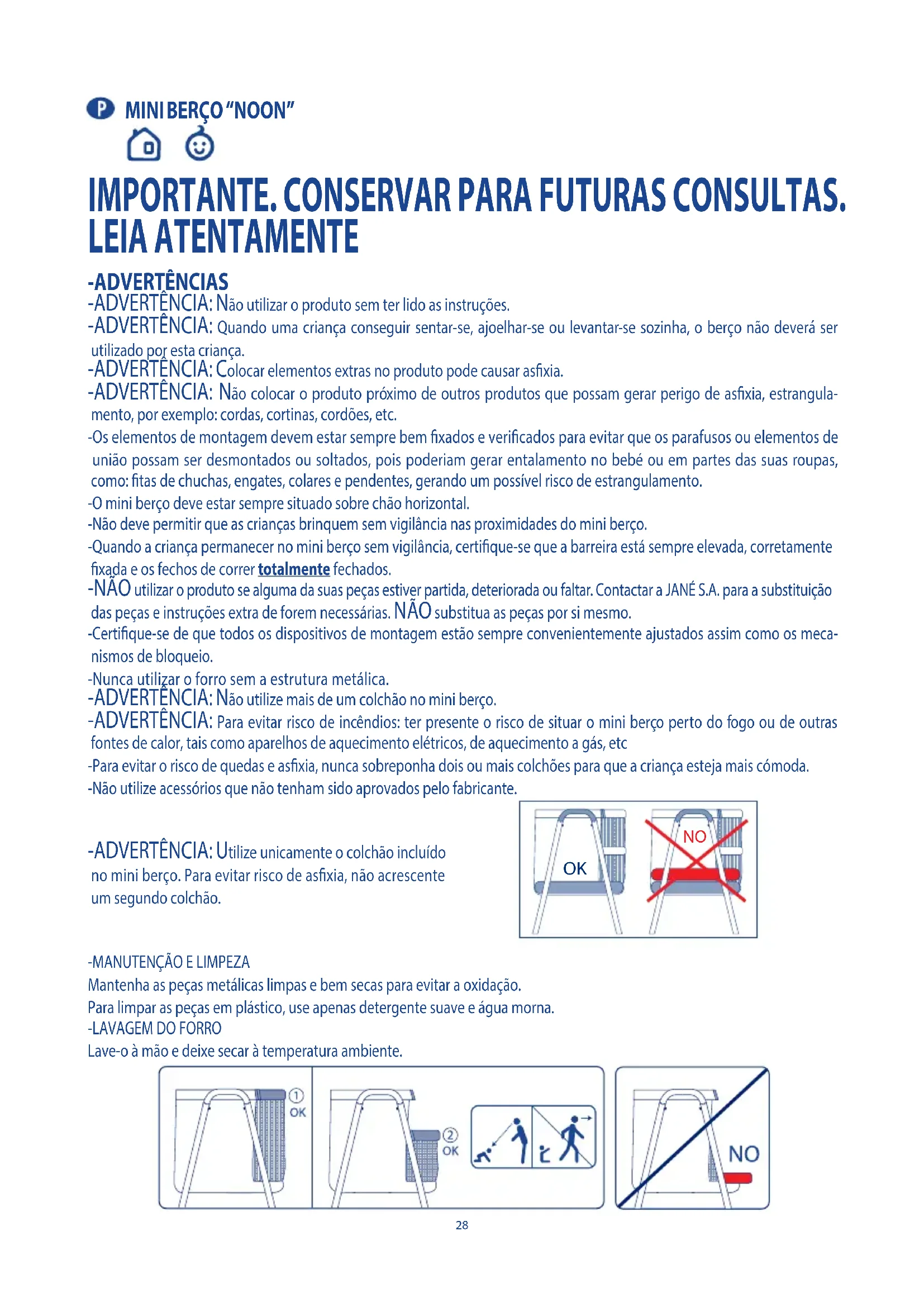 IMPORTANTE. CONSERVAR PARA FUTURAS CONSULTAS. LEIA ATENTAMENTE -ADVERTÊNCIAS -ADVERTÊNCIA: Não utilizar o produto sem ter lido as instruções. -ADVERTÊNCIA: Quando uma criança conseguir sentar-se, ajoelhar-se ou levantar-se sozinha, o berço não deverá ser utilizado por esta criança. -ADVERTÊNCIA: Colocar elementos extras no produto pode causar asxia. -ADVERTÊNCIA: Não colocar o produto próximo de outros produtos que possam gerar perigo de asxia, estrangula- mento, por exemplo: cordas, cortinas, cordões, etc. -Os elementos de montagem devem estar sempre bem xados e vericados para evitar que os parafusos ou elementos de união possam ser desmontados ou soltados, pois poderiam gerar entalamento no bebé ou em partes das suas roupas, como: tas de chuchas, engates, colares e pendentes, gerando um possível risco de estrangulamento. -O mini berço deve estar sempre situado sobre chão horizontal. -Não deve permitir que as crianças brinquem sem vigilância nas proximidades do mini berço. -Quando a criança permanecer no mini berço sem vigilância, certique-se que a barreira está sempre elevada, corretamente xada e os fechos de correr totalmente fechados. -NÃO utilizar o produto se alguma da suas peças estiver partida, deteriorada ou faltar. Contactar a JANÉ S.A. para a substituição das peças e instruções extra de forem necessárias. NÃO substitua as peças por si mesmo. -Certique-se de que todos os dispositivos de montagem estão sempre convenientemente ajustados assim como os meca- nismos de bloqueio. -Nunca utilizar o forro sem a estrutura metálica. -ADVERTÊNCIA: Não utilize mais de um colchão no mini berço. -ADVERTÊNCIA: Para evitar risco de incêndios: ter presente o risco de situar o mini berço perto do fogo ou de outras fontes de calor, tais como aparelhos de aquecimento elétricos, de aquecimento a gás, etc -Para evitar o risco de quedas e asxia, nunca sobreponha dois ou mais colchões para que a criança esteja mais cómoda. -Não utilize acessórios que não tenham sido aprovados pelo fabricante. -ADVERTÊNCIA: Utilize unicamente o colchão incluído no mini berço. Para evitar risco de asxia, não acrescente um segundo colchão.