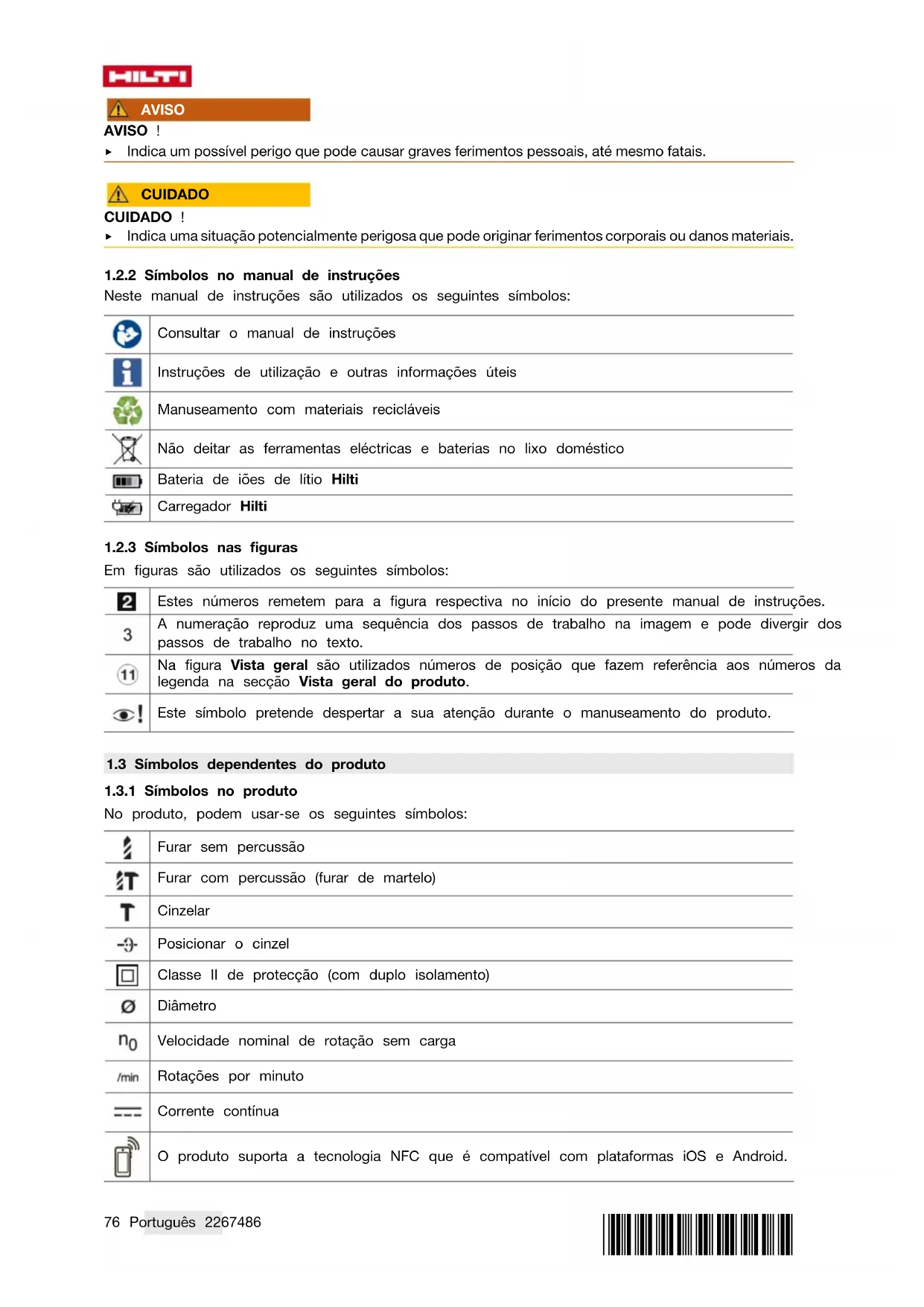 Neste manual de instruções são utilizados os seguintes símbolos: Consultar o manual de instruções Instruções de utilização e outras informações úteis Manuseamento com materiais recicláveis Não deitar as ferramentas eléctricas e baterias no lixo doméstico Bateria de iões de lítio Hilti Carregador Hilti