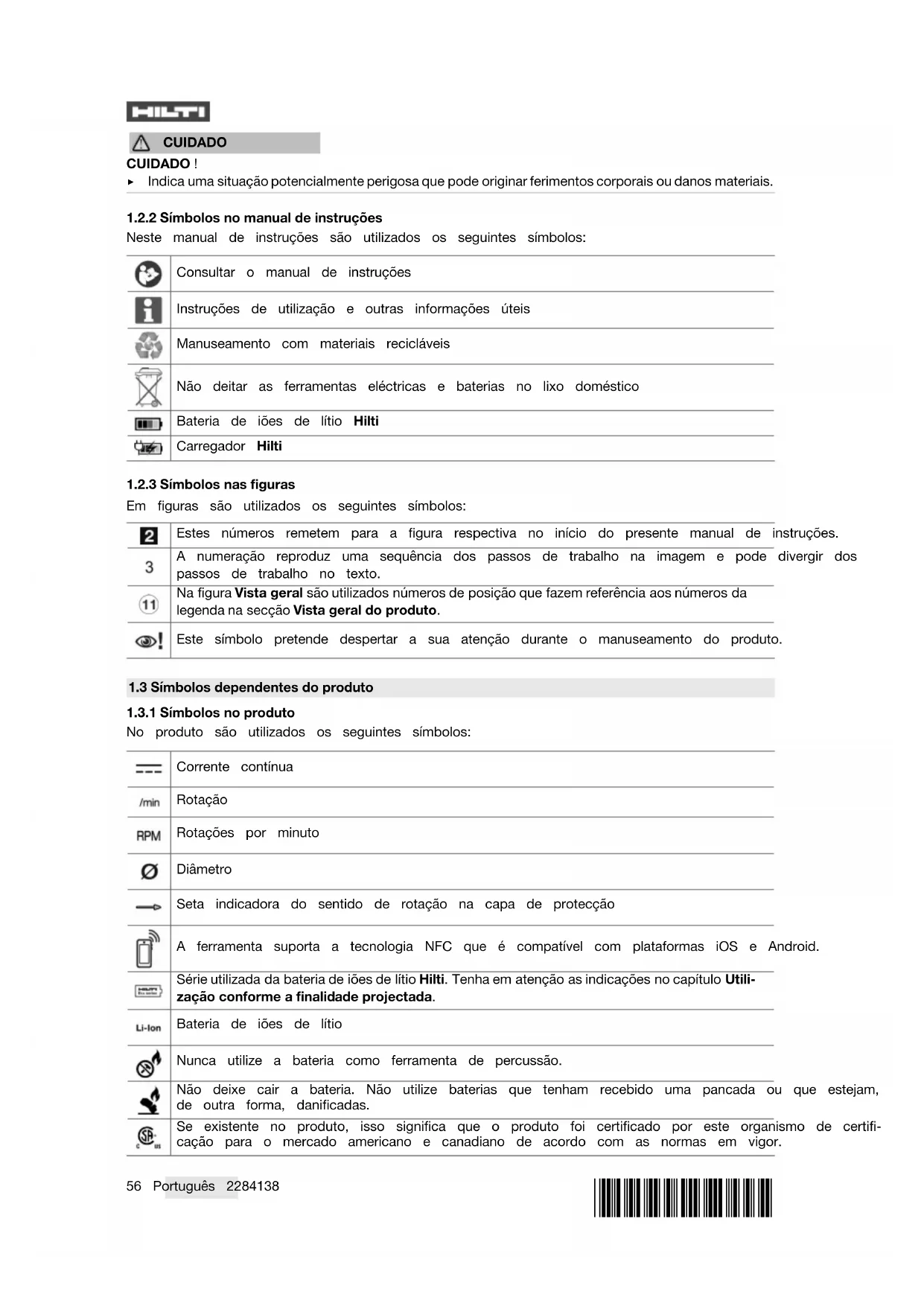 Neste manual de instruções são utilizados os seguintes símbolos: Consultar o manual de instruções Instruções de utilização e outras informações úteis Manuseamento com materiais recicláveis Não deitar as ferramentas eléctricas e baterias no lixo doméstico Bateria de iões de lítio Hilti Carregador Hilti