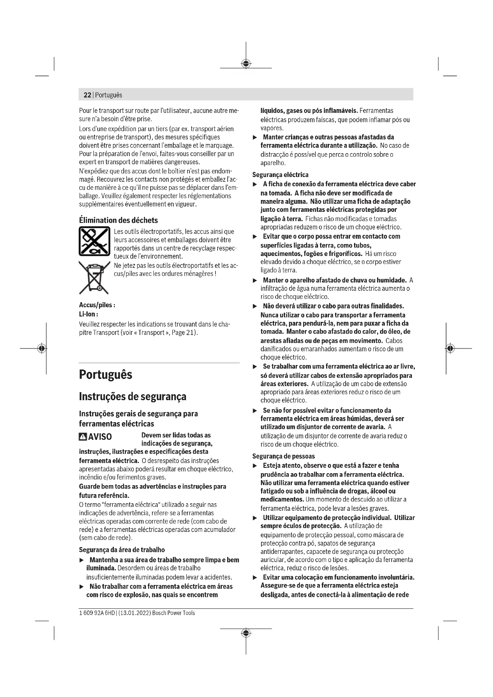 ferencia, incluyendo la que pueda causar su operación no deseada. Português do Brasil Indicações de segurança Instruções gerais de segurança para ferramentas elétricas AVISO Leia todas as indicações de segurança, instruções, ilustrações e especificações fornecidas com esta ferramenta elétrica. O desrespeito das instruções apresentadas abaixo poderá resultar em choque elétrico, incêndio e/ou ferimentos graves. Guarde todas as advertências e instruções para futura referência. O termo "ferramenta elétrica" em todos os avisos listados abaixo referem‑se a ferramenta alimentada através de seu cordão de alimentação ou a ferramenta operada a bateria (sem cordão). Segurança da área de trabalho u Mantenha a área de trabalho limpa e bem iluminada. As áreas de trabalho desarrumadas ou escuras podem levar a acidentes. u Não opere as ferramentas elétricas em atmosferas explosivas, ou seja, na presença de líquidos, gases ou pós inflamáveis. As ferramentas criam faíscas que podem inflamar a poeira ou os vapores. u Mantenha as crianças e outras pessoas afastadas da ferramenta elétrica durante o uso. As distrações podem resultar na perda do controle. Segurança elétrica u Os plugues da ferramenta devem ser compatíveis com as tomadas. Nunca modifique o plugue. Não use plugues de adaptador com ferramentas aterradas. Os plugues sem modificações aliados a utilização de tomadas compatíveis reduzem o risco de choque elétrico. u Evite o contato do corpo com superfícies aterradas, como tubos, aquecedores, fogões e geladeiras. Há um risco elevado de choque elétrico se seu corpo estiver aterrado. Bosch Power Tools 1 609 92A 6HD | (13.01.2022)40 | Português do Brasil u Mantenha as ferramentas elétricas afastadas da chuva ou umidade. A entrada de água em uma ferramenta elétrica aumenta o risco de choque elétrico. u Não use o cabo para outras finalidades. Jamais use o cabo para transportar, puxar ou desconectar a ferramenta elétrica. Mantenha o cabo afastado do calor, do óleo, de arestas afiadas ou de partes móveis. Os cabos danificados ou emaranhados aumentam o risco de um choque elétrico. u Ao operar uma ferramenta elétrica ao ar livre, use um cabo de extensão adequado para áreas exteriores. O uso de um cabo de extensão apropriado para áreas exteriores reduz o risco de choque elétrico. u Se não for possível evitar o funcionamento da ferramenta elétrica em áreas úmidas, utilizar uma alimentação protegida por um dispositivo de corrente diferencial residual (DR). O uso de um DR reduz o risco de um choque elétrico. Segurança pessoal u Fique atento, olhe o que está fazendo e use o bom senso ao operar uma ferramenta. Não use uma ferramenta elétrica quando estiver cansado ou sob a influência de drogas, álcool ou medicamentos. Um momento de desatenção enquanto opera uma ferramenta pode resultar em graves ferimento pessoal. u Use equipamento de proteção individual. Use sempre óculos de proteção. O uso de equipamento de proteção individual, como máscara de proteção contra poeira, sapatos de segurança antiderrapantes, capacete de segurança ou proteção auricular, usado nas condições adequadas irá reduzir o risco de ferimentos pessoais. u Evite a partida não intencional. Assegure‑se de que o interruptor está na posição de desligado antes de conectar o plugue na tomada e/ou bateria, pegar ou carregar a ferramenta. Carregar as ferramentas com o seu dedo no interruptor ou conectar as ferramentas que apresentam interruptor na posição "ligado", são convites a acidentes. u Remova qualquer ferramenta ou chave de ajuste antes de ligar a ferramenta elétrica. Uma ferramenta ou chave ainda ligada a uma parte rotativa da ferramenta elétrica pode resultar em ferimentos pessoais. u Evite uma posição anormal. Mantenha uma posição firme e mantenha sempre o equilíbrio. Desta forma é mais fácil controlar a ferramenta elétrica em situações inesperadas. u Use vestuário apropriado. Não use roupa larga nem joias. Mantenha seus cabelos e roupas afastados de partes móveis. As roupas largas, joias ou cabelos longos podem ser agarrados por partes móveis. u Se for possível montar dispositivos de aspiração ou de coleta, assegure‑se de que são conectados e usados corretamente. O uso de um dispositivo de coleta de poeira pode reduzir os riscos associados a poeiras. u Não deixe que a familiaridade resultante do uso frequente de ferramentas permita que você se torne complacente e ignore os princípios de segurança da ferramenta. Uma ação descuidada pode causar ferimentos graves numa fração de segundo. Uso e manuseio cuidadoso da ferramenta elétrica u Não sobrecarregue a ferramenta elétrica. Use a ferramenta elétrica correta para a sua aplicação. É melhor e mais seguro trabalhar com a ferramenta elétrica apropriada na área de potência para a qual foi projetada. u Não use a ferramenta elétrica se o interruptor estiver defeituoso. Qualquer ferramenta elétrica que não pode mais ser controlada com o interruptor é perigosa e deve ser reparada. u Desconecte o plugue da alimentação e/ou remova a bateria, se removível, da ferramenta elétrica antes de efetuar ajustes, trocar acessórios ou guardar as ferramentas elétricas. Tais medidas de segurança preventivas reduzem o risco de se ligar a ferramenta acidentalmente. u Guarde as ferramentas elétricas não utilizadas fora do alcance das crianças e não permita que as pessoas que não estejam familiarizadas com a ferramenta elétrica ou com essas instruções usem a ferramenta elétrica. As ferramentas elétricas são perigosas nas mãos de usuários não treinados. u Trate as ferramentas elétricas e acessórios com cuidado. Cheque o desalinhamento ou coesão das partes móveis, rachaduras e qualquer outra condição que possa afetar a operação da ferramenta. Se houver danos, repare a ferramenta elétrica antes do uso. Muitos acidentes são causados