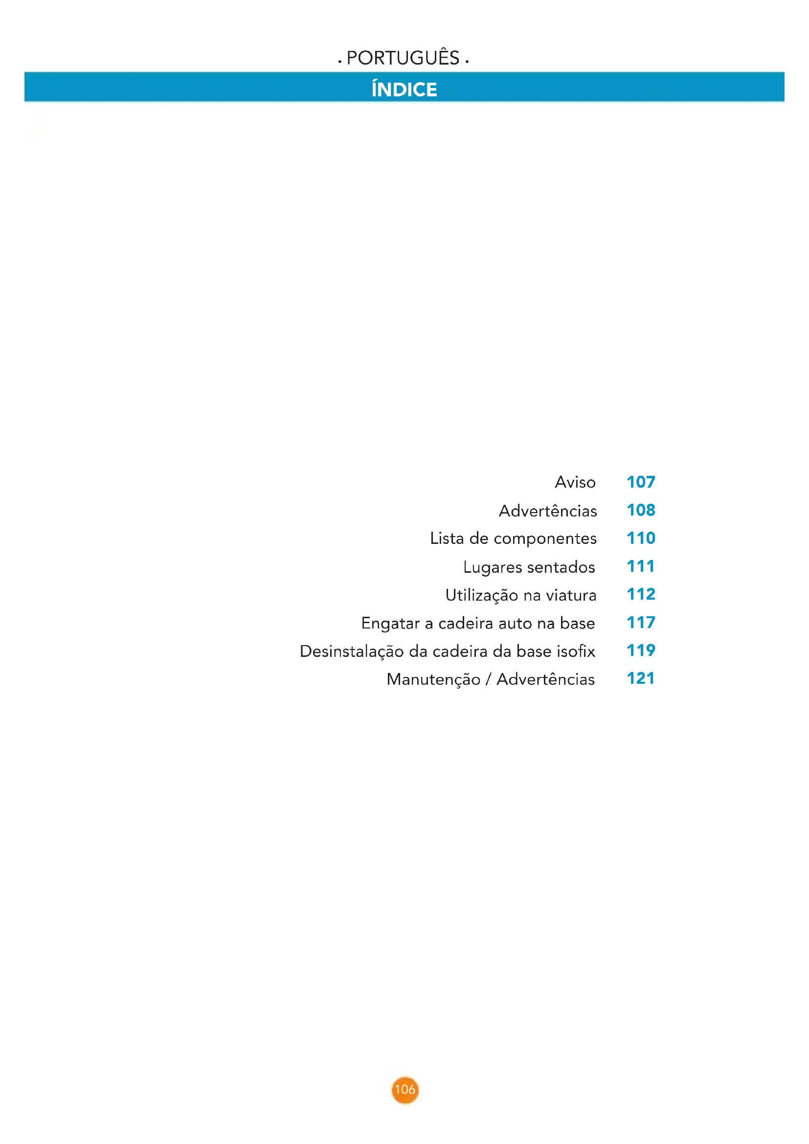 ÍNDICE Aviso Advertências Lista de componentes Lugares sentados Utilização na viatura Engatar a cadeira auto na base Desinstalação da cadeira da base isox Manutenção / Advertências