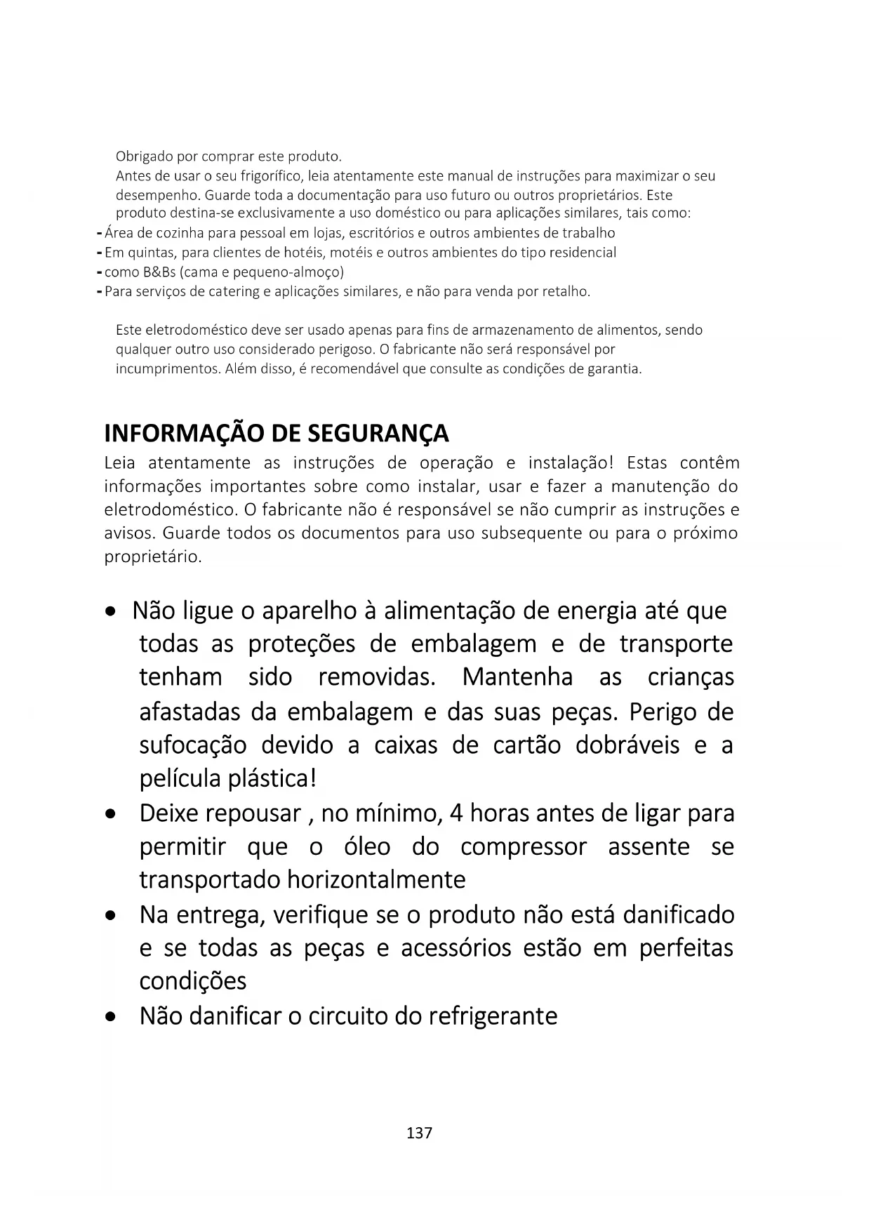 - Inverter a porta do aparelho 37 Obrigado por comprar este produto. Antes de usar o seu frigorífico, leia atentamente este manual de instruções para maximizar o seu desempenho. Guarde toda a documentação para uso futuro ou outros proprietários. Este produto destina-se exclusivamente a uso doméstico ou para aplicações similares, tais como: - Área de cozinha para pessoal em lojas, escritórios e outros ambientes de trabalho - Em quintas, para clientes de hotéis, motéis e outros ambientes do tipo residencial - como B&Bs (cama e pequeno-almoço) - Para serviços de catering e aplicações similares, e não para venda por retalho. Este eletrodoméstico deve ser usado apenas para fins de armazenamento de alimentos, sendo qualquer outro uso considerado perigoso. O fabricante não será responsável por incumprimentos. Além disso, é recomendável que consulte as condições de garantia. p. 1541