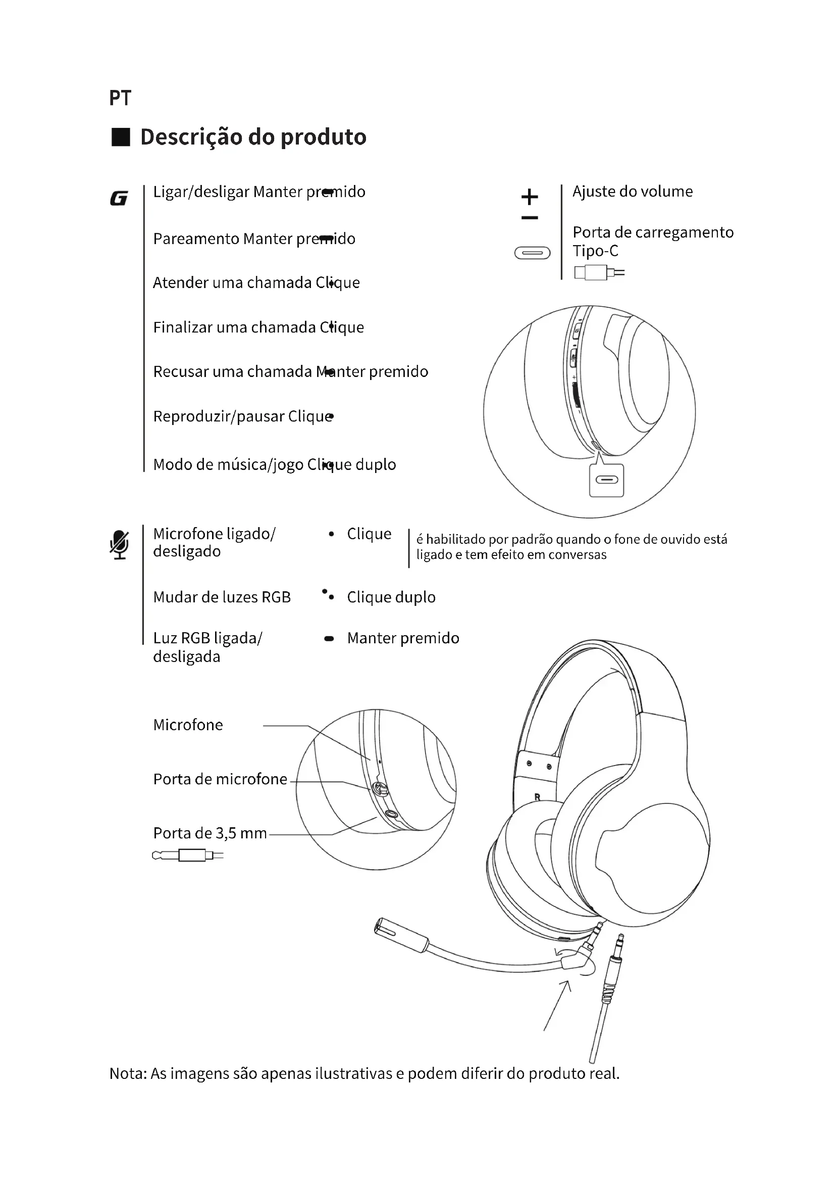 - Quando o fone de ouvido estiver desligado, pressione e segure o botão " " por 10 segundos até que a luz azul pisque seis vezes rapidamente, então as configurações de fábrica foram restauradas.Acessórios do produto Manual do utilizador Cabo de áudio de 3,5mm Cabo de carregamento MicrofoneManutenção