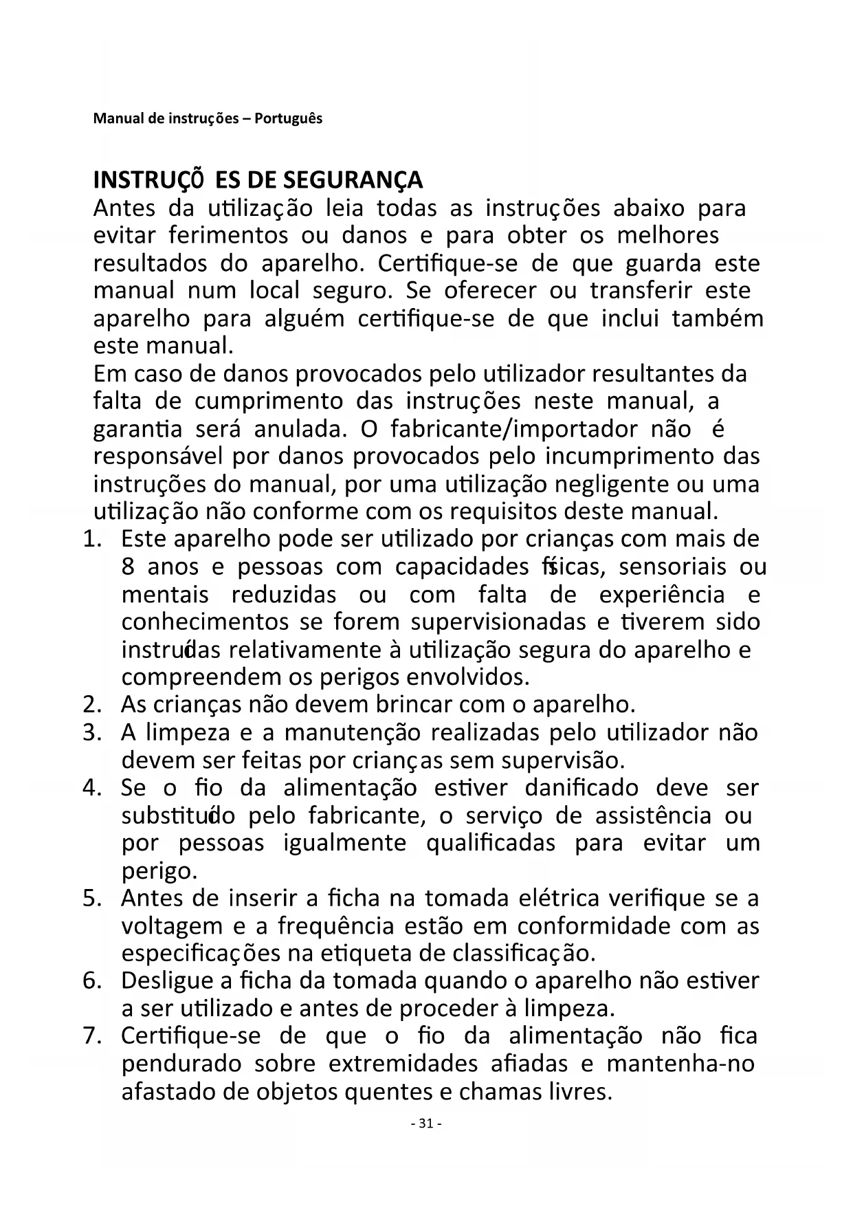 Antes da utilização leia todas as instruções abaixo para evitar ferimentos ou danos e para obter os melhores resultados do aparelho. Certifique-se de que guarda este manual num local seguro. Se oferecer ou transferir este aparelho para alguém certifique-se de que inclui também este manual. Em caso de danos provocados pelo utilizador resultantes da falta de cumprimento das instruções neste manual, a garantia será anulada. O fabricante/importador não é responsável por danos provocados pelo incumprimento das instruções do manual, por uma utilização negligente ou uma utilização não conforme com os requisitos deste manual.