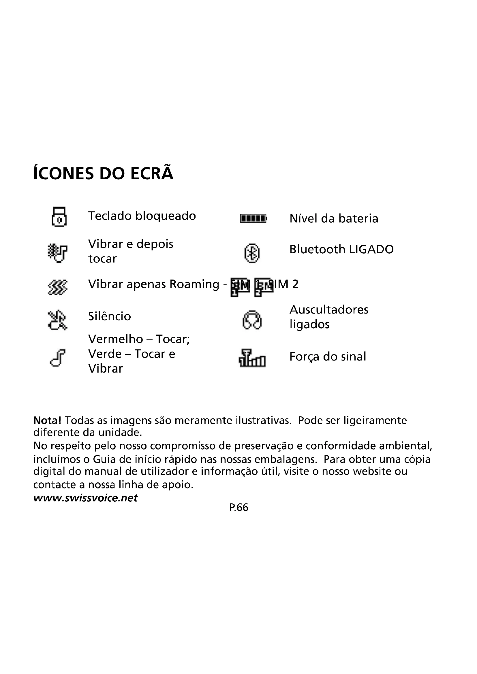 Nota! Todas as imagens são meramente ilustrativas. Pode ser ligeiramente diferente da unidade. No respeito pelo nosso compromisso de preservação e conformidade ambiental, incluímos o Guia de início rápido nas nossas embalagens. Para obter uma cópia digital do manual de utilizador e informação útil, visite o nosso website ou contacte a nossa linha de apoio. www.swissvoice.net Vermelho – Tocar; Verde – Tocar e Vibrar Nível da bateria Vibrar e depois tocar Bluetooth LIGADO Vibrar apenas Roaming - SIM 1, SIM 2 Silêncio Força do sinal Auscultadores ligados Teclado bloqueadoP.67 Começar Instalar o cartão SIM, o cartão de memória e a bateria ATENÇÃO: