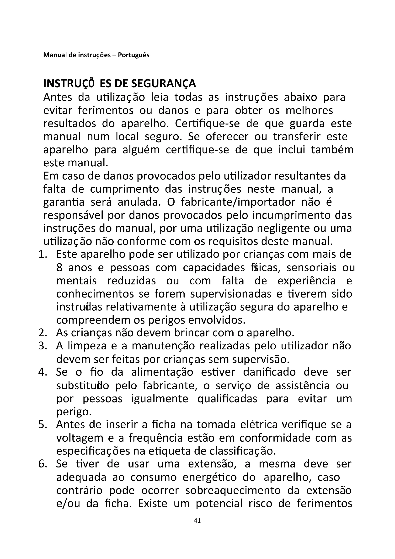 Antes da utilização leia todas as instruções abaixo para evitar ferimentos ou danos e para obter os melhores resultados do aparelho. Certifique-se de que guarda este manual num local seguro. Se oferecer ou transferir este aparelho para alguém certifique-se de que inclui também este manual. Em caso de danos provocados pelo utilizador resultantes da falta de cumprimento das instruções neste manual, a garantia será anulada. O fabricante/importador não é responsável por danos provocados pelo incumprimento das instruções do manual, por uma utilização negligente ou uma utilização não conforme com os requisitos deste manual.