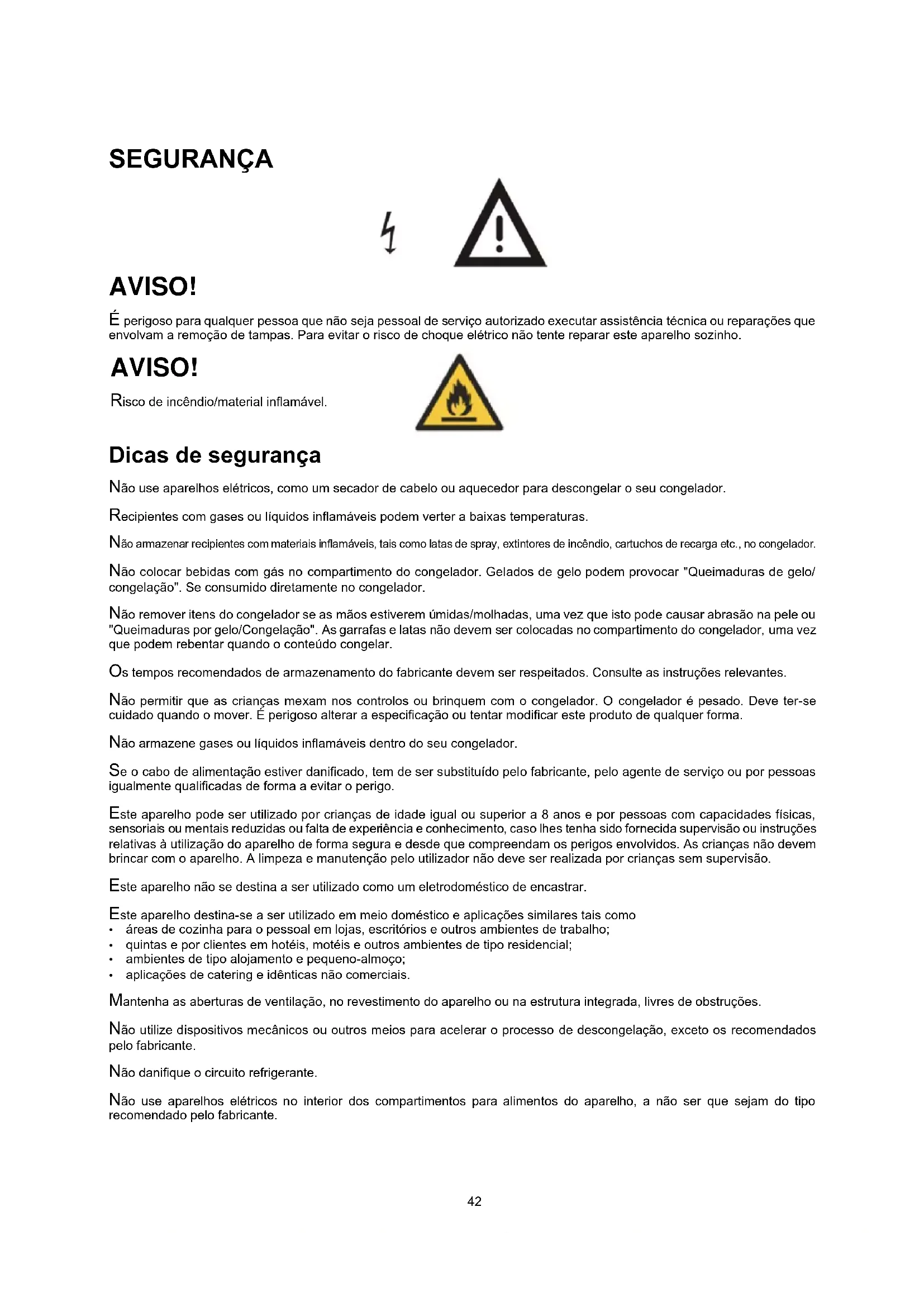 Aviso para descarte........................................................................................................................... 48SEGURANÇA AVISO! É perigoso para qualquer pessoa que não seja pessoal de serviço autorizado executar assistência técnica ou reparações que envolvam a remoção de tampas. Para evitar o risco de choque elétrico não tente reparar este aparelho sozinho. AVISO! Risco de incêndio/material inflamável. Dicas de segurança Não use aparelhos elétricos, como um secador de cabelo ou aquecedor para descongelar o seu congelador. Recipientes com gases ou líquidos inflamáveis podem verter a baixas temperaturas. Não armazenar recipientes com materiais inflamáveis, tais como latas de spray, extintores de incêndio, cartuchos de recarga etc., no congelador. Não colocar bebidas com gás no compartimento do congelador. Gelados de gelo podem provocar "Queimaduras de gelo/ congelação". Se consumido diretamente no congelador. Não remover itens do congelador se as mãos estiverem úmidas/molhadas, uma vez que isto pode causar abrasão na pele ou "Queimaduras por gelo/Congelação". As garrafas e latas não devem ser colocadas no compartimento do congelador, uma vez que podem rebentar quando o conteúdo congelar. Os tempos recomendados de armazenamento do fabricante devem ser respeitados. Consulte as instruções relevantes. Não permitir que as crianças mexam nos controlos ou brinquem com o congelador. O congelador é pesado. Deve ter-se cuidado quando o mover. É perigoso alterar a especificação ou tentar modificar este produto de qualquer forma. Não armazene gases ou líquidos inflamáveis dentro do seu congelador. Se o cabo de alimentação estiver danificado, tem de ser substituído pelo fabricante, pelo agente de serviço ou por pessoas igualmente qualificadas de forma a evitar o perigo. Este aparelho pode ser utilizado por crianças de idade igual ou superior a 8 anos e por pessoas com capacidades físicas, sensoriais ou mentais reduzidas ou falta de experiência e conhecimento, caso lhes tenha sido fornecida supervisão ou instruções relativas à utilização do aparelho de forma segura e desde que compreendam os perigos envolvidos. As crianças não devem brincar com o aparelho. A limpeza e manutenção pelo utilizador não deve ser realizada por crianças sem supervisão. Este aparelho não se destina a ser utilizado como um eletrodoméstico de encastrar. Este aparelho destina-se a ser utilizado em meio doméstico e aplicações similares tais como