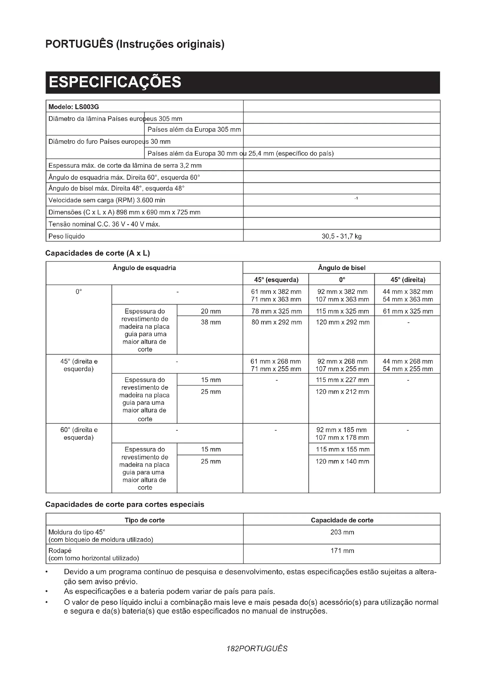 Dimensões (C x L x A) 898 mm x 690 mm x 725 mm Tensão nominal C.C. 36 V - 40 V máx. Peso líquido 30,5 - 31,7 kg Capacidades de corte (A x L) Ângulo de esquadria Ângulo de bisel 45° (esquerda) 0° 45° (direita) 0° - 61 mm x 382 mm 71 mm x 363 mm 92 mm x 382 mm 107 mm x 363 mm 44 mm x 382 mm 54 mm x 363 mm Espessura do revestimento de madeira na placa guia para uma maior altura de corte 20 mm 78 mm x 325 mm 115 mm x 325 mm 61 mm x 325 mm 38 mm 80 mm x 292 mm 120 mm x 292 mm - 45° (direita e esquerda) - 61 mm x 268 mm 71 mm x 255 mm 92 mm x 268 mm 107 mm x 255 mm 44 mm x 268 mm 54 mm x 255 mm Espessura do revestimento de madeira na placa guia para uma maior altura de corte 15 mm - 115 mm x 227 mm - 25 mm 120 mm x 212 mm 60° (direita e esquerda) - - 92 mm x 185 mm 107 mm x 178 mm