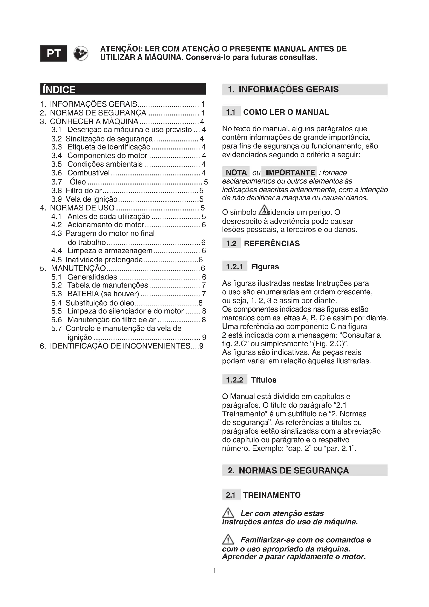 Ler com atenção estas instruções antes do uso da máquina. Familiarizar-se com os comandos e com o uso apropriado da máquina. Aprender a parar rapidamente o motor. ATENÇÃO!: LER COM ATENÇÃO O PRESENTE MANUAL ANTES DE UTILIZAR A MÁQUINA. Conservá-lo para futuras consultas.