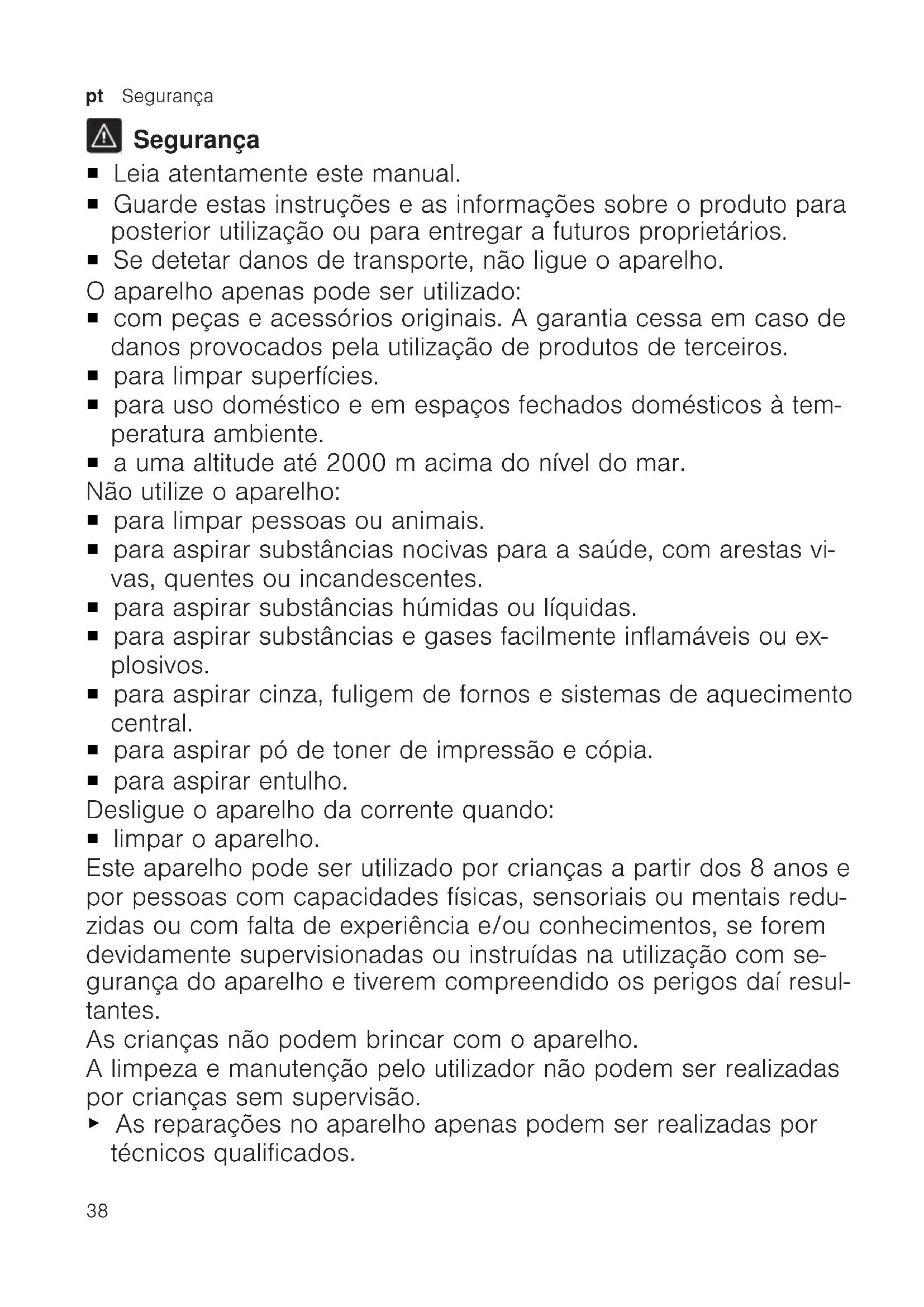 Segurança ¡ Leia atentamente este manual. ¡ Guarde estas instruções e as informações sobre o produto para posterior utilização ou para entregar a futuros proprietários. ¡ Se detetar danos de transporte, não ligue o aparelho. O aparelho apenas pode ser utilizado: ¡ com peças e acessórios originais. A garantia cessa em caso de danos provocados pela utilização de produtos de terceiros. ¡ para limpar superfícies. ¡ para uso doméstico e em espaços fechados domésticos à tem- peratura ambiente. ¡ a uma altitude até 2000m acima do nível do mar. Não utilize o aparelho: ¡ para limpar pessoas ou animais. ¡ para aspirar substâncias nocivas para a saúde, com arestas vi- vas, quentes ou incandescentes. ¡ para aspirar substâncias húmidas ou líquidas. ¡ para aspirar substâncias e gases facilmente inflamáveis ou ex- plosivos. ¡ para aspirar cinza, fuligem de fornos e sistemas de aquecimento central. ¡ para aspirar pó de toner de impressão e cópia. ¡ para aspirar entulho. Desligue o aparelho da corrente quando: ¡ limpar o aparelho. Este aparelho pode ser utilizado por crianças a partir dos 8 anos e por pessoas com capacidades físicas, sensoriais ou mentais redu- zidas ou com falta de experiência e/ou conhecimentos, se forem devidamente supervisionadas ou instruídas na utilização com se- gurança do aparelho e tiverem compreendido os perigos daí resul- tantes. As crianças não podem brincar com o aparelho. A limpeza e manutenção pelo utilizador não podem ser realizadas por crianças sem supervisão. ▶ As reparações no aparelho apenas podem ser realizadas por técnicos qualificados.Segurança pt