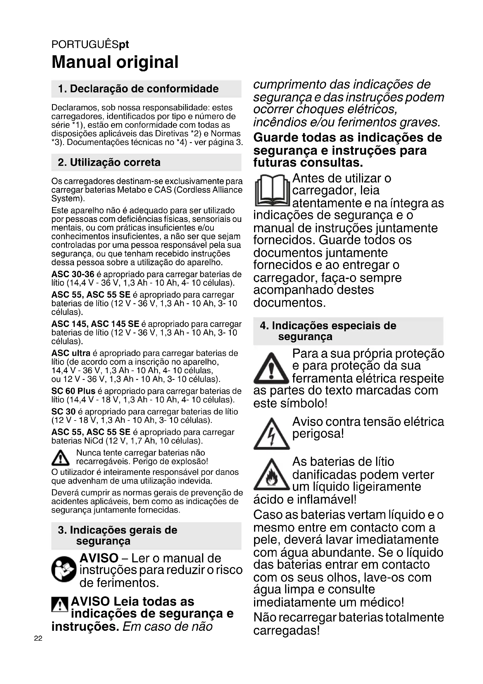 Manual original Declaramos, sob nossa responsabilidade: estes carregadores, identificados por tipo e número de série *1), estão em conformidade com todas as disposições aplicáveis das Diretivas *2) e Normas *3). Documentações técnicas no *4) - ver página 3. Os carregadores destinam-se exclusivamente para carregar baterias Metabo e CAS (Cordless Alliance System). Este aparelho não é adequado para ser utilizado por pessoas com deficiências físicas, sensoriais ou mentais, ou com práticas insuficientes e/ou conhecimentos insuficientes, a não ser que sejam controladas por uma pessoa responsável pela sua segurança, ou que tenham recebido instruções dessa pessoa sobre a utilização do aparelho. ASC 30-36 é apropriado para carregar baterias de lítio (14,4 V - 36 V, 1,3 Ah - 10 Ah, 4- 10 células). ASC 55, ASC 55 SE é apropriado para carregar baterias de lítio (12 V - 36 V, 1,3 Ah - 10 Ah, 3- 10 células). ASC 145, ASC 145 SE é apropriado para carregar baterias de lítio (12 V - 36 V, 1,3 Ah - 10 Ah, 3- 10 células). ASC ultra é apropriado para carregar baterias de lítio (de acordo com a inscrição no aparelho, 14,4 V - 36 V, 1,3 Ah - 10 Ah, 4- 10 células, ou 12 V - 36 V, 1,3 Ah - 10 Ah, 3- 10 células). SC 60 Plus é apropriado para carregar baterias de lítio (14,4 V - 18 V, 1,3 Ah - 10 Ah, 4- 10 células). SC 30 é apropriado para carregar baterias de lítio (12 V - 18 V, 1,3 Ah - 10 Ah, 3- 10 células). ASC 55, ASC 55 SE é apropriado para carregar baterias NiCd (12 V, 1,7 Ah, 10 células). Nunca tente carregar baterias não recarregáveis. Perigo de explosão! O utilizador é inteiramente responsável por danos que advenham de uma utilização indevida. Deverá cumprir as normas gerais de prevenção de acidentes aplicáveis, bem como as indicações de segurança juntamente fornecidas. AVISO – Ler o manual de instruções para reduzir o risco de ferimentos. AVISO Leia todas as indicações de segurança e instruções. Em caso de não cumprimento das indicações de segurança e das instruções podem ocorrer choques elétricos, incêndios e/ou ferimentos graves. Guarde todas as indicações de segurança e instruções para futuras consultas. Antes de utilizar o carregador, leia atentamente e na íntegra as indicações de segurança e o manual de instruções juntamente fornecidos. Guarde todos os documentos juntamente fornecidos e ao entregar o carregador, faça-o sempre acompanhado destes documentos. Para a sua própria proteção e para proteção da sua ferramenta elétrica respeite as partes do texto marcadas com este símbolo! Aviso contra tensão elétrica perigosa! As baterias de lítio danificadas podem verter um líquido ligeiramente ácido e inflamável! Caso as baterias vertam líquido e o mesmo entre em contacto com a pele, deverá lavar imediatamente com água abundante. Se o líquido das baterias entrar em contacto com os seus olhos, lave-os com água limpa e consulte imediatamente um médico! Não recarregar baterias totalmente carregadas!