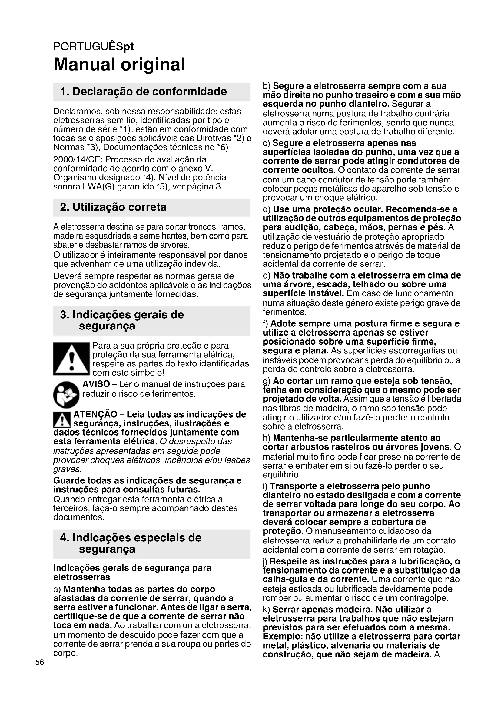 Manual original Declaramos, sob nossa responsabilidade: estas eletrosserras sem fio, identificadas por tipo e número de série *1), estão em conformidade com todas as disposições aplicáveis das Diretivas *2) e Normas *3), Documentações técnicas no *6) 2000/14/CE: Processo de avaliação da conformidade de acordo com o anexo V. Organismo designado *4). Nível de potência sonora LWA(G) garantido *5), ver página 3. A eletrosserra destina-se para cortar troncos, ramos, madeira esquadriada e semelhantes, bem como para abater e desbastar ramos de árvores. O utilizador é inteiramente responsável por danos que advenham de uma utilização indevida. Deverá sempre respeitar as normas gerais de prevenção de acidentes aplicáveis e as indicações de segurança juntamente fornecidas. Para a sua própria proteção e para proteção da sua ferramenta elétrica, respeite as partes do texto identificadas com este símbolo! AVISO – Ler o manual de instruções para reduzir o risco de ferimentos. ATENÇÃO – Leia todas as indicações de segurança, instruções, ilustrações e dados técnicos fornecidos juntamente com esta ferramenta elétrica. O desrespeito das instruções apresentadas em seguida pode provocar choques elétricos, incêndios e/ou lesões graves. Guarde todas as indicações de segurança e instruções para consultas futuras. Quando entregar esta ferramenta elétrica a terceiros, faça-o sempre acompanhado destes documentos. Indicações gerais de segurança para eletrosserras a) Mantenha todas as partes do corpo afastadas da corrente de serrar, quando a serra estiver a funcionar. Antes de ligar a serra, certifique-se de que a corrente de serrar não toca em nada. Ao trabalhar com uma eletrosserra, um momento de descuido pode fazer com que a corrente de serrar prenda a sua roupa ou partes do corpo. b) Segure a eletrosserra sempre com a sua mão direita no punho traseiro e com a sua mão esquerda no punho dianteiro. Segurar a eletrosserra numa postura de trabalho contrária aumenta o risco de ferimentos, sendo que nunca deverá adotar uma postura de trabalho diferente. c) Segure a eletrosserra apenas nas superfícies isoladas do punho, uma vez que a corrente de serrar pode atingir condutores de corrente ocultos. O contato da corrente de serrar com um cabo condutor de tensão pode também colocar peças metálicas do aparelho sob tensão e provocar um choque elétrico. d) Use uma proteção ocular. Recomenda-se a utilização de outros equipamentos de proteção para audição, cabeça, mãos, pernas e pés. A utilização de vestuário de proteção apropriado reduz o perigo de ferimentos através de material de tensionamento projetado e o perigo de toque acidental da corrente de serrar. e) Não trabalhe com a eletrosserra em cima de uma árvore, escada, telhado ou sobre uma superfície instável. Em caso de funcionamento numa situação deste género existe perigo grave de ferimentos. f) Adote sempre uma postura firme e segura e utilize a eletrosserra apenas se estiver posicionado sobre uma superfície firme, segura e plana. As superfícies escorregadias ou instáveis podem provocar a perda do equilíbrio ou a perda do controlo sobre a eletrosserra. g) Ao cortar um ramo que esteja sob tensão, tenha em consideração que o mesmo pode ser projetado de volta. Assim que a tensão é libertada nas fibras de madeira, o ramo sob tensão pode atingir o utilizador e/ou fazê-lo perder o controlo sobre a eletrosserra. h) Mantenha-se particularmente atento ao cortar arbustos rasteiros ou árvores jovens. O material muito fino pode ficar preso na corrente de serrar e embater em si ou fazê-lo perder o seu equilíbrio.