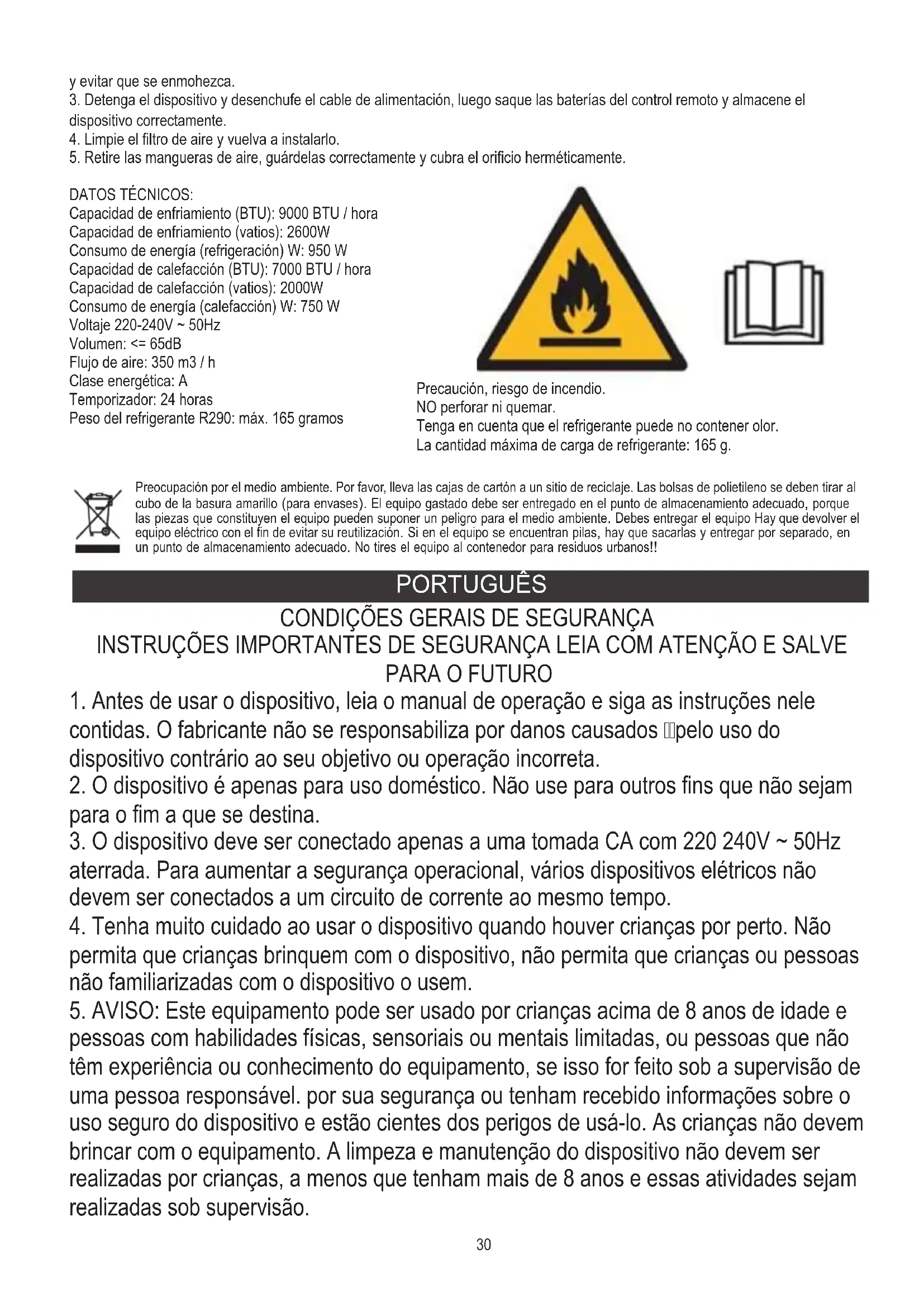 DADOS TÉCNICOS: Capacidade de refrigeração (BTU): 9.000 BTU / hora Capacidade de refrigeração (watts): 2600W Consumo de energia (resfriamento) W: 950 W Capacidade de aquecimento (BTU): 7000 BTU / hora Capacidade de aquecimento (watts): 2.000 W Consumo de energia (aquecimento) W: 750 W Tensão 220-240V ~ 50Hz Volume: <= 65dB Fluxo de ar: 350 m3 / h Classe energética: A Cronômetro: 24 horas Peso do refrigerante R290: máx. 165 gramas Protecção do meio ambiente. Rogamos, os embalagens de cartão destinem-se para papéis velhos. Os sacos de polietileno (PE) devem-se colocar em contenedores para material plástico. O dispositivo usado deve-se levar a um ponto de armazenamento adequado porque os componentes perigosos que ficam dentro do dispositivo podem ser perigosos para o meio ambiente. O dispositivo elétrico deve-se entregar de modo que se reduza a sua nova utilização e uso. Se no dispositivo há pilhas, devem-se tirar e levar a um ponto de armazenamento em separado. Não colocar o dispositivo em contenedores para resíduos municipais!! Cuidado, risco de incêndio. NÃO fure ou queime. Esteja ciente de que o refrigerante pode não conter odor. A quantidade máxima de carga de refrigerante: 165g.37 LIETUVIŲ