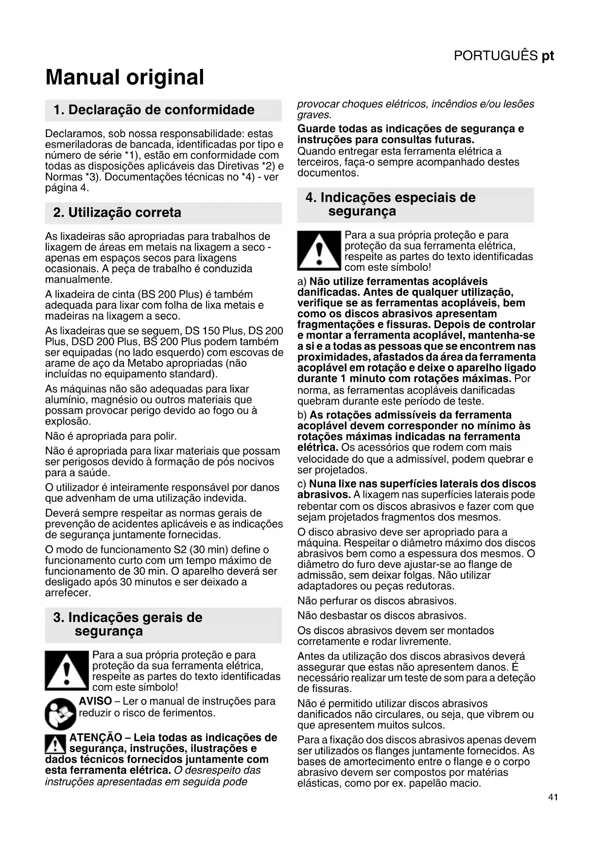 Manual original Declaramos, sob nossa responsabilidade: estas esmeriladoras de bancada, identificadas por tipo e número de série *1), estão em conformidade com todas as disposições aplicáveis das Diretivas *2) e Normas *3). Documentações técnicas no *4) - ver página 4. As lixadeiras são apropriadas para trabalhos de lixagem de áreas em metais na lixagem a seco - apenas em espaços secos para lixagens ocasionais. A peça de trabalho é conduzida manualmente. A lixadeira de cinta (BS 200 Plus) é também adequada para lixar com folha de lixa metais e madeiras na lixagem a seco. As lixadeiras que se seguem, DS 150 Plus, DS 200 Plus, DSD 200 Plus, BS 200 Plus podem também ser equipadas (no lado esquerdo) com escovas de arame de aço da Metabo apropriadas (não incluídas no equipamento standard). As máquinas não são adequadas para lixar alumínio, magnésio ou outros materiais que possam provocar perigo devido ao fogo ou à explosão. Não é apropriada para polir. Não é apropriada para lixar materiais que possam ser perigosos devido à formação de pós nocivos para a saúde. O utilizador é inteiramente responsável por danos que advenham de uma utilização indevida. Deverá sempre respeitar as normas gerais de prevenção de acidentes aplicáveis e as indicações de segurança juntamente fornecidas. O modo de funcionamento S2 (30 min) define o funcionamento curto com um tempo máximo de funcionamento de 30 min. O aparelho deverá ser desligado após 30 minutos e ser deixado a arrefecer. Para a sua própria proteção e para proteção da sua ferramenta elétrica, respeite as partes do texto identificadas com este símbolo! AVISO – Ler o manual de instruções para reduzir o risco de ferimentos. ATENÇÃO – Leia todas as indicações de segurança, instruções, ilustrações e dados técnicos fornecidos juntamente com esta ferramenta elétrica. O desrespeito das instruções apresentadas em seguida pode provocar choques elétricos, incêndios e/ou lesões graves. Guarde todas as indicações de segurança e instruções para consultas futuras. Quando entregar esta ferramenta elétrica a terceiros, faça-o sempre acompanhado destes documentos. Para a sua própria proteção e para proteção da sua ferramenta elétrica, respeite as partes do texto identificadas com este símbolo! a) Não utilize ferramentas acopláveis danificadas. Antes de qualquer utilização, verifique se as ferramentas acopláveis, bem como os discos abrasivos apresentam fragmentações e fissuras. Depois de controlar e montar a ferramenta acoplável, mantenha-se a si e a todas as pessoas que se encontrem nas proximidades, afastados da área da ferramenta acoplável em rotação e deixe o aparelho ligado durante 1 minuto com rotações máximas. Por norma, as ferramentas acopláveis danificadas quebram durante este período de teste. b) As rotações admissíveis da ferramenta acoplável devem corresponder no mínimo às rotações máximas indicadas na ferramenta elétrica. Os acessórios que rodem com mais velocidade do que a admissível, podem quebrar e ser projetados. c) Nuna lixe nas superfícies laterais dos discos abrasivos. A lixagem nas superfícies laterais pode rebentar com os discos abrasivos e fazer com que sejam projetados fragmentos dos mesmos. O disco abrasivo deve ser apropriado para a máquina. Respeitar o diâmetro máximo dos discos abrasivos bem como a espessura dos mesmos. O diâmetro do furo deve ajustar-se ao flange de admissão, sem deixar folgas. Não utilizar adaptadores ou peças redutoras. Não perfurar os discos abrasivos. Não desbastar os discos abrasivos. Os discos abrasivos devem ser montados corretamente e rodar livremente. Antes da utilização dos discos abrasivos deverá assegurar que estas não apresentem danos. É necessário realizar um teste de som para a deteção de fissuras. Não é permitido utilizar discos abrasivos danificados não circulares, ou seja, que vibrem ou que apresentem muitos sulcos. Para a fixação dos discos abrasivos apenas devem ser utilizados os flanges juntamente fornecidos. As bases de amortecimento entre o flange e o corpo abrasivo devem ser compostos por matérias elásticas, como por ex. papelão macio.