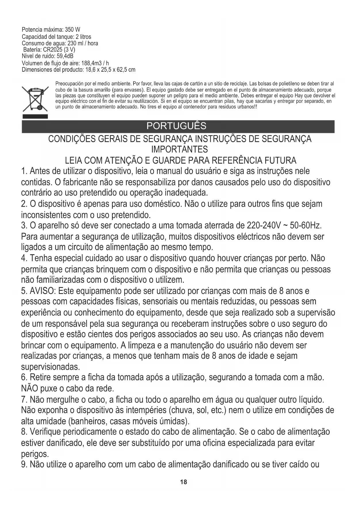 DADOS TÉCNICOS: Fonte de alimentação 220-240V ~ 50-60 Hz Potência: 80 W Potência máxima: 350 W Capacidade do tanque: 2 litros Consumo de água: 230 ml / hora Bateria: CR2025 (3V) Nível de ruído: 59,4dB Volume do fluxo de ar: 188,4m3 / h Dimensões do produto: 18,6 x 25,5 x 62,5 cm LIETUVIŲ Protecção do meio ambiente. Rogamos, os embalagens de cartão destinem-se para papéis velhos. Os sacos de polietileno (PE) devem-se colocar em contenedores para material plástico. O dispositivo usado deve-se levar a um ponto de armazenamento adequado porque os componentes perigosos que ficam dentro do dispositivo podem ser perigosos para o meio ambiente. O dispositivo elétrico deve-se entregar de modo que se reduza a sua nova utilização e uso. Se no dispositivo há pilhas, devem-se tirar e levar a um ponto de armazenamento em separado. Não colocar o dispositivo em contenedores para resíduos municipais!! BENDROSIOS SAUGOS SĄLYGOS SVARBIOS SAUGOS INSTRUKCIJOS ATIDŽIAI SKAITYKITE IR IŠSAUGOJITE ATEIČIAI