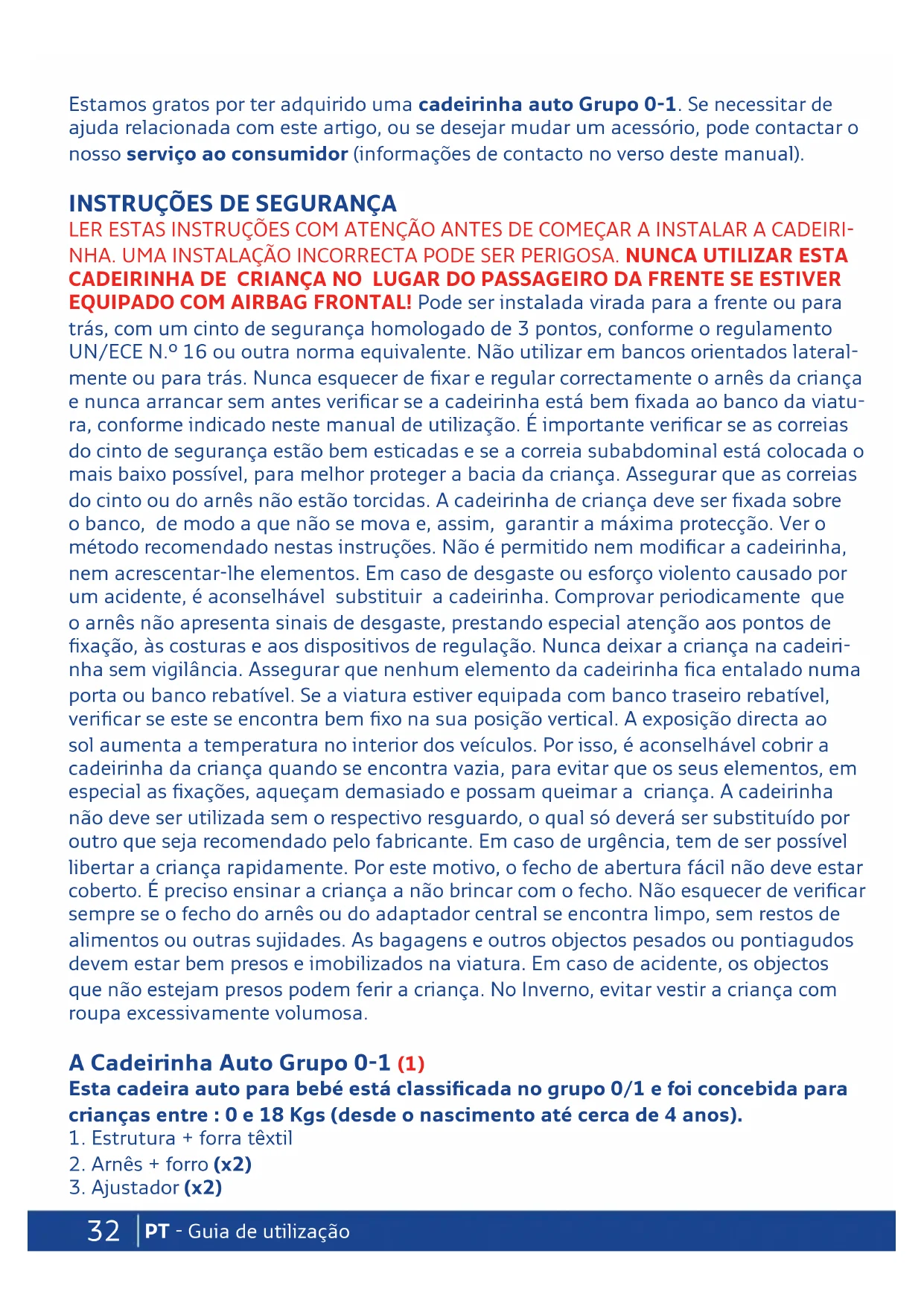 - En caso de duda, póngase en contacto con el fabricante del dispositivo de retención o su distribuidor.32 PT - Guia de utilização Estamos gratos por ter adquirido uma cadeirinha auto Grupo 0-1. Se necessitar de ajuda relacionada com este artigo, ou se desejar mudar um acessório, pode contactar o nosso serviço ao consumidor (informações de contacto no verso deste manual).