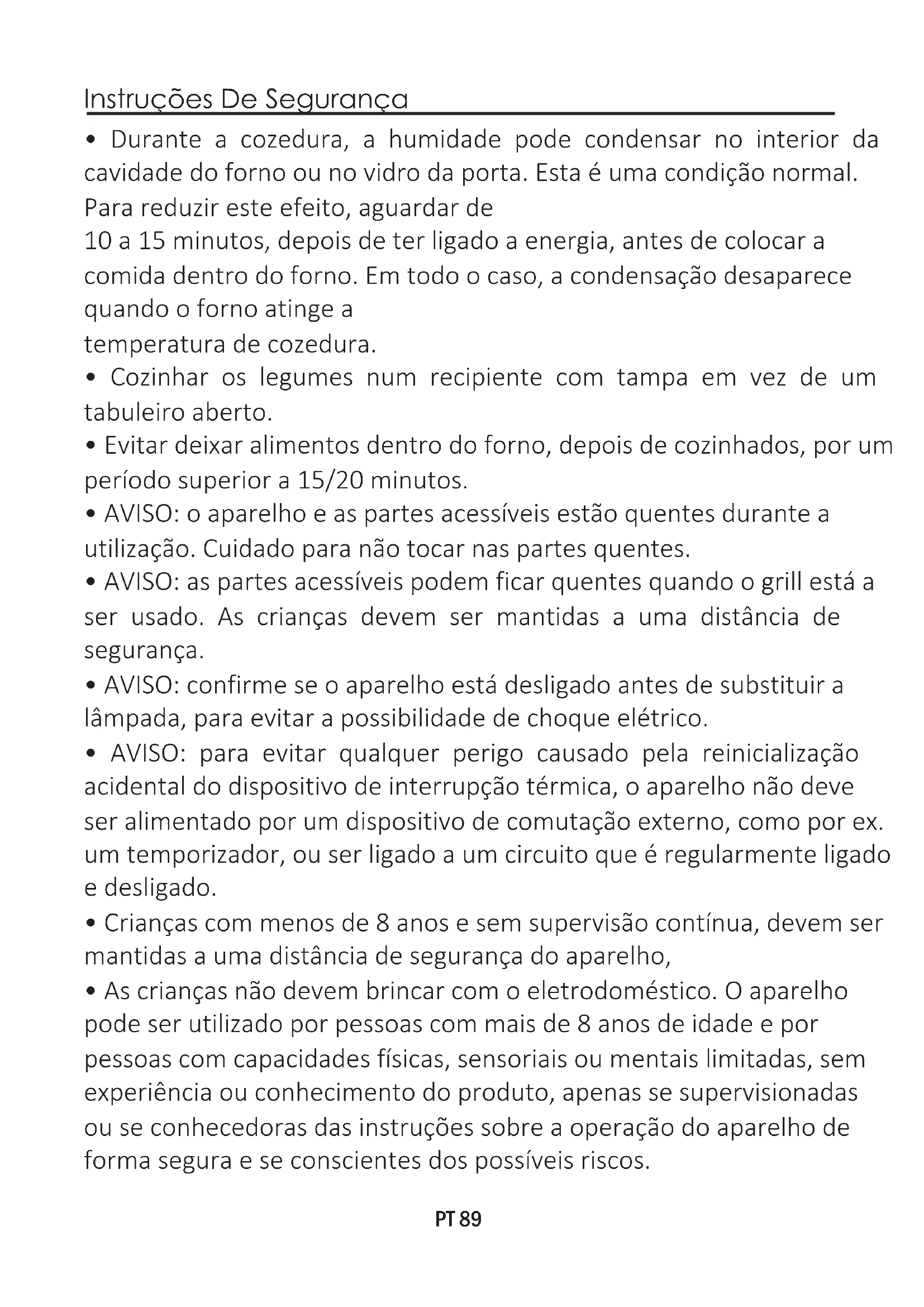 - AVISO: as partes acessíveis podem ficar quentes quando o grill está a ser usado. As crianças devem ser mantidas a uma distância de segurança. temperatura de cozedura. 10 a 15 minutos, depois de ter ligado a energia, antes de colocar a comida dentro do forno. Em todo o caso, a condensação desaparece quando o forno atinge a