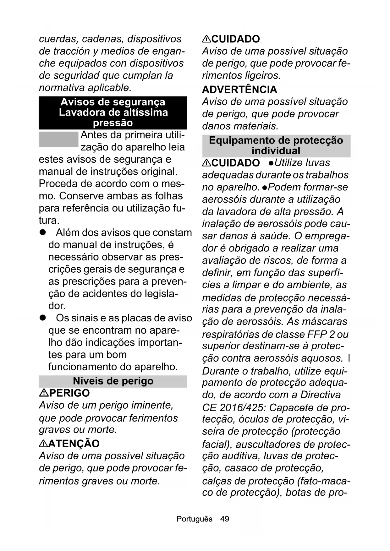 No obture nunca las salidas de los gases de escape. Asegúre- se de mantener libres de emisio- nes de gases de escape las entradas de aire. Observe las instrucciones de seguridad rela- tivas a los equipos con motor de gasolina del manual de instruc- ciones. Conservación y mantenimiento 몇 ADVERTENCIA Antes de realizar la limpieza, el manteni- miento o la sustitución de piezas deberá desconectar el equipo y, en el caso de los equipos con alimentación de red, desconec- tar el conector de red. Elimine la presión del sistema de alta presión antes de realizar cual- quier trabajo en el equipo o los accesorios. 몇 PRECAUCIÓN Solo el ser- vicio de postventa autorizado o el personal especialista familia- rizado con todas las reglamen- taciones de seguridad pertinentes debe llevar a cabo las reparaciones. Ponga en funcionamiento el equipo única- mente cuando se hayan solucio- nado todas las averías. CUIDADO Observe la revisión de seguridad relativa a los equi- pos móviles de uso profesional según las normas locales en vi- gor Cortocircuitos u otros da- ños. No limpie el equipo con mangueras o agua de alta pre- sión. No utilice acetona, ácidos sin diluir ni disolventes, ya que pueden dañar los materiales uti- lizados en el equipo. Accesorios y recambios 몇 PRECAUCIÓN Utilice úni- camente accesorios y recam- bios autorizados por el fabricante. Los accesorios y re- cambios originales garantizan un servicio seguro y sin fallos del equipo. Las reparaciones y el montaje de los recambios solo debe realizarlos el servicio de postventa autorizado; de esta forma evitará riesgos. Transporte 몇 PRECAUCIÓN Desconecte el equipo antes de transportarlo. Fije el equipo teniendo en cuen- ta el peso, ver el capítulo Datos técnicos del manual de instruc- ciones. Riesgo de accidentes y lesiones. Tenga en cuenta el peso del equipo al transportarlo y almacenarlo, véase capítulo Datos técnicos del manual de instrucciones. Tenga en cuenta las normativas legales del país correspondiente paras el trans- porte por vía pública. UtilicePortuguês 49 cuerdas, cadenas, dispositivos de tracción y medios de engan- che equipados con dispositivos de seguridad que cumplan la normativa aplicable. Avisos de segurança Lavadora de altíssima pressão Antes da primeira utili- zação do aparelho leia estes avisos de segurança e manual de instruções original. Proceda de acordo com o mes- mo. Conserve ambas as folhas para referência ou utilização fu- tura. Além dos avisos que constam do manual de instruções, é necessário observar as pres- crições gerais de segurança e as prescrições para a preven- ção de acidentes do legisla- dor. Os sinais e as placas de aviso que se encontram no apare- lho dão indicações importan- tes para um bom funcionamento do aparelho. Níveis de perigo PERIGO Aviso de um perigo iminente, que pode provocar ferimentos graves ou morte. 몇 ATENÇÃO Aviso de uma possível situação de perigo, que pode provocar fe- rimentos graves ou morte. 몇 CUIDADO Aviso de uma possível situação de perigo, que pode provocar fe- rimentos ligeiros. ADVERTÊNCIA Aviso de uma possível situação de perigo, que pode provocar danos materiais. Equipamento de protecção individual 몇 CUIDADO Utilize luvas adequadas durante os trabalhos no aparelho. Podem formar-se aerossóis durante a utilização da lavadora de alta pressão. A inalação de aerossóis pode cau- sar danos à saúde. O emprega- dor é obrigado a realizar uma avaliação de riscos, de forma a definir, em função das superfí- cies a limpar e do ambiente, as medidas de protecção necessá- rias para a prevenção da inala- ção de aerossóis. As máscaras respiratórias de classe FFP 2 ou superior destinam-se à protec- ção contra aerossóis aquosos. l Durante o trabalho, utilize equi- pamento de protecção adequa- do, de acordo com a Directiva CE 2016/425: Capacete de pro- tecção, óculos de protecção, vi- seira de protecção (protecção facial), auscultadores de protec- ção auditiva, luvas de protec- ção, casaco de protecção, calças de protecção (fato-maca- co de protecção), botas de pro-50 Português tecção. O vestuário de protecção oferece apenas pro- tecção contra água de pulveri- zação e partículas que saltem. Em contacto directo com o jacto de alta pressão, não existe ne- nhum efeito de protecção sufi- ciente. Indicações gerais de segurança PERIGO Perigo de asfixia. Mantenha a película da embala- gem afastada das crianças. 몇 ATENÇÃO Utilize o apare- lho apenas para os fins a que se destina. Tenha em considera- ção as condições locais e verifi- que se existem outras pessoas ao redor, especialmente crian- ças, durante os trabalhos com o aparelho. O aparelho não se destina a ser utilizado por pes- soas com capacidades físicas, sensoriais ou mentais limitadas ou sem experiência e/ou conhe- cimentos. O aparelho apenas deve ser manuseado por pes- soas instruídas quanto à sua uti- lização ou que tenham demonstrado competência na sua operação e que tenham sido expressamente encarrega- das da sua utilização. Supervi- sione as crianças para garantir que não brincam com o apare- lho. O aparelho não pode ser operado por crianças e jovens. 몇 CUIDADO As unidades de segurança servem para a sua protecção. Nunca altere ou evite as unidades de segurança. Perigo de choque eléctrico PERIGO Ligue aparelhos de classe de protecção I apenas a fontes de corrente ligadas à terra adequadas. A tensão in- dicada na placa de característi- cas tem de coincidir com a tensão da fonte de corrente. Tenha em atenção a protecção mínima da tomada, ver capítulo Dados Técnicos no manual de instruções. Opere o aparelho apenas através de um disjuntor de corrente parasita (máximo de 30mA). Ligue o aparelho à rede eléctrica com uma ficha. É proibido estabelecer uma liga- ção à rede eléctrica que não possa ser desligada. A ficha tem como função desligar