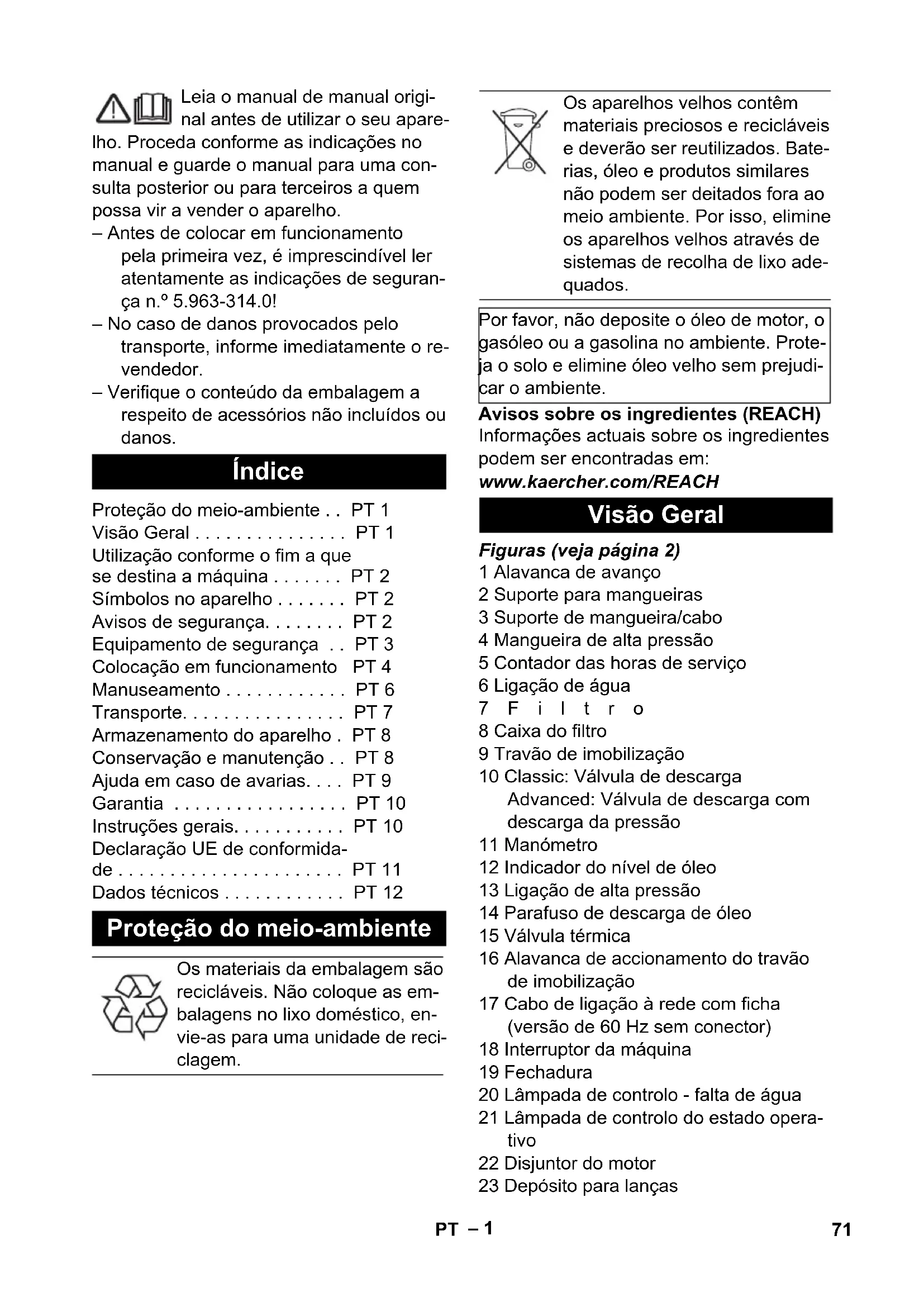 dB(A) 101 Motivo de la excepción según el Reglamento (UE) 2019/1781, anexo I, sección 2 (12): j) 70 ES– 1 Leia o manual de manual origi- nal antes de utilizar o seu apare- lho. Proceda conforme as indicações no manual e guarde o manual para uma con- sulta posterior ou para terceiros a quem possa vir a vender o aparelho. – Antes de colocar em funcionamento pela primeira vez, é imprescindível ler atentamente as indicações de seguran- ça n.º 5.963-314.0! – No caso de danos provocados pelo transporte, informe imediatamente o re- vendedor. – Verifique o conteúdo da embalagem a respeito de acessórios não incluídos ou danos. Avisos sobre os ingredientes (REACH) Informações actuais sobre os ingredientes podem ser encontradas em: www.kaercher.com/REACH Figuras (veja página 2) 1 Alavanca de avanço 2 Suporte para mangueiras 3 Suporte de mangueira/cabo 4 Mangueira de alta pressão 5 Contador das horas de serviço 6 Ligação de água 7Filtro 8 Caixa do filtro 9 Travão de imobilização 10 Classic: Válvula de descarga Advanced: Válvula de descarga com descarga da pressão 11 Manómetro 12 Indicador do nível de óleo 13 Ligação de alta pressão 14 Parafuso de descarga de óleo 15 Válvula térmica 16 Alavanca de accionamento do travão de imobilização 17 Cabo de ligação à rede com ficha (versão de 60 Hz sem conector) 18 Interruptor da máquina 19 Fechadura 20 Lâmpada de controlo - falta de água 21 Lâmpada de controlo do estado opera- tivo 22 Disjuntor do motor 23 Depósito para lanças Índice Proteção do meio-ambiente . . PT 1 Visão Geral . . . . . . . . . . . . . . . PT 1 Utilização conforme o fim a que se destina a máquina . . . . . . . PT 2 Símbolos no aparelho . . . . . . . PT 2 Avisos de segurança. . . . . . . . PT 2 Equipamento de segurança . . PT 3 Colocação em funcionamento PT 4 Manuseamento . . . . . . . . . . . . PT 6 Transporte. . . . . . . . . . . . . . . . PT 7 Armazenamento do aparelho . PT 8 Conservação e manutenção . . PT 8 Ajuda em caso de avarias. . . . PT 9 Garantia . . . . . . . . . . . . . . . . . PT 10 Instruções gerais. . . . . . . . . . . PT 10 Declaração UE de conformida- de . . . . . . . . . . . . . . . . . . . . . . PT 11 Dados técnicos . . . . . . . . . . . . PT 12 Proteção do meio-ambiente Os materiais da embalagem são recicláveis. Não coloque as em- balagens no lixo doméstico, en- vie-as para uma unidade de reci- clagem. Os aparelhos velhos contêm materiais preciosos e recicláveis e deverão ser reutilizados. Bate- rias, óleo e produtos similares não podem ser deitados fora ao meio ambiente. Por isso, elimine os aparelhos velhos através de sistemas de recolha de lixo ade- quados. Por favor, não deposite o óleo de motor, o gasóleo ou a gasolina no ambiente. Prote- ja o solo e elimine óleo velho sem prejudi- car o ambiente. Visão Geral 71PT– 2 24 Dispositivo de protecção contra a falta de água 25 Válvula de segurança 26 Ligação de alta pressão 27 Bocal para o enchimento do óleo 28 Compartimento acessórios 29 Olhais 30 Tirante para transporte por grua 31 Bocal de alta potência com porca de capa 32 Lança 33 Pistola de injecção manual 34 Alavanca da pistola 35 Bloqueio de segurança – Os elementos de comando para o pro- cesso de limpeza são amarelos. – Os elementos de comando para a ma- nutenção e o serviço são cinza claros. Utilize esta máquina de limpeza a alta pres- são exclusivamente: – para a limpeza de máquinas, veículos, construções e ferramentas. – com os acessórios e peças sobressa- lentes autorizados pela Kärcher. 몇 ATENÇÃO Respeite as normas da companhia de abastecimento de água. De acordo com as prescrições em vigor o aparelho nunca pode ser li- gado à rede de água potável sem separador de sistema. Deve-se utilizar um separador de sistema adequado da firma KÄRCHER ou, alternativamente, um separador de sistema segundo EN 12729 tipo BA. A água que tenha entrado no separador de sis- tema é considerada imprópria para consumo. 몇 CUIDADO Ligar o separador de sistema sempre à ali- mentação de água e nunca diretamente ao aparelho. PERIGO Aviso referente a um perigo eminente que pode conduzir a graves ferimentos ou à morte. 몇 ATENÇÃO Aviso referente a uma possível situação perigosa que pode conduzir a graves feri- mentos ou à morte. Identificação da cor Utilização conforme o fim a que se destina a máquina Símbolos no aparelho Os jactos de alta pressão podem ser perigosos em caso de uso incorrecto. O jacto não deve ser dirigi- do contra pessoas, ani- mais, equipamento eléc- trico activo ou contra o próprio aparelho. Perigo de dano causado por água congelada. Ar- mazenar o aparelho num espaço aquecido ou es- vaziá-lo durante o Inver- no. Perigo de lesões auditi- vas. Durante o trabalho com o aparelho utilizar obrigatoriamente uma protecção auditiva ade- quada. Perigo de lesões! Utilizar óculos de protecção. Perigo de queimaduras devido a superfícies quentes! Aviso para tensão eléctri- ca perigosa! Avisos de segurança Níveis do aparelho 72 PT– 3 몇 CUIDADO Aviso referente a uma situação potencial- mente perigosa que pode causar ferimen- tos leves. ADVERTÊNCIA Aviso referente a uma situação potencial- mente perigosa que pode causar danos materiais. PERIGO Perigo de lesões! – Utilizar exclusivamente mangueiras de alta pressão originais. – A mangueira de alta pressão e o dispo- sitivo de injecção têm que ser adequa- dos para a máxima pressão de serviço admissível referenciada nos Dados Técnicos. – Evitar o contacto com produtos químicos. – Controlar diariamente a mangueira de alta pressão. Mangueiras com vincos não devem ser utilizadas. Se for visível o reforço exterior de ara- me, a mangueira de alta pressão não pode ser utilizada. – Mangueiras de alta pressão com as roscas danificadas não podem ser utili- zadas. – Colocar a mangueira de alta pressão de modo a que esta n