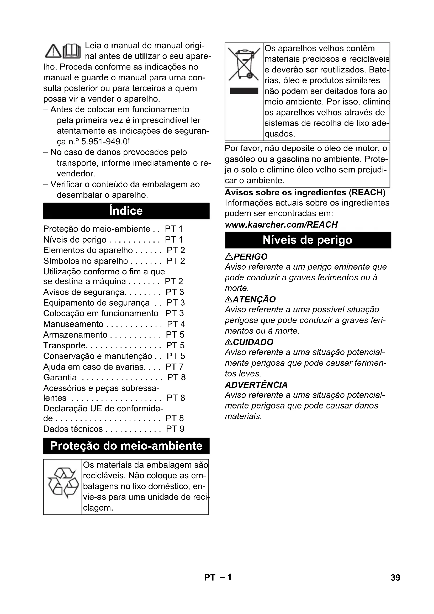 Peso de funcionamiento típico kg 105 115 Depósito de carburante l 20 20 38 ES– 1 Leia o manual de manual origi- nal antes de utilizar o seu apare- lho. Proceda conforme as indicações no manual e guarde o manual para uma con- sulta posterior ou para terceiros a quem possa vir a vender o aparelho. – Antes de colocar em funcionamento pela primeira vez é imprescindível ler atentamente as indicações de seguran- ça n.º 5.951-949.0! – No caso de danos provocados pelo transporte, informe imediatamente o re- vendedor. – Verificar o conteúdo da embalagem ao desembalar o aparelho. Avisos sobre os ingredientes (REACH) Informações actuais sobre os ingredientes podem ser encontradas em: www.kaercher.com/REACH PERIGO Aviso referente a um perigo eminente que pode conduzir a graves ferimentos ou à morte. 몇 ATENÇÃO Aviso referente a uma possível situação perigosa que pode conduzir a graves feri- mentos ou à morte. 몇 CUIDADO Aviso referente a uma situação potencial- mente perigosa que pode causar ferimen- tos leves. ADVERTÊNCIA Aviso referente a uma situação potencial- mente perigosa que pode causar danos materiais. Índice Proteção do meio-ambiente . . PT 1 Níveis de perigo . . . . . . . . . . . PT 1 Elementos do aparelho . . . . . . PT 2 Símbolos no aparelho . . . . . . . PT 2 Utilização conforme o fim a que se destina a máquina . . . . . . . PT 2 Avisos de segurança. . . . . . . . PT 3 Equipamento de segurança . . PT 3 Colocação em funcionamento PT 3 Manuseamento . . . . . . . . . . . . PT 4 Armazenamento . . . . . . . . . . . PT 5 Transporte. . . . . . . . . . . . . . . . PT 5 Conservação e manutenção . . PT 5 Ajuda em caso de avarias. . . . PT 7 Garantia . . . . . . . . . . . . . . . . . PT 8 Acessórios e peças sobressa- lentes . . . . . . . . . . . . . . . . . . . PT 8 Declaração UE de conformida- de . . . . . . . . . . . . . . . . . . . . . . PT 8 Dados técnicos . . . . . . . . . . . . PT 9 Proteção do meio-ambiente Os materiais da embalagem são recicláveis. Não coloque as em- balagens no lixo doméstico, en- vie-as para uma unidade de reci- clagem. Os aparelhos velhos contêm materiais preciosos e recicláveis e deverão ser reutilizados. Bate- rias, óleo e produtos similares não podem ser deitados fora ao meio ambiente. Por isso, elimine os aparelhos velhos através de sistemas de recolha de lixo ade- quados. Por favor, não deposite o óleo de motor, o gasóleo ou a gasolina no ambiente. Prote- ja o solo e elimine óleo velho sem prejudi- car o ambiente. Níveis de perigo 39PT– 2 1 Chapa de suporte 2 Tampa de borracha 3 Interruptor de nível 4 Pré-filtro de combustível 5 Suporte para pistola com lança 6 Quadro 7 Dispositivo de protecção contra a falta de água 8 Placa de tipo 9 Grampo de fixação 10 Mangueira (Sistema de amortecimento suave) 11 Filtro no dispositivo de protecção contra a falta de água 12 Válvula magnética do combustível 13 Bomba do combustível 14 Filtro do combustível 15 Ventilador do queimador 16 Entrada de alta pressão (azul) 17 Rolo de guia com travão de imobilização 18 Tanque de combustível 19 Filtro do combustível 20 Motor do ventilador 21 Orifício para encher o combustível 22 Interruptor da máquina 23 Mangueira de alta pressão 3 m, diâme- tro nominal 8 24 Linha adutora eléctrica 25 Saída de alta pressão (cor de laranja) 26 Mangueira de alta pressão 10 m 27 Queimador 28 Suporte para mangueiras 29 Porca de capa 30 Transformador de ignição 31 Bico de alta pressão (não incluído no volume do fornecimento) 32 Lança 33 Pistola pulverizadora manual 34 Gatilho de disparo 35 Bloqueio de segurança da pistola pul- verizadora manual Os jactos de alta pressão podem ser perigosos em caso de uso in- correcto. O jacto não deve ser dirigido con- tra pessoas, animais, equipamento eléctri- co activo ou contra o próprio aparelho. – Este gerador de água quente destina- se a ser usado em combinação com uma lavadora de alta pressão a frio lo- cal para a limpeza com água quente. – Para limpar: Máquinas, veículos, edifí- cios, ferramentas, fachadas, terraços, utensílios de jardinagem etc. – O aparelho não pode funcionar em lo- cais fechados. PERIGO Perigo de lesões! Ao utilizar a máquina em estações de serviço ou noutros locais de perigo, observe as respectivas disposições em matéria de segurança. Elementos do aparelho Símbolos no aparelho Perigo devido a tensão eléctrica! Os trabalhos nos componentes da instalação só podem ser efectuados por especialistas electrotécnicos ou por pessoal técnico devidamente autorizado. Perigo de queimaduras devido a superfícies quentes! Perigo de envenenamento! Não inalar os gases de escape. Perigo de danos no apa- relho auditivo. Nos traba- lhos com este aparelho é imprescindível a utiliza- ção de uma protecção adequada para os ouvi- dos. Perigo de lesões! Usar óculos de protecção. Utilização conforme o fim a que se destina a máquina 40 PT– 3 – A caldeira de água quente é uma insta- lação de combustão. As instalações de combustão devem ser verificadas regu- larmente de acordo com as prescrições nacionais do legislador. – Não devem ser feitas quaisquer altera- ções no aparelho/nos acessórios. – Respeitar as respectivas disposições nacionais do legislador referentes a projectores de jactos líquidos. – Respeitar as respectivas disposições nacionais do legislador referentes à prevenção de acidentes. Os projecto- res de jactos líquidos têm que ser con- trolados regularmente e o resultado do controlo registado por escrito. Os dispositivos de segurança servem para protecção do utilizador e não podem ser colocados fora de serviço nem sofrer alte- rações no seu funcionamento. – O dispositivo de protecção contra a fal- ta de água impede que o queimador seja liguado enquando faltar água. – Um coador protege o dispositivo de protecção contra sujeira e deverá ser limpado regu