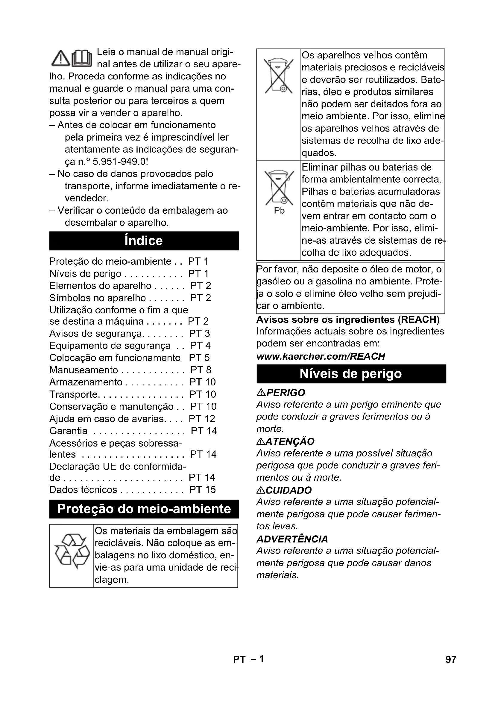 96 ES– 1 Leia o manual de manual origi- nal antes de utilizar o seu apare- lho. Proceda conforme as indicações no manual e guarde o manual para uma con- sulta posterior ou para terceiros a quem possa vir a vender o aparelho. – Antes de colocar em funcionamento pela primeira vez é imprescindível ler atentamente as indicações de seguran- ça n.º 5.951-949.0! – No caso de danos provocados pelo transporte, informe imediatamente o re- vendedor. – Verificar o conteúdo da embalagem ao desembalar o aparelho. Avisos sobre os ingredientes (REACH) Informações actuais sobre os ingredientes podem ser encontradas em: www.kaercher.com/REACH PERIGO Aviso referente a um perigo eminente que pode conduzir a graves ferimentos ou à morte. 몇 ATENÇÃO Aviso referente a uma possível situação perigosa que pode conduzir a graves feri- mentos ou à morte. 몇 CUIDADO Aviso referente a uma situação potencial- mente perigosa que pode causar ferimen- tos leves. ADVERTÊNCIA Aviso referente a uma situação potencial- mente perigosa que pode causar danos materiais. Índice Proteção do meio-ambiente . . PT 1 Níveis de perigo . . . . . . . . . . . PT 1 Elementos do aparelho . . . . . . PT 2 Símbolos no aparelho . . . . . . . PT 2 Utilização conforme o fim a que se destina a máquina . . . . . . . PT 2 Avisos de segurança. . . . . . . . PT 3 Equipamento de segurança . . PT 4 Colocação em funcionamento PT 5 Manuseamento . . . . . . . . . . . . PT 8 Armazenamento . . . . . . . . . . . PT 10 Transporte. . . . . . . . . . . . . . . . PT 10 Conservação e manutenção . . PT 10 Ajuda em caso de avarias. . . . PT 12 Garantia . . . . . . . . . . . . . . . . . PT 14 Acessórios e peças sobressa- lentes . . . . . . . . . . . . . . . . . . . PT 14 Declaração UE de conformida- de . . . . . . . . . . . . . . . . . . . . . . PT 14 Dados técnicos . . . . . . . . . . . . PT 15 Proteção do meio-ambiente Os materiais da embalagem são recicláveis. Não coloque as em- balagens no lixo doméstico, en- vie-as para uma unidade de reci- clagem. Os aparelhos velhos contêm materiais preciosos e recicláveis e deverão ser reutilizados. Bate- rias, óleo e produtos similares não podem ser deitados fora ao meio ambiente. Por isso, elimine os aparelhos velhos através de sistemas de recolha de lixo ade- quados. Eliminar pilhas ou baterias de forma ambientalmente correcta. Pilhas e baterias acumuladoras contêm materiais que não de- vem entrar em contacto com o meio-ambiente. Por isso, elimi- ne-as através de sistemas de re- colha de lixo adequados. Por favor, não deposite o óleo de motor, o gasóleo ou a gasolina no ambiente. Prote- ja o solo e elimine óleo velho sem prejudi- car o ambiente. Níveis de perigo