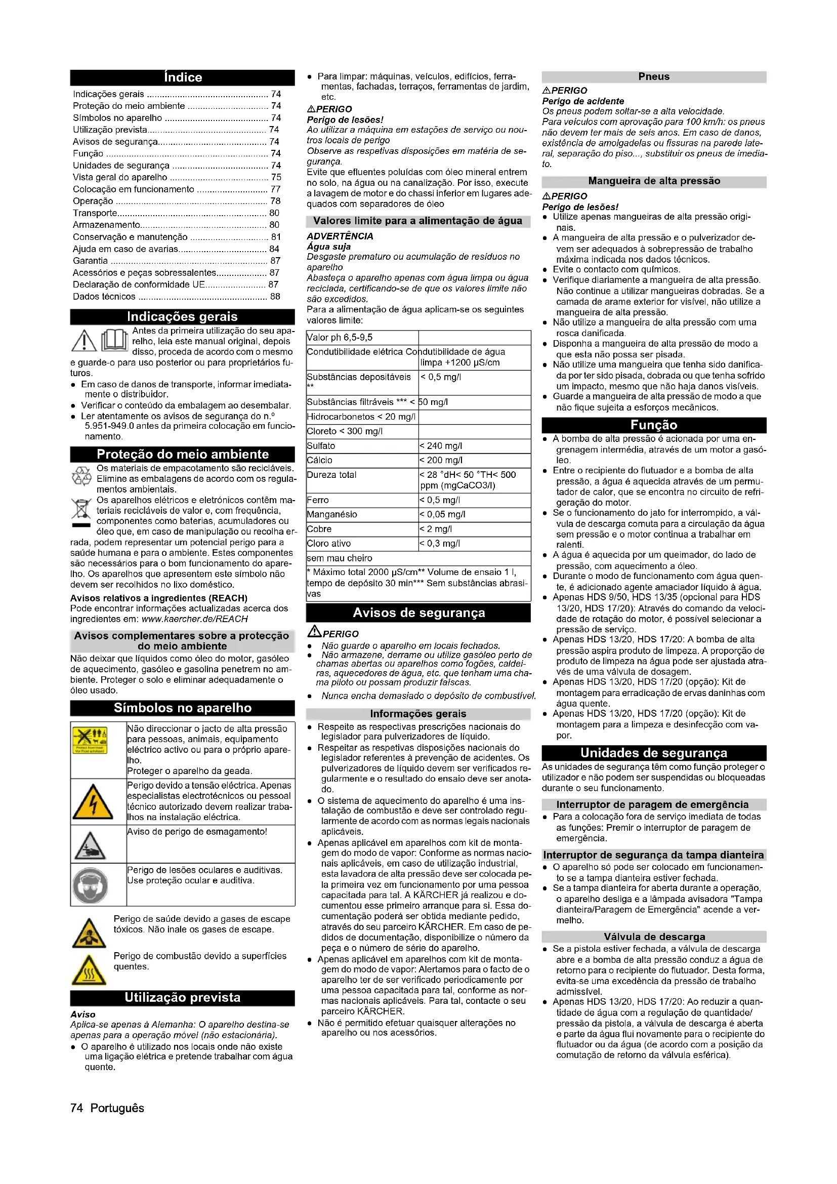 - 2,1 2,1 0,85 0,8 HDS 9/50 DE Tr1 HDS 13/35 DE Tr1 HDS 13/20 DE Tr1 HDS 17/20 DE Tr174 Português Índice Indicações gerais Antes da primeira utilização do seu apa- relho, leia este manual original, depois disso, proceda de acordo com o mesmo e guarde-o para uso posterior ou para proprietários fu- turos. ● Em caso de danos de transporte, informar imediata- mente o distribuidor. ● Verificar o conteúdo da embalagem ao desembalar. ● Ler atentamente os avisos de segurança do n.º 5.951-949.0 antes da primeira colocação em funcio- namento. Proteção do meio ambiente Os materiais de empacotamento são recicláveis. Elimine as embalagens de acordo com os regula- mentos ambientais. Os aparelhos elétricos e eletrónicos contêm ma- teriais recicláveis de valor e, com frequência, componentes como baterias, acumuladores ou óleo que, em caso de manipulação ou recolha er- rada, podem representar um potencial perigo para a saúde humana e para o ambiente. Estes componentes são necessários para o bom funcionamento do apare- lho. Os aparelhos que apresentem este símbolo não devem ser recolhidos no lixo doméstico. Avisos relativos a ingredientes (REACH) Pode encontrar informações actualizadas acerca dos ingredientes em: www.kaercher.de/REACH Avisos complementares sobre a protecção do meio ambiente Não deixar que líquidos como óleo do motor, gasóleo de aquecimento, gasóleo e gasolina penetrem no am- biente. Proteger o solo e eliminar adequadamente o óleo usado. Símbolos no aparelho Utilização prevista Aviso Aplica-se apenas à Alemanha: O aparelho destina-se apenas para a operação móvel (não estacionária). ● O aparelho é utilizado nos locais onde não existe uma ligação elétrica e pretende trabalhar com água quente. ● Para limpar: máquinas, veículos, edifícios, ferra- mentas, fachadas, terraços, ferramentas de jardim, etc. PERIGO Perigo de lesões! Ao utilizar a máquina em estações de serviço ou nou- tros locais de perigo Observe as respetivas disposições em matéria de se- gurança. Evite que efluentes poluídas com óleo mineral entrem no solo, na água ou na canalização. Por isso, execute a lavagem de motor e do chassi inferior em lugares ade- quados com separadores de óleo Valores limite para a alimentação de água ADVERTÊNCIA Água suja Desgaste prematuro ou acumulação de resíduos no aparelho Abasteça o aparelho apenas com água limpa ou água reciclada, certificando-se de que os valores limite não são excedidos. Para a alimentação de água aplicam-se os seguintes valores limite: Avisos de segurança PERIGO ● Não guarde o aparelho em locais fechados. ● Não armazene, derrame ou utilize gasóleo perto de chamas abertas ou aparelhos como fogões, caldei- ras, aquecedores de água, etc. que tenham uma cha- ma piloto ou possam produzir faíscas. ● Nunca encha demasiado o depósito de combustível. Informações gerais ● Respeite as respectivas prescrições nacionais do legislador para pulverizadores de líquido. ● Respeitar as respetivas disposições nacionais do legislador referentes à prevenção de acidentes. Os pulverizadores de líquido devem ser verificados re- gularmente e o resultado do ensaio deve ser anota- do. ● O sistema de aquecimento do aparelho é uma ins- talação de combustão e deve ser controlado regu- larmente de acordo com as normas legais nacionais aplicáveis. ● Apenas aplicável em aparelhos com kit de monta- gem do modo de vapor: Conforme as normas nacio- nais aplicáveis, em caso de utilização industrial, esta lavadora de alta pressão deve ser colocada pe- la primeira vez em funcionamento por uma pessoa capacitada para tal. A KÄRCHER já realizou e do- cumentou esse primeiro arranque para si. Essa do- cumentação poderá ser obtida mediante pedido, através do seu parceiro KÄRCHER. Em caso de pe- didos de documentação, disponibilize o número da peça e o número de série do aparelho. ● Apenas aplicável em aparelhos com kit de monta- gem do modo de vapor: Alertamos para o facto de o aparelho ter de ser verificado periodicamente por uma pessoa capacitada para tal, conforme as nor- mas nacionais aplicáveis. Para tal, contacte o seu parceiro KÄRCHER. ● Não é permitido efetuar quaisquer alterações no aparelho ou nos acessórios. Pneus PERIGO Perigo de acidente Os pneus podem soltar-se a alta velocidade. Para veículos com aprovação para 100 km/h: os pneus não devem ter mais de seis anos. Em caso de danos, existência de amolgadelas ou fissuras na parede late- ral, separação do piso