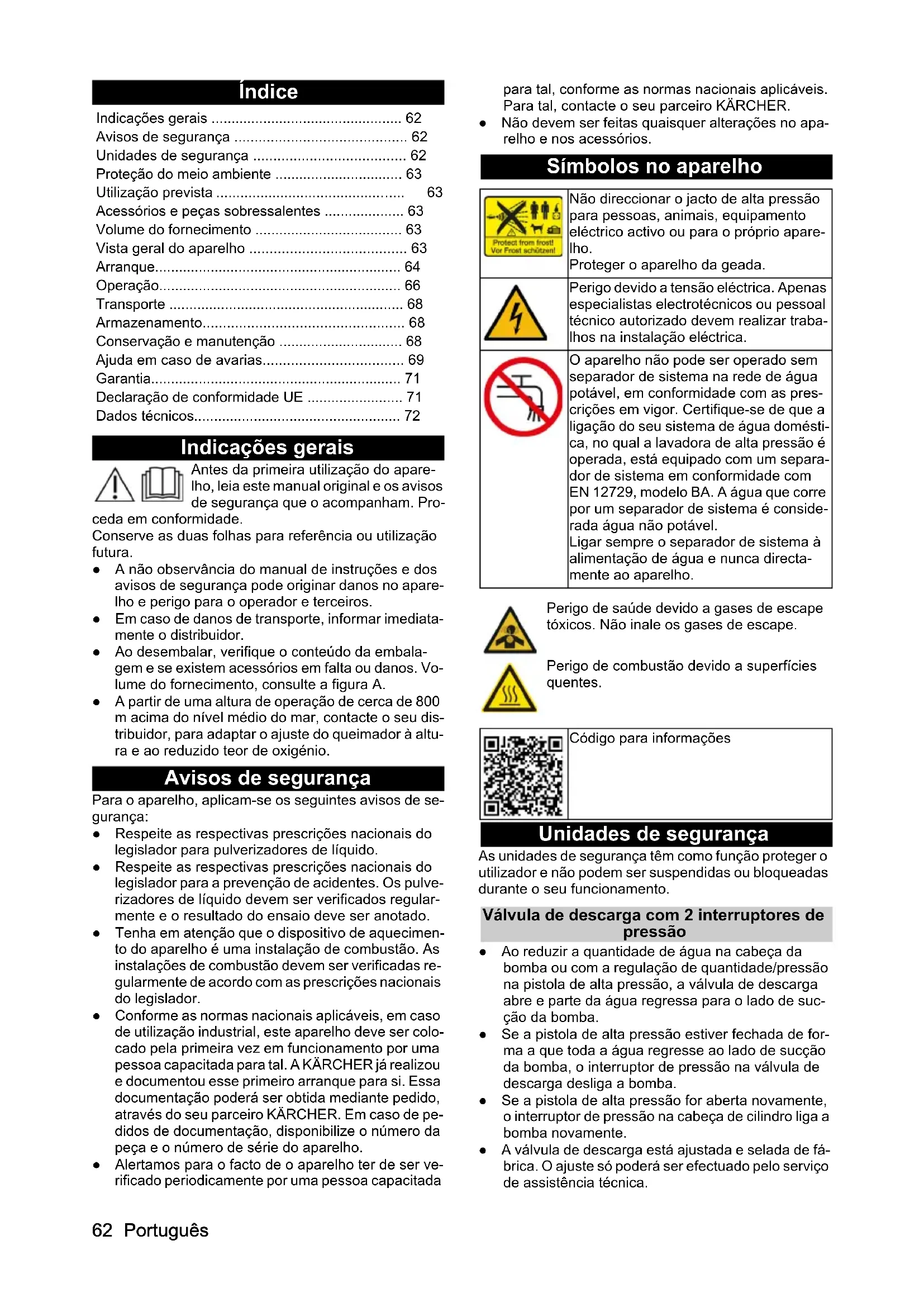 - HDS 9/17-4 CXA62 Português Índice Indicações gerais Antes da primeira utilização do apare- lho, leia este manual original e os avisos de segurança que o acompanham. Pro- ceda em conformidade. Conserve as duas folhas para referência ou utilização futura. ● A não observância do manual de instruções e dos avisos de segurança pode originar danos no apare- lho e perigo para o operador e terceiros. ● Em caso de danos de transporte, informar imediata- mente o distribuidor. ● Ao desembalar, verifique o conteúdo da embala- gem e se existem acessórios em falta ou danos. Vo- lume do fornecimento, consulte a figura A. ● A partir de uma altura de operação de cerca de 800 m acima do nível médio do mar, contacte o seu dis- tribuidor, para adaptar o ajuste do queimador à altu- ra e ao reduzido teor de oxigénio. Avisos de segurança Para o aparelho, aplicam-se os seguintes avisos de se- gurança: ● Respeite as respectivas prescrições nacionais do legislador para pulverizadores de líquido. ● Respeite as respectivas prescrições nacionais do legislador para a prevenção de acidentes. Os pulve- rizadores de líquido devem ser verificados regular- mente e o resultado do ensaio deve ser anotado. ● Tenha em atenção que o dispositivo de aquecimen- to do aparelho é uma instalação de combustão. As instalações de combustão devem ser verificadas re- gularmente de acordo com as prescrições nacionais do legislador. ● Conforme as normas nacionais aplicáveis, em caso de utilização industrial, este aparelho deve ser colo- cado pela primeira vez em funcionamento por uma pessoa capacitada para tal. A KÄRCHER já realizou e documentou esse primeiro arranque para si. Essa documentação poderá ser obtida mediante pedido, através do seu parceiro KÄRCHER. Em caso de pe- didos de documentação, disponibilize o número da peça e o número de série do aparelho. ● Alertamos para o facto de o aparelho ter de ser ve- rificado periodicamente por uma pessoa capacitada para tal, conforme as normas nacionais aplicáveis. Para tal, contacte o seu parceiro KÄRCHER. ● Não devem ser feitas quaisquer alterações no apa- relho e nos acessórios. Símbolos no aparelho Unidades de segurança As unidades de segurança têm como função proteger o utilizador e não podem ser suspendidas ou bloqueadas durante o seu funcionamento. Válvula de descarga com 2 interruptores de pressão ● Ao reduzir a quantidade de água na cabeça da bomba ou com a regulação de quantidade/pressão na pistola de alta pressão, a válvula de descarga abre e parte da água regressa para o lado de suc- ção da bomba. ● Se a pistola de alta pressão estiver fechada de for- ma a que toda a água regresse ao lado de sucção da bomba, o interruptor de pressão na válvula de descarga desliga a bomba. ● Se a pistola de alta pressão for aberta novamente, o interruptor de pressão na cabeça de cilindro liga a bomba novamente. ● A válvula de descarga está ajustada e selada de fá- brica. O ajuste só poderá ser efectuado pelo serviço de assistência técnica. Indicações gerais p. 62
