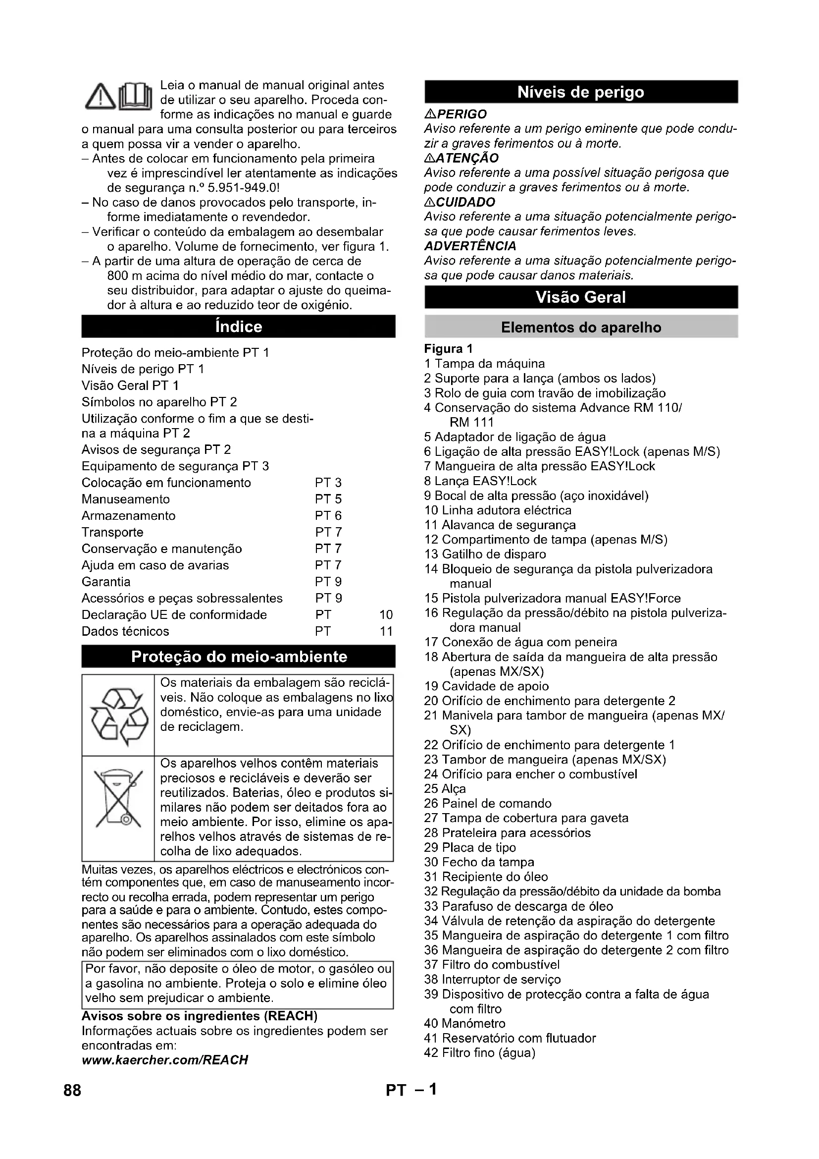 1,0 1,0 Combustibles Material combustible -- Aceite combustible EL o Diesel Aceite combustible EL o Diesel Cantidad de aceite l 1,0 1,0 Tipo de aceite -- SAE 90 SAE 90 Medidas y pesos Longitud x anchura x altura mm 1330 x 750 x 1060 1330 x 750 x 1060 Peso de funcionamiento típico, S kg 200 200 Peso de funcionamiento típico, SX kg 205 205 Depósito de carburante l 25 25 Depósito de detergente l 10+20 10+20 87ES– 1 Leia o manual de manual original antes de utilizar o seu aparelho. Proceda con- forme as indicações no manual e guarde o manual para uma consulta posterior ou para terceiros a quem possa vir a vender o aparelho. – Antes de colocar em funcionamento pela primeira vez é imprescindível ler atentamente as indicações de segurança n.º 5.951-949.0! – No caso de danos provocados pelo transporte, in- forme imediatamente o revendedor. – Verificar o conteúdo da embalagem ao desembalar o aparelho. Volume de fornecimento, ver figura 1. – A partir de uma altura de operação de cerca de 800 m acima do nível médio do mar, contacte o seu distribuidor, para adaptar o ajuste do queima- dor à altura e ao reduzido teor de oxigénio. Muitas vezes, os aparelhos eléctricos e electrónicos con- tém componentes que, em caso de manuseamento incor- recto ou recolha errada, podem representar um perigo para a saúde e para o ambiente. Contudo, estes compo- nentes são necessários para a operação adequada do aparelho. Os aparelhos assinalados com este símbolo não podem ser eliminados com o lixo doméstico. Avisos sobre os ingredientes (REACH) Informações actuais sobre os ingredientes podem ser encontradas em: www.kaercher.com/REACH PERIGO Aviso referente a um perigo eminente que pode condu- zir a graves ferimentos ou à morte. 몇 ATENÇÃO Aviso referente a uma possível situação perigosa que pode conduzir a graves ferimentos ou à morte. 몇 CUIDADO Aviso referente a uma situação potencialmente perigo- sa que pode causar ferimentos leves. ADVERTÊNCIA Aviso referente a uma situação potencialmente perigo- sa que pode causar danos materiais. Figura 1 1 Tampa da máquina 2 Suporte para a lança (ambos os lados) 3 Rolo de guia com travão de imobilização 4 Conservação do sistema Advance RM 110/ RM 111 5 Adaptador de ligação de água 6 Ligação de alta pressão EASY!Lock (apenas M/S) 7 Mangueira de alta pressão EASY!Lock 8 Lança EASY!Lock 9 Bocal de alta pressão (aço inoxidável) 10 Linha adutora eléctrica 11 Alavanca de segurança 12 Compartimento de tampa (apenas M/S) 13 Gatilho de disparo 14 Bloqueio de segurança da pistola pulverizadora manual 15 Pistola pulverizadora manual EASY!Force 16 Regulação da pressão/débito na pistola pulveriza- dora manual 17 Conexão de água com peneira 18 Abertura de saída da mangueira de alta pressão (apenas MX/SX) 19 Cavidade de apoio 20 Orifício de enchimento para detergente 2 21 Manivela para tambor de mangueira (apenas MX/ SX) 22 Orifício de enchimento para detergente 1 23 Tambor de mangueira (apenas MX/SX) 24 Orifício para encher o combustível 25 Alça 26 Painel de comando 27 Tampa de cobertura para gaveta 28 Prateleira para acessórios 29 Placa de tipo 30 Fecho da tampa 31 Recipiente do óleo 32 Regulação da pressão/débito da unidade da bomba 33 Parafuso de descarga de óleo 34 Válvula de retenção da aspiração do detergente 35 Mangueira de aspiração do detergente 1 com filtro 36 Mangueira de aspiração do detergente 2 com filtro 37 Filtro do combustível 38 Interruptor de serviço 39 Dispositivo de protecção contra a falta de água com filtro 40 Manómetro 41 Reservatório com flutuador 42 Filtro fino (água) Índice Proteção do meio-ambiente PT 1 Níveis de perigo PT 1 Visão Geral PT 1 Símbolos no aparelho PT 2 Utilização conforme o fim a que se desti- na a máquina PT 2 Avisos de segurança PT 2 Equipamento de segurança PT 3 Colocação em funcionamento PT 3 Manuseamento PT 5 Armazenamento PT 6 Transporte PT 7 Conservação e manutenção PT 7 Ajuda em caso de avarias PT 7 Garantia PT 9 Acessórios e peças sobressalentes PT 9 Declaração UE de conformidade PT 10 Dados técnicos PT 11 Proteção do meio-ambiente Os materiais da embalagem são reciclá- veis. Não coloque as embalagens no lixo doméstico, envie-as para uma unidade de reciclagem. Os aparelhos velhos contêm materiais preciosos e recicláveis e deverão ser reutilizados. Baterias, óleo e produtos si- milares não podem ser deitados fora ao meio ambiente. Por isso, elimine os apa- relhos velhos através de sistemas de re- colha de lixo adequados. Por favor, não deposite o óleo de motor, o gasóleo ou a gasolina no ambiente. Proteja o solo e elimine óleo velho sem prejudicar o ambiente. Níveis de perigo Visão Geral Elementos do aparelho 88 PT– 2 Figura 2 A Interruptor da máquina B Regulador de temperatura C Válvula de dosagem do detergente 1 Modo operativo: Operação com água fria 2 Modo operativo: Operação Eco (água quente máx. 60 °C) 3 Modo operativo: Operação com água quente/vapor 4 Lâmpada de controlo da bomba 5 Lâmpada avisadora do sentido de rotação (não HDS 7/9, HDS 7/10, HDS 7/12) 6 Lâmpada de controlo "pronto a funcionar" 7 Lâmpada de controlo do combustível 8 Lâmpada avisadora do produto de limpeza 1 (ape- nas HDS 12/18, HDS 13/20) 9 Lâmpada de controlo do motor 10 Lâmpada de controlo de avaria do queimador 11 Lâmpada de controlo de serviço (Assistência) 12 Lâmpada de controlo da conservação do sistema 13 Lâmpada avisadora do produto de limpeza 2 (ape- nas HDS 12/18, HDS 13/20) – Os elementos de comando para o processo de lim- peza são amarelos. – Os elementos de comando para a manutenção e o serviço são cinza claros. Os jactos de alta pressão podem ser peri- gosos em caso de uso incorrecto. O jacto não deve ser dirigido contra pessoas, ani- mais, equipamento eléctrico activo ou contra o próprio aparelho. Para limpar: Máquinas, veículos, edifícios, ferramentas, 