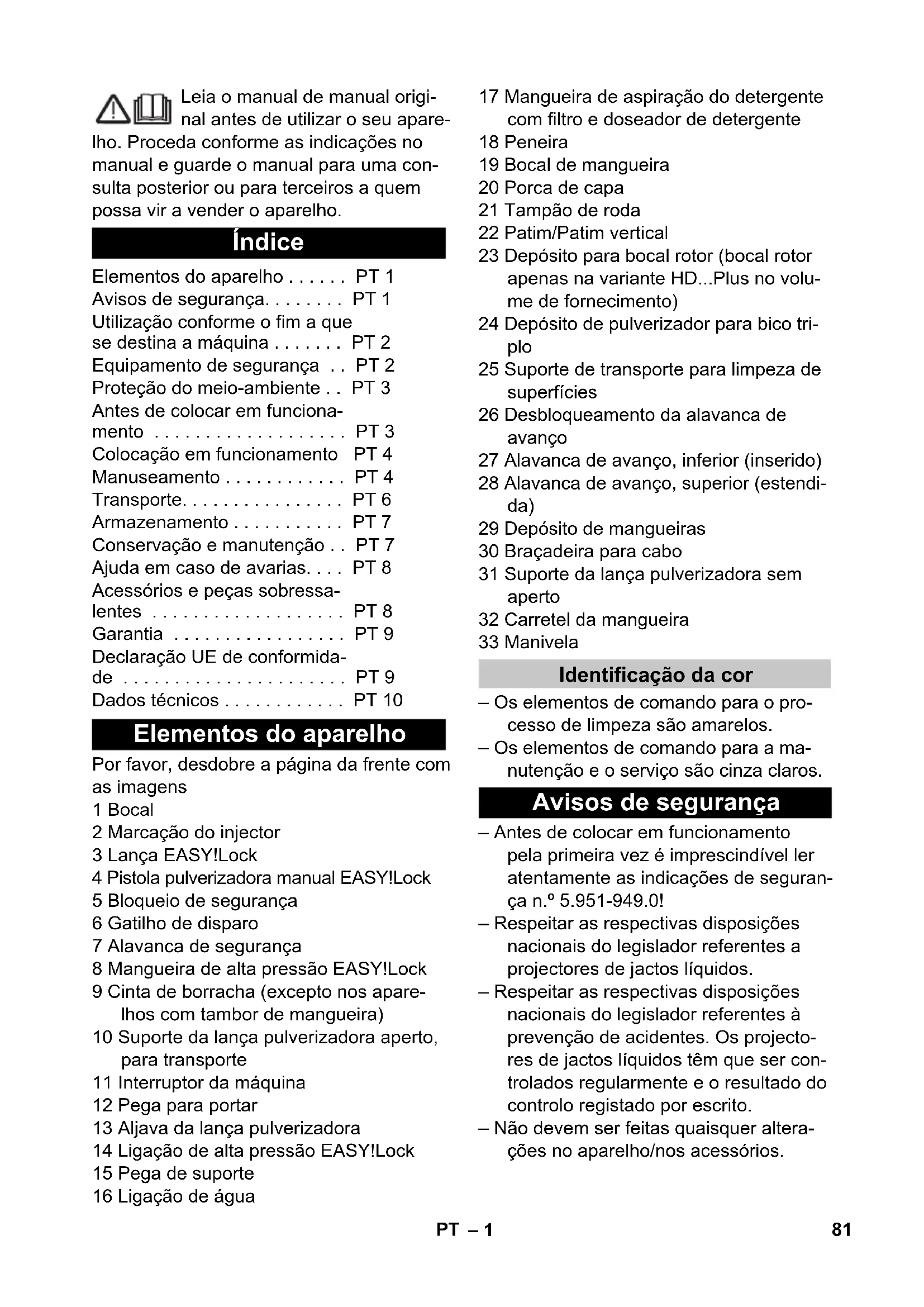 (CX) dB(A) 88 (92) 89 Medidas y pesos Longitud mm 380 Ancho (CX) mm 360 (370) Altura mm 930 Peso de funcionamiento típico (CX) kg 25,2 (27,5) 25,2 80 ES– 1 Leia o manual de manual origi- nal antes de utilizar o seu apare- lho. Proceda conforme as indicações no manual e guarde o manual para uma con- sulta posterior ou para terceiros a quem possa vir a vender o aparelho. Por favor, desdobre a página da frente com as imagens 1 Bocal 2 Marcação do injector 3 Lança EASY!Lock 4 Pistola pulverizadora manual EASY!Lock 5 Bloqueio de segurança 6 Gatilho de disparo 7 Alavanca de segurança 8 Mangueira de alta pressão EASY!Lock 9 Cinta de borracha (excepto nos apare- lhos com tambor de mangueira) 10 Suporte da lança pulverizadora aperto, para transporte 11 Interruptor da máquina 12 Pega para portar 13 Aljava da lança pulverizadora 14 Ligação de alta pressão EASY!Lock 15 Pega de suporte 16 Ligação de água 17 Mangueira de aspiração do detergente com filtro e doseador de detergente 18 Peneira 19 Bocal de mangueira 20 Porca de capa 21 Tampão de roda 22 Patim/Patim vertical 23 Depósito para bocal rotor (bocal rotor apenas na variante HD...Plus no volu- me de fornecimento) 24 Depósito de pulverizador para bico tri- plo 25 Suporte de transporte para limpeza de superfícies 26 Desbloqueamento da alavanca de avanço 27 Alavanca de avanço, inferior (inserido) 28 Alavanca de avanço, superior (estendi- da) 29 Depósito de mangueiras 30 Braçadeira para cabo 31 Suporte da lança pulverizadora sem aperto 32 Carretel da mangueira 33 Manivela – Os elementos de comando para o pro- cesso de limpeza são amarelos. – Os elementos de comando para a ma- nutenção e o serviço são cinza claros. – Antes de colocar em funcionamento pela primeira vez é imprescindível ler atentamente as indicações de seguran- ça n.º 5.951-949.0! – Respeitar as respectivas disposições nacionais do legislador referentes a projectores de jactos líquidos. – Respeitar as respectivas disposições nacionais do legislador referentes à prevenção de acidentes. Os projecto- res de jactos líquidos têm que ser con- trolados regularmente e o resultado do controlo registado por escrito. – Não devem ser feitas quaisquer altera- ções no aparelho/nos acessórios. Índice Elementos do aparelho . . . . . . PT 1 Avisos de segurança. . . . . . . . PT 1 Utilização conforme o fim a que se destina a máquina . . . . . . . PT 2 Equipamento de segurança . . PT 2 Proteção do meio-ambiente . . PT 3 Antes de colocar em funciona- mento . . . . . . . . . . . . . . . . . . . PT 3 Colocação em funcionamento PT 4 Manuseamento . . . . . . . . . . . . PT 4 Transporte. . . . . . . . . . . . . . . . PT 6 Armazenamento . . . . . . . . . . . PT 7 Conservação e manutenção . . PT 7 Ajuda em caso de avarias. . . . PT 8 Acessórios e peças sobressa- lentes . . . . . . . . . . . . . . . . . . . PT 8 Garantia . . . . . . . . . . . . . . . . . PT 9 Declaração UE de conformida- de . . . . . . . . . . . . . . . . . . . . . . PT 9 Dados técnicos . . . . . . . . . . . . PT 10 Elementos do aparelho Identificação da cor Avisos de segurança 81PT– 2 PERIGO Aviso referente a um perigo eminente que pode conduzir a graves ferimentos ou à morte. 몇 ATENÇÃO Aviso referente a uma possível situação perigosa que pode conduzir a graves feri- mentos ou à morte. 몇 CUIDADO Aviso referente a uma situação potencial- mente perigosa que pode causar ferimen- tos leves. ADVERTÊNCIA Aviso referente a uma situação potencial- mente perigosa que pode causar danos materiais. Os jactos de alta pressão podem ser perigosos em caso de uso in- correcto. O jacto não deve ser dirigido con- tra pessoas, animais, equipamento eléctri- co activo ou contra o próprio aparelho. De acordo com as prescrições em vigor o aparelho nunca pode ser li- gado à rede de água potável sem separador de sistema. Deve-se utilizar um separador de sistema adequado da firma KÄRCHER ou, alternativamente, um separador de sistema segundo EN 12729 tipo BA. A água que tenha entrado no separador de sistema é considerada imprópria para con- sumo. Utilizar exclusivamente esta lavadora de alta pressão – limpeza com jacto de baixa pressão e de- tergente (p. ex. limpeza de máquinas, veí- culos, construções, ferramentas), – limpeza com jacto de alta pressão sem detergente (p. ex. limpeza de facha- das, terraços, aparelhos de jardim). Para sujidade resistente aconselhamos um bocal rotor (apenas na variante HD...Plus no volume de fornecimento) Requisitos colocados à qualidade da água: ADVERTÊNCIA Como meio de alta pressão só pode ser uti- lizada água limpa. Sujidade provoca o des- gaste prematuro do aparelho ou depósitos. Se for utilizada água de reciclagem, os se- guintes valores-limite não podem ser ultra- passados. Os dispositivos de segurança servem para protecção do utilizador e não podem ser colocados fora de serviço nem sofrer alte- rações no seu funcionamento. Níveis do aparelho Símbolos no aparelho Utilização conforme o fim a que se destina a máquina Valor ph 6,5...9,5 Condutibilidade eléctrica * Condutibilida- de de água limpa +1200 μS/cm Substâncias depositáveis