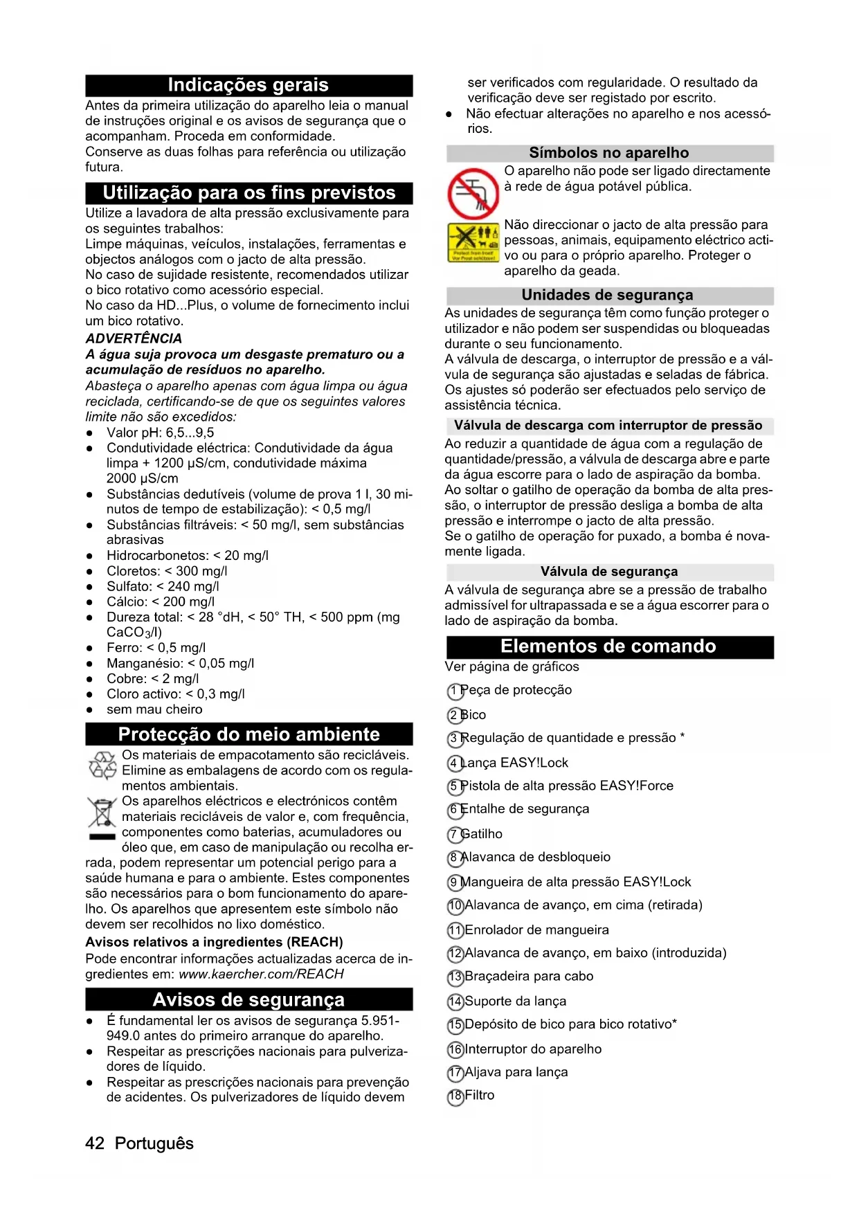 /l) ● Ferro: < 0,5 mg/l ● Manganésio: < 0,05 mg/l ● Cobre: < 2 mg/l ● Cloro activo: < 0,3 mg/l ● sem mau cheiro Protecção do meio ambiente Os materiais de empacotamento são recicláveis. Elimine as embalagens de acordo com os regula- mentos ambientais. Os aparelhos eléctricos e electrónicos contêm materiais recicláveis de valor e, com frequência, componentes como baterias, acumuladores ou óleo que, em caso de manipulação ou recolha er- rada, podem representar um potencial perigo para a saúde humana e para o ambiente. Estes componentes são necessários para o bom funcionamento do apare- lho. Os aparelhos que apresentem este símbolo não devem ser recolhidos no lixo doméstico. Avisos relativos a ingredientes (REACH) Pode encontrar informações actualizadas acerca de in- gredientes em: www.kaercher.com/REACH Avisos de segurança ● É fundamental ler os avisos de segurança 5.951-
