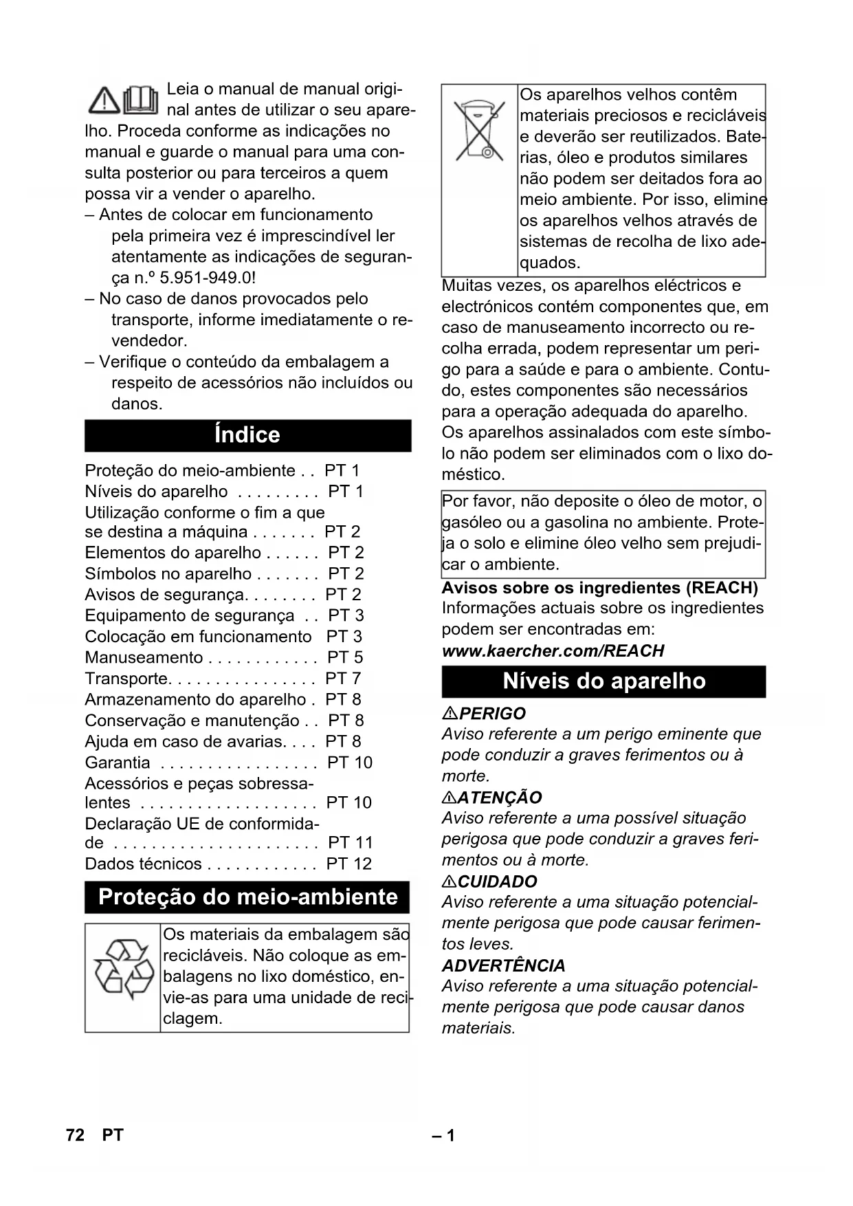 dB(A) 93 97 96 71ES– 1 Leia o manual de manual origi- nal antes de utilizar o seu apare- lho. Proceda conforme as indicações no manual e guarde o manual para uma con- sulta posterior ou para terceiros a quem possa vir a vender o aparelho. – Antes de colocar em funcionamento pela primeira vez é imprescindível ler atentamente as indicações de seguran- ça n.º 5.951-949.0! – No caso de danos provocados pelo transporte, informe imediatamente o re- vendedor. – Verifique o conteúdo da embalagem a respeito de acessórios não incluídos ou danos. Muitas vezes, os aparelhos eléctricos e electrónicos contém componentes que, em caso de manuseamento incorrecto ou re- colha errada, podem representar um peri- go para a saúde e para o ambiente. Contu- do, estes componentes são necessários para a operação adequada do aparelho. Os aparelhos assinalados com este símbo- lo não podem ser eliminados com o lixo do- méstico. Avisos sobre os ingredientes (REACH) Informações actuais sobre os ingredientes podem ser encontradas em: www.kaercher.com/REACH PERIGO Aviso referente a um perigo eminente que pode conduzir a graves ferimentos ou à morte. 몇 ATENÇÃO Aviso referente a uma possível situação perigosa que pode conduzir a graves feri- mentos ou à morte. 몇 CUIDADO Aviso referente a uma situação potencial- mente perigosa que pode causar ferimen- tos leves. ADVERTÊNCIA Aviso referente a uma situação potencial- mente perigosa que pode causar danos materiais. Índice Proteção do meio-ambiente . . PT 1 Níveis do aparelho . . . . . . . . . PT 1 Utilização conforme o fim a que se destina a máquina . . . . . . . PT 2 Elementos do aparelho . . . . . . PT 2 Símbolos no aparelho . . . . . . . PT 2 Avisos de segurança. . . . . . . . PT 2 Equipamento de segurança . . PT 3 Colocação em funcionamento PT 3 Manuseamento . . . . . . . . . . . . PT 5 Transporte. . . . . . . . . . . . . . . . PT 7 Armazenamento do aparelho . PT 8 Conservação e manutenção . . PT 8 Ajuda em caso de avarias. . . . PT 8 Garantia . . . . . . . . . . . . . . . . . PT 10 Acessórios e peças sobressa- lentes . . . . . . . . . . . . . . . . . . . PT 10 Declaração UE de conformida- de . . . . . . . . . . . . . . . . . . . . . . PT 11 Dados técnicos . . . . . . . . . . . . PT 12 Proteção do meio-ambiente Os materiais da embalagem são recicláveis. Não coloque as em- balagens no lixo doméstico, en- vie-as para uma unidade de reci- clagem. Os aparelhos velhos contêm materiais preciosos e recicláveis e deverão ser reutilizados. Bate- rias, óleo e produtos similares não podem ser deitados fora ao meio ambiente. Por isso, elimine os aparelhos velhos através de sistemas de recolha de lixo ade- quados. Por favor, não deposite o óleo de motor, o gasóleo ou a gasolina no ambiente. Prote- ja o solo e elimine óleo velho sem prejudi- car o ambiente. Níveis do aparelho 72 PT– 2 Utilize esta máquina de limpeza a alta pres- são exclusivamente: – para a limpeza de máquinas, veículos, construções e ferramentas. – com os acessórios e peças sobressa- lentes autorizados pela Kärcher. Figuras (veja página 2) 1 Pistola pulverizadora manual EASY!Force 2 Bloqueio de segurança 3 Gatilho de disparo 4 Alavanca de segurança 5 Acoplamento rotativo (excepto no HD 16/15-4 Cage) 6 Mangueira de alta pressão EASY!Lock 7 Contador das horas de serviço (opção) 8 Depósito para lanças 9 Alavanca de avanço 10 Suporte de mangueira/cabo 11 Interruptor da máquina 12 Bujão 13 Lâmpada de controlo do estado opera- tivo / avaria 14 Cabo de ligação à rede com ficha 15 Bocal de enchimento de óleo (depósito do óleo em HD 25/15-4) 16 Ligação da água com filtro 17 Regulação de pressão/débito 18 Compartimento acessórios 19 Parafuso de descarga de óleo 20 Indicador do nível de óleo 21 Ligação de alta pressão EASY!Lock 22 Manómetro 23 Tirante para transporte por grua 24 Bocal de alta potência com porca de capa 25 Lança EASY!Lock 26 Regulador rotativo de servopressão – Os elementos de comando para o pro- cesso de limpeza são amarelos. – Os elementos de comando para a ma- nutenção e o serviço são cinza claros. 몇 ATENÇÃO Respeite as normas da companhia de abastecimento de água. De acordo com as prescrições em vigor o aparelho nunca pode ser li- gado à rede de água potável sem separador de sistema. Deve-se utilizar um separador de sistema adequado da firma KÄRCHER ou, alternativamente, um separador de sistema segundo EN 12729 tipo BA. A água que tenha entrado no separador de sistema é considerada imprópria para con- sumo. 몇 CUIDADO Ligar o separador de sistema sempre à ali- mentação de água e nunca diretamente ao aparelho. PERIGO Perigo de lesões! – Utilizar exclusivamente mangueiras de alta pressão originais. – A mangueira de alta pressão e o dispo- sitivo de injecção têm que ser adequa- dos para a máxima pressão de serviço admissível referenciada nos Dados Técnicos. – Evitar o contacto com produtos quími- cos. Utilização conforme o fim a que se destina a máquina Elementos do aparelho Identificação da cor Símbolos no aparelho Os jactos de alta pressão podem ser perigosos em caso de uso incorrecto. O jacto não deve ser dirigi- do contra pessoas, ani- mais, equipamento eléc- trico activo ou contra o próprio aparelho. Perigo de danos causa- dos pelo congelamento de água! Durante o Inver- no, guardar o aparelho numa zona aquecida ou esvaziar totalmente a água. Avisos de segurança 73PT– 3 – Controlar diariamente a mangueira de alta pressão. Mangueiras com vincos não devem ser utilizadas. Se for visível o reforço exterior de ara- me, a mangueira de alta pressão não pode ser utilizada. – Mangueiras de alta pressão com as roscas danificadas não podem ser utili- zadas. – Colocar a mangueira de alta pressão de modo a que esta não possa ser pisada. – Uma mangueira que tenha sido pisada, dobrada ou que tenha sofrido cho