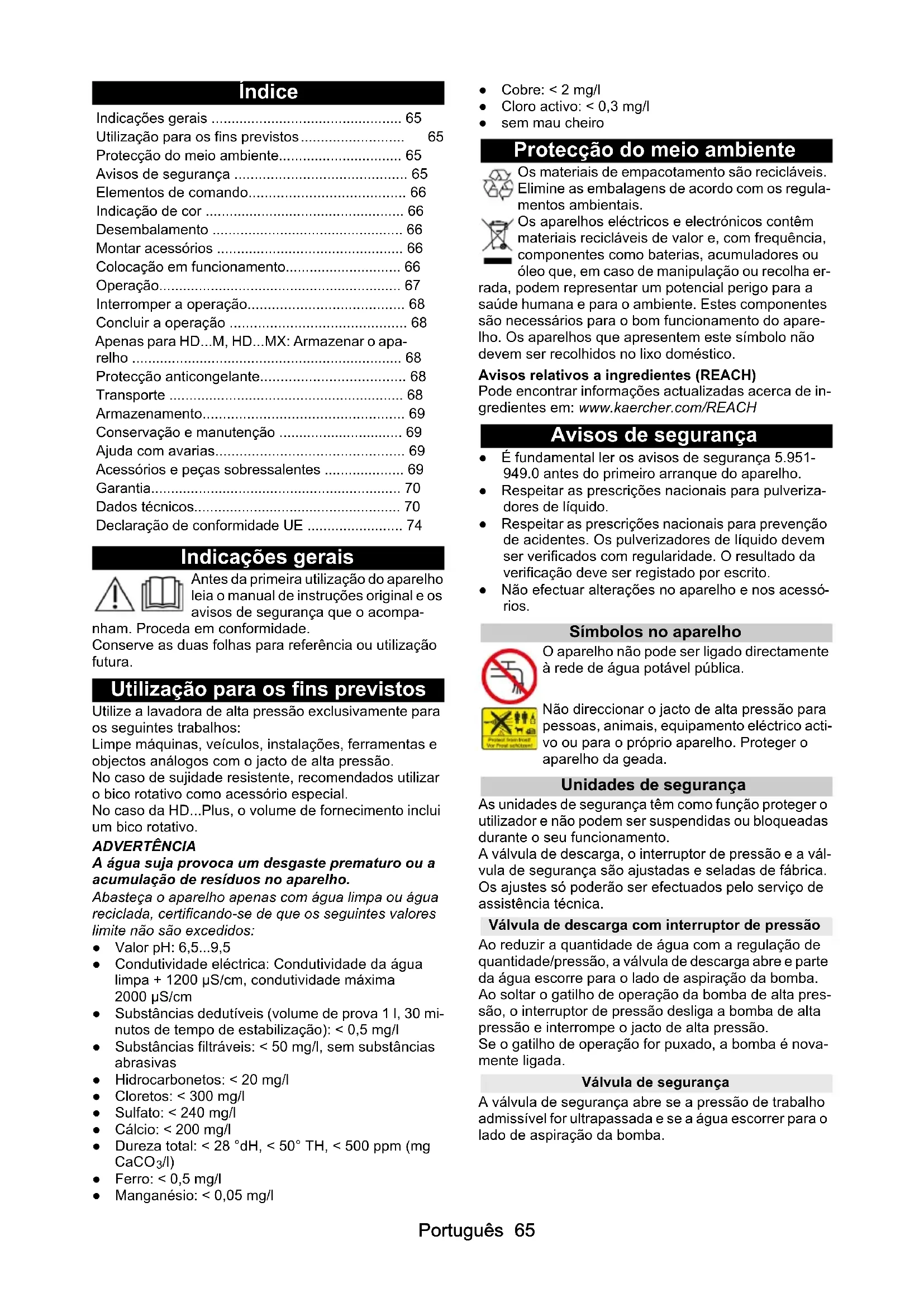 HD 8/18-4 M St HD 8/18-4 M St HD 8/18- 4MPortuguês 65 Índice Indicações gerais Antes da primeira utilização do aparelho leia o manual de instruções original e os avisos de segurança que o acompa- nham. Proceda em conformidade. Conserve as duas folhas para referência ou utilização futura. Utilização para os fins previstos Utilize a lavadora de alta pressão exclusivamente para os seguintes trabalhos: Limpe máquinas, veículos, instalações, ferramentas e objectos análogos com o jacto de alta pressão. No caso de sujidade resistente, recomendados utilizar o bico rotativo como acessório especial. No caso da HD...Plus, o volume de fornecimento inclui um bico rotativo. ADVERTÊNCIA A água suja provoca um desgaste prematuro ou a acumulação de resíduos no aparelho. Abasteça o aparelho apenas com água limpa ou água reciclada, certificando-se de que os seguintes valores limite não são excedidos: ● Valor pH: 6,5...9,5 ● Condutividade eléctrica: Condutividade da água limpa + 1200 µS/cm, condutividade máxima 2000 µS/cm ● Substâncias dedutíveis (volume de prova 1 l, 30 mi- nutos de tempo de estabilização): < 0,5 mg/l ● Substâncias filtráveis: < 50 mg/l, sem substâncias abrasivas ● Hidrocarbonetos: < 20 mg/l ● Cloretos: < 300 mg/l ● Sulfato: < 240 mg/l ● Cálcio: < 200 mg/l ● Dureza total: < 28 °dH, < 50° TH, < 500 ppm (mg CaCO