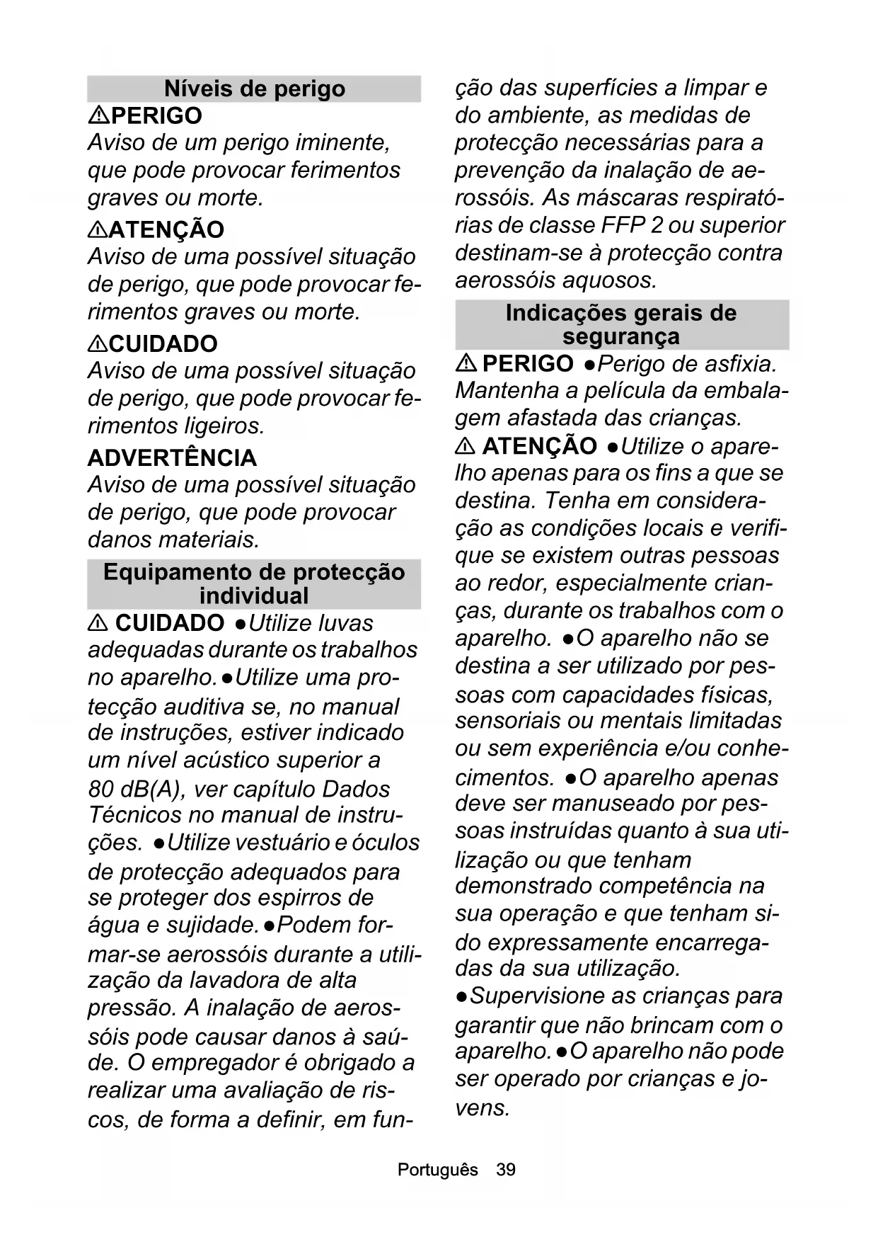 몇 АБАЙЛАҢЫЗ   ●Тасымалдау алдында құрылғыны өшіру керек. Құрылғыны салмағын ескеріп бекіту туралы ақпаратты пайдалану нұсқаулығындағы Техникалық сипаттар бөлімінен қараңыз. ●Жарақат пен төтенше жағдайлар қаупі. Тасымалдау жəне сақтау кезінде құрылғының салмағын есепке алыңыз, Пайдалану нұсқаулығындағы Техникалық сипаттар бөлімін қараңыз. Avisos de segurança Lavadora de alta pressão Leia estes avisos de segurança e o manual de instruções original antes de usar o aparelho pela primeira vez. Aja de acordo. Guarde am- bos os documentos para uso fu- turo ou para o proprietário seguinte. Além dos avisos no manual de instruções, você também deve observar os regulamen- tos de segurança e prevenção de acidentes gerais do legisla- dor. As placas e sinais de aviso instaladas no aparelho forne- cem informações importantes para a operação sem perigo. Níveis de perigo PERIGO Aviso de um perigo eminente que pode causar ferimentos gra- ves ou até a morte. 몇 ATENÇÃO Aviso de uma situação possivel- mente perigosa que pode cau- sar ferimentos graves ou até a morte. 몇 CUIDADO Aviso de uma situação possivel- mente perigosa que pode cau- sar ferimentos leves. ADVERTÊNCIA Aviso de uma situação possivel- mente perigosa que pode cau- sar danos materiais. Equipamento de proteção individual 몇 CUIDADO  ●Durante os tra- balhos no aparelho, utilize luvas adequadas. ●Utilize uma prote- ção auditiva, se o manual de instruções indicar um nível de pressão acústica superior a 80 dB(A); consulte o capítulo Dados técnicos do manual de instruções.  ●Use as roupas de proteção e óculos de proteção adequados para se proteger contra respingos de água ou su- jeira. ●Durante a utilização das lavadoras de alta pressão po- dem surgir aerossóis. A aspira- ção de aerossóis pode ser perigosa para a saúde. A entida- de patronal é obrigada a realizarPortuguês do Brasil 203 uma avaliação preliminar dos perigos, a fim de poder tomar as medidas de proteção necessá- rias contra a aspiração de ae- rossóis. As máscaras de proteção da classe FFP 2 ou su- periores são adequadas para a proteção contra aerossóis líqui- dos. Avisos gerais de segurança PERIGO  ●Risco de asfixia. Mantenha os plásticos da emba- lagem fora do alcance das crian- ças. 몇 ATENÇÃO  ●Utilize o apare- lho somente de acordo com o uso previsto. Considere também as propriedades locais e obser- ve se há terceiros ou crianças na área ao trabalhar com o equi- pamento.  ●O aparelho não é adequado para a utilização por pessoas com capacidades físi- cas, sensoriais ou psíquicas re- duzidas, bem como por pessoas com falta de experiência e/ou conhecimentos.  ●Devem utilizar o aparelho apenas pessoas que tenham sido instruídas sobre a manipulação do aparelho ou que tenham comprovado capa- cidade para operá-lo e que se- jam expressamente autorizadas a utilizarem-no. ●Vigie as crian- ças para que elas não brinquem com o aparelho. ●O aparelho não pode ser operado por crian- ças nem adolescentes. 몇 CUIDADO  ●As unidades de segurança servem para prote- ger. Nunca altere ou ignore as unidades de segurança. Perigo de choque elétrico PERIGO  ●Conecte os apare- lhos de classe de proteção I so- mente a fontes de corrente aterradas adequadamente. ●A tensão indicada na placa de identificação deve corresponder à tensão da fonte de alimenta- ção. ●Observe a proteção por fusível mínima da tomada, con- sulte o capítulo Dados técnicos no manual de instruções. ●Ope- re o aparelho somente por meio de um disjuntor diferencial (má- ximo 30 mA). ●Nunca toque nas tomadas ou conectores com as mãos úmidas. ●A tomada e o acoplamento de uma linha de extensão devem ser estanques e não podem ficar na água. O acoplamento não pode ficar no chão. Utilize o tambor de cabo que garantem que as tomadas fiquem a pelo menos 60 mm aci- ma do solo. ●Todas as peças condutoras de tensão na área de trabalho devem ser protegi- das contra jatos de água. 몇 ATENÇÃO  ●Conecte o apa- relho somente a uma conexão elétrica feita por um técnico ele- tricista de acordo com IEC 60364-1. ●Verifique se há danos no cabo de ligação à rede204 Português do Brasil com tomada antes de cada ope- ração. Não opere um aparelho com cabo de ligação à rede da- nificado. Solicite a substituição do cabo de ligação à rede dani- ficado imediatamente por meio da assistência técnica autorizada /do técnico eletricis- ta.  ●Não danifique a linha de ex- tensão ou de ligação à rede ao passar por cima dela, amassá- la, puxá-la ou algo semelhante. Proteja o cabo de ligação à rede contra o calor, óleo e arestas afiadas. ●Utilize apenas os ca- bos de ligação predefinidos pelo fabricante, isto também é válido para a substituição do cabo. Pa- ra n.º de encomenda e tipo, con- sulte o Manual de instruções.  ●Cabos de extensão elétricos inapropriados podem ser peri- gosos. Ao ar livre, utilizar unica- mente cabos de extensão elétricos com uma seção trans- versal suficiente e devidamente homologados e marcados.  ●Substitua os acoplamentos do cabo de ligação à rede ou de ex- tensão somente por modelos com a mesma impermeabilida- de e mesma resistência mecâni- ca. 몇 CUIDADO  ●Em caso de lon- gas pausas de operação e após a utilização, desligue o aparelho no interruptor principal / inter- ruptor do aparelho e puxe o co- nector da tomada. ADVERTÊNCIA  ●Os proces- sos de ligação geram quedas de energia momentâneas. ●Em ca- so de condições de rede desfa- voráveis, podem