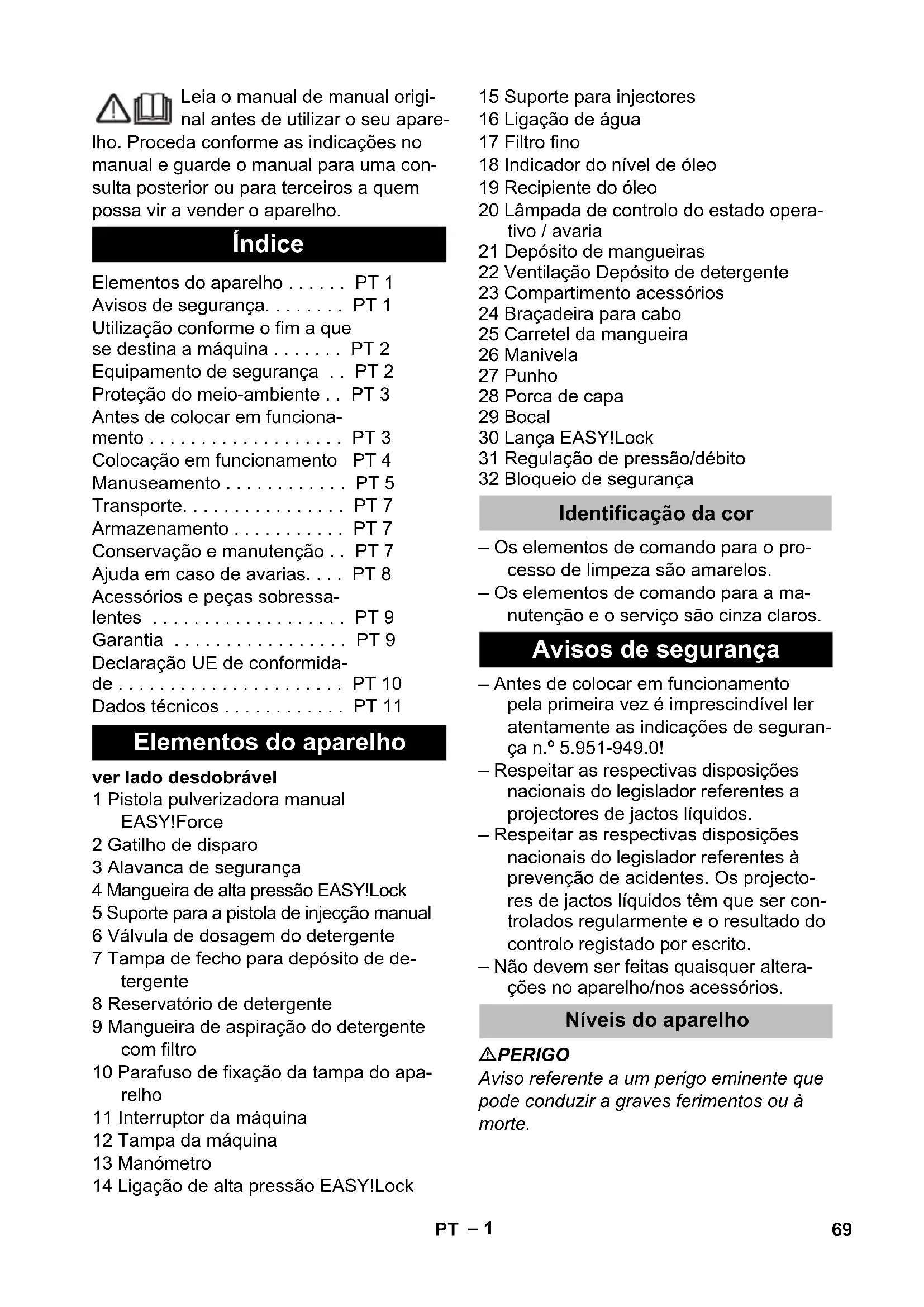 - 1.286-902.0: 75,5 kg; 1.286-903.0: 75,7 kg; 1.286-913.0: 69,1 kg; 1.286-927: 82,5 kg ** 1.286-914.0: 77,5 kg; 1.286-928.0: 86 kg 68 ES– 1 Leia o manual de manual origi- nal antes de utilizar o seu apare- lho. Proceda conforme as indicações no manual e guarde o manual para uma con- sulta posterior ou para terceiros a quem possa vir a vender o aparelho. ver lado desdobrável 1 Pistola pulverizadora manual EASY!Force 2 Gatilho de disparo 3 Alavanca de segurança 4 Mangueira de alta pressão EASY!Lock 5 Suporte para a pistola de injecção manual 6 Válvula de dosagem do detergente 7 Tampa de fecho para depósito de de- tergente 8 Reservatório de detergente 9 Mangueira de aspiração do detergente com filtro 10 Parafuso de fixação da tampa do apa- relho 11 Interruptor da máquina 12 Tampa da máquina 13 Manómetro 14 Ligação de alta pressão EASY!Lock 15 Suporte para injectores 16 Ligação de água 17 Filtro fino 18 Indicador do nível de óleo 19 Recipiente do óleo 20 Lâmpada de controlo do estado opera- tivo / avaria 21 Depósito de mangueiras 22 Ventilação Depósito de detergente 23 Compartimento acessórios 24 Braçadeira para cabo 25 Carretel da mangueira 26 Manivela 27 Punho 28 Porca de capa 29 Bocal 30 Lança EASY!Lock 31 Regulação de pressão/débito 32 Bloqueio de segurança – Os elementos de comando para o pro- cesso de limpeza são amarelos. – Os elementos de comando para a ma- nutenção e o serviço são cinza claros. – Antes de colocar em funcionamento pela primeira vez é imprescindível ler atentamente as indicações de seguran- ça n.º 5.951-949.0! – Respeitar as respectivas disposições nacionais do legislador referentes a projectores de jactos líquidos. – Respeitar as respectivas disposições nacionais do legislador referentes à prevenção de acidentes. Os projecto- res de jactos líquidos têm que ser con- trolados regularmente e o resultado do controlo registado por escrito. – Não devem ser feitas quaisquer altera- ções no aparelho/nos acessórios. PERIGO Aviso referente a um perigo eminente que pode conduzir a graves ferimentos ou à morte. Índice Elementos do aparelho . . . . . . PT 1 Avisos de segurança. . . . . . . . PT 1 Utilização conforme o fim a que se destina a máquina . . . . . . . PT 2 Equipamento de segurança . . PT 2 Proteção do meio-ambiente . . PT 3 Antes de colocar em funciona- mento . . . . . . . . . . . . . . . . . . . PT 3 Colocação em funcionamento PT 4 Manuseamento . . . . . . . . . . . . PT 5 Transporte. . . . . . . . . . . . . . . . PT 7 Armazenamento . . . . . . . . . . . PT 7 Conservação e manutenção . . PT 7 Ajuda em caso de avarias. . . . PT 8 Acessórios e peças sobressa- lentes . . . . . . . . . . . . . . . . . . . PT 9 Garantia . . . . . . . . . . . . . . . . . PT 9 Declaração UE de conformida- de . . . . . . . . . . . . . . . . . . . . . . PT 10 Dados técnicos . . . . . . . . . . . . PT 11 Elementos do aparelho Identificação da cor Avisos de segurança Níveis do aparelho 69PT– 2 몇 ATENÇÃO Aviso referente a uma possível situação perigosa que pode conduzir a graves feri- mentos ou à morte. 몇 CUIDADO Aviso referente a uma situação potencial- mente perigosa que pode causar ferimen- tos leves. ADVERTÊNCIA Aviso referente a uma situação potencial- mente perigosa que pode causar danos materiais. Os jactos de alta pressão podem ser perigosos em caso de uso in- correcto. O jacto não deve ser dirigido con- tra pessoas, animais, equipamento eléctri- co activo ou contra o próprio aparelho. De acordo com as prescrições em vigor o aparelho nunca pode ser li- gado à rede de água potável sem separador de sistema. Deve-se utilizar um separador de sistema adequado da firma KÄRCHER ou, alternativamente, um separador de sistema segundo EN 12729 tipo BA. A água que tenha entrado no separador de sistema é considerada imprópria para con- sumo. 몇 CUIDADO Ligar o separador de sistema sempre à ali- mentação de água e nunca diretamente ao aparelho. Utilizar exclusivamente esta lavadora de alta pressão – limpeza com jacto de baixa pressão e de- tergente (p. ex. limpeza de máquinas, ve- ículos, construções, ferramentas), – limpeza com jacto de alta pressão sem detergente (p. ex. limpeza de facha- das, terraços, aparelhos de jardim). No caso de sujidade de difícil remoção, re- comendamos a utilização da fresadora de sujidade, como acessório especial. Requisitos colocados à qualidade da água: ADVERTÊNCIA Como meio de alta pressão só pode ser uti- lizada água limpa. Sujidade provoca o des- gaste prematuro do aparelho ou depósitos. Se for utilizada água de reciclagem, os se- guintes valores-limite não podem ser ultra- passados. Os dispositivos de segurança destinam-se a proteger o utilizador e não devem, por is- so, ser anulados ou evitado o seu funciona- mento. Símbolos no aparelho Utilização conforme o fim a que se destina a máquina Valor ph 6,5...9,5 Condutibilidade eléctrica * Condutibilida- de de água limpa +1200 µS/cm Substâncias depositáveis