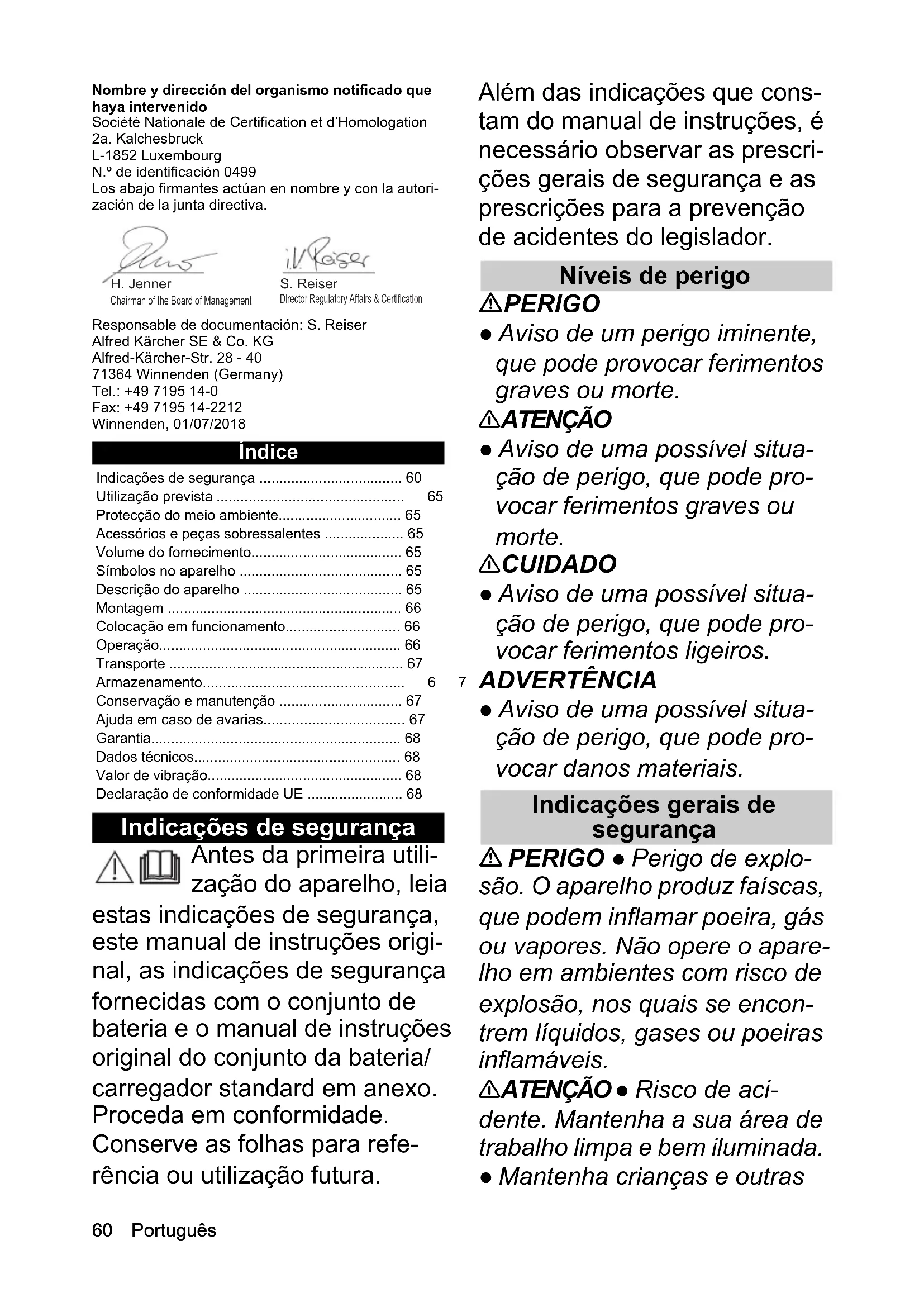 • 1,5 Peso y dimensiones Longitud x anchura x altura mm 1329 x 3 12 x 327 Peso (sin batería) kg 2,260 Português Nombre y dirección del organismo notificado que haya intervenido Société Nationale de Certification et d’Homologation 2a. Kalchesbruck L-1852 Luxembourg N.º de identificación 0499 Los abajo firmantes actúan en nombre y con la autori- zación de la junta directiva. Responsable de documentación: S. Reiser Alfred Kärcher SE & Co. KG Alfred-Kärcher-Str. 28 - 40 71364 Winnenden (Germany) Tel.: +49 7195 14-0 Fax: +49 7195 14-2212 Winnenden, 01/07/2018 Índice Indicações de segurança Antes da primeira utili- zação do aparelho, leia estas indicações de segurança, este manual de instruções origi- nal, as indicações de segurança fornecidas com o conjunto de bateria e o manual de instruções original do conjunto da bateria/ carregador standard em anexo. Proceda em conformidade. Conserve as folhas para refe- rência ou utilização futura. Além das indicações que cons- tam do manual de instruções, é necessário observar as prescri- ções gerais de segurança e as prescrições para a prevenção de acidentes do legislador. Níveis de perigo PERIGO ● Aviso de um perigo iminente, que pode provocar ferimentos graves ou morte. 몇 ATENÇÃO ● Aviso de uma possível situa- ção de perigo, que pode pro- vocar ferimentos graves ou morte. 몇 CUIDADO ● Aviso de uma possível situa- ção de perigo, que pode pro- vocar ferimentos ligeiros. ADVERTÊNCIA ● Aviso de uma possível situa- ção de perigo, que pode pro- vocar danos materiais. Indicações gerais de segurança PERIGO ● Perigo de explo- são. O aparelho produz faíscas, que podem inflamar poeira, gás ou vapores. Não opere o apare- lho em ambientes com risco de explosão, nos quais se encon- trem líquidos, gases ou poeiras inflamáveis. 몇 ATENÇÃO ● Risco de aci- dente. Mantenha a sua área de trabalho limpa e bem iluminada. ● Mantenha crianças e outras Indicações de segurança p. 60