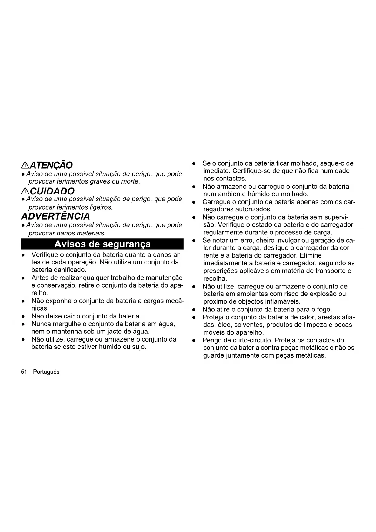 uso. Datos técnicos 18/25 18/50 36/25 36/50 Conexión eléctrica Tensión nominal de la batería V 18 18 36 36 Plataforma de la batería Battery Power Battery Power Battery Power Battery Power Compatible con plataforma de batería Battery Power + Battery Power + Battery Power + Battery Power +Português 50 Reservado el derecho de realizar modificaciones técni- cas. Indicações gerais Antes da primeira utilização do conjunto da bateria, leia este manual original e o manual original do aparelho/ carregador KÄRCHER Battery Power/Battery Power+, no qual o conjunto da bateria deve ser utilizado ou car- regado. Conserve todas as folhas para uso posterior ou para proprietários futuros. Níveis de perigo PERIGO ● Aviso de um perigo iminente, que pode provocar feri- mentos graves ou morte. Tipo de batería Li-ION Li-ION Li-ION Li-ION Capacidad nominal (según IEC/EN 61960) Ah 2,5 5,0 2,5 5,0 Energía nominal Wh 45 90 90 180 Corriente de carga máx. A 3,5 7,5 3,5 7,5 Peso y dimensiones Peso kg 0,5 0,8 0,9 1,5 Temperatura de servicio °C -20 - 40 -20 - 40 -20 - 40 -20 - 40 Temperatura de carga °C 4 - 40 4 - 40 4 - 40 4 - 40 Temperatura de almacenamiento °C -20 - 60 -20 - 60 -20 - 60 -20 - 60 Longitud x anchura x altura mm 133 x 88 x 50 133 x 88 x 72 133 x 88 x 72 133 x 88 x 117,5 18/25 18/50 36/25 36/5051 Português 몇 ATENÇÃO ● Aviso de uma possível situação de perigo, que pode provocar ferimentos graves ou morte. 몇 CUIDADO ● Aviso de uma possível situação de perigo, que pode provocar ferimentos ligeiros. ADVERTÊNCIA ● Aviso de uma possível situação de perigo, que pode provocar danos materiais. Avisos de segurança ● Verifique o conjunto da bateria quanto a danos an- tes de cada operação. Não utilize um conjunto da bateria danificado. ● Antes de realizar qualquer trabalho de manutenção e conservação, retire o conjunto da bateria do apa- relho. ● Não exponha o conjunto da bateria a cargas mecâ- nicas. ● Não deixe cair o conjunto da bateria. ● Nunca mergulhe o conjunto da bateria em água, nem o mantenha sob um jacto de água. ● Não utilize, carregue ou armazene o conjunto da bateria se este estiver húmido ou sujo. ● Se o conjunto da bateria ficar molhado, seque-o de imediato. Certifique-se de que não fica humidade nos contactos. ● Não armazene ou carregue o conjunto da bateria num ambiente húmido ou molhado. ● Carregue o conjunto da bateria apenas com os car- regadores autorizados. ● Não carregue o conjunto da bateria sem supervi- são. Verifique o estado da bateria e do carregador regularmente durante o processo de carga. ● Se notar um erro, cheiro invulgar ou geração de ca- lor durante a carga, desligue o carregador da cor- rente e a bateria do carregador. Elimine imediatamente a bateria e carregador, seguindo as prescrições aplicáveis em matéria de transporte e recolha. ● Não utilize, carregue ou armazene o conjunto de bateria em ambientes com risco de explosão ou próximo de objectos inflamáveis. ● Não atire o conjunto da bateria para o fogo. ● Proteja o conjunto da bateria de calor, arestas afia- das, óleo, solventes, produtos de limpeza e peças móveis do aparelho. ● Perigo de curto-circuito. Proteja os contactos do conjunto da bateria contra peças metálicas e não os guarde juntamente com peças metálicas.Português 52 ● Não abrir o conjunto da bateria. As reparações de- vem ser realizadas apenas por pessoal técnico. ● Evite o contacto com o líquido que verte de baterias com defeito. Em caso de contacto com o líquido, en- xagúe com água e, em caso de contacto com os olhos, consulte também um médico. ● Recolha o conjunto da bateria no final da sua vida útil, de acordo com as prescrições aplicáveis. Avisos de segurança para o transporte A bateria de iões de lítio está sujeita aos requisitos da legislação relativa a matérias perigosas. Um conjunto da bateria não danificado e a funcionar po- de ser transportado pelo utilizador em transportes públi- cos, sem restrições adicionais. Observe os requisitos especiais de embalagem e iden- tificação em caso de envio por meio de terceiros (trans- portadoras). Não envie o conjunto da bateria se a carcaça estiver da- nificada. Cole os contactos expostos. Embale o conjunto da bateria de forma fixa e segura. O conjunto da bateria não poderá deslocar-se dentro da embalagem. PERIGO ● Não deve ser enviado um conjunto de bateria com de- feito ou não funcional e deve ser recolhida no local de acordo com as prescrições aplicáveis. Respeite as prescrições nacionais. Utilização prevista 몇 CUIDADO Perigo de explosão! Ferimentos e danos resultantes da explosão do conjun- to da bateria. Carregue, utilize e armazene apenas conjuntos de ba- teria não danificados e totalmente funcionais. São proibidas quaisquer modificações ou alterações não autorizadas pelo fabricante. Não é permitido qualquer outro tipo de utilização. Os perigos que sejam resultado de uma utilização inadmis- sível são da responsabilidade do utilizador. Carregue e utilize o conjunto da bateria apenas com aparelhos do sistema KÄRCHER 18 V/36 V Battery Power/Battery Power +. ADVERTÊNCIA Os conjuntos de bateria só podem ser usados com apa- relhos com o mesmo tipo de tensão (18 V ou 36 V)! Não utilize ou carregue conjuntos de bateria com dispositi- vos com um tipo de tensão diferente.53 Português Antes da utilização, verifique se o tipo de tensão (18 V/ 36 V) da bateria e do aparelho correspondem. As informações relativas à tensão podem ser encontra- das no aparelho, na bateria e na placa de característi- cas. Protecção do meio ambiente Os materiais de empacotamento são recicláveis. Não deite as embalagens no lixo doméstico e providencie a sua reutilização. Os aparelhos usados contêm valiosos materiais recicláveis, que devem ser encaminhados para a reciclagem. As baterias e conjuntos de baterias contêm substâncias 