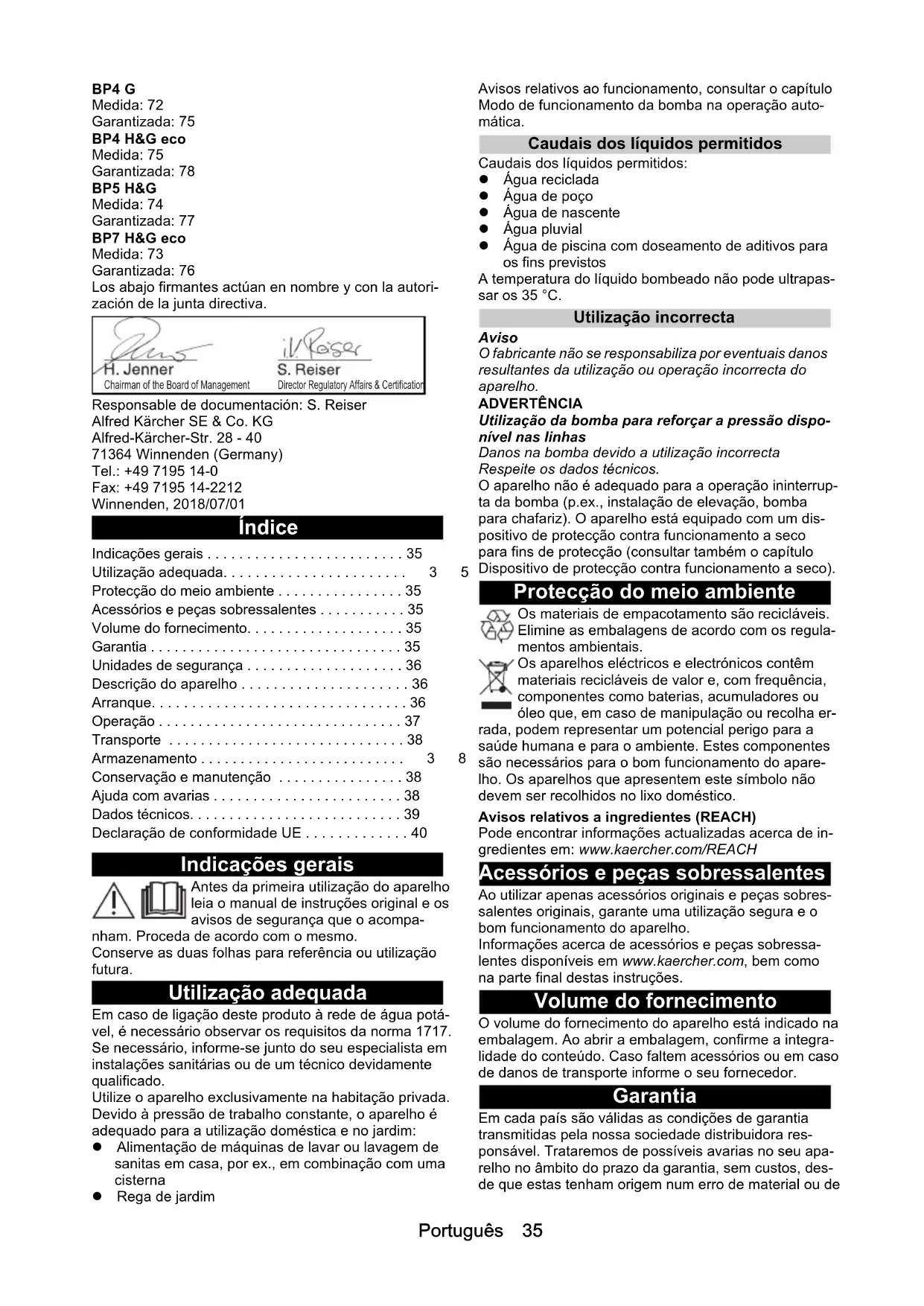 - dB(A) 61 63 61 61 dB(A) 76 78 77 76Português 35 BP4 G Medida: 72 Garantizada: 75 BP4 H&G eco Medida: 75 Garantizada: 78 BP5 H&G Medida: 74 Garantizada: 77 BP7 H&G eco Medida: 73 Garantizada: 76 Los abajo firmantes actúan en nombre y con la autori- zación de la junta directiva. Responsable de documentación: S. Reiser Alfred Kärcher SE & Co. KG Alfred-Kärcher-Str. 28 - 40 71364 Winnenden (Germany) Tel.: +49 7195 14-0 Fax: +49 7195 14-2212 Winnenden, 2018/07/01 Índice Indicações gerais Antes da primeira utilização do aparelho leia o manual de instruções original e os avisos de segurança que o acompa- nham. Proceda de acordo com o mesmo. Conserve as duas folhas para referência ou utilização futura. Utilização adequada Em caso de ligação deste produto à rede de água potá- vel, é necessário observar os requisitos da norma 1717. Se necessário, informe-se junto do seu especialista em instalações sanitárias ou de um técnico devidamente qualificado. Utilize o aparelho exclusivamente na habitação privada. Devido à pressão de trabalho constante, o aparelho é adequado para a utilização doméstica e no jardim: Alimentação de máquinas de lavar ou lavagem de sanitas em casa, por ex., em combinação com uma cisterna Rega de jardim Avisos relativos ao funcionamento, consultar o capítulo Modo de funcionamento da bomba na operação auto- mática. Caudais dos líquidos permitidos Caudais dos líquidos permitidos: Água reciclada Água de poço Água de nascente Água pluvial Água de piscina com doseamento de aditivos para os fins previstos A temperatura do líquido bombeado não pode ultrapas- sar os 35 °C. Utilização incorrecta Aviso O fabricante não se responsabiliza por eventuais danos resultantes da utilização ou operação incorrecta do aparelho. ADVERTÊNCIA Utilização da bomba para reforçar a pressão dispo- nível nas linhas Danos na bomba devido a utilização incorrecta Respeite os dados técnicos. O aparelho não é adequado para a operação ininterrup- ta da bomba (p.ex., instalação de elevação, bomba para chafariz). O aparelho está equipado com um dis- positivo de protecção contra funcionamento a seco para fins de protecção (consultar também o capítulo Dispositivo de protecção contra funcionamento a seco). Protecção do meio ambiente Os materiais de empacotamento são recicláveis. Elimine as embalagens de acordo com os regula- mentos ambientais. Os aparelhos eléctricos e electrónicos contêm materiais recicláveis de valor e, com frequência, componentes como baterias, acumuladores ou óleo que, em caso de manipulação ou recolha er- rada, podem representar um potencial perigo para a saúde humana e para o ambiente. Estes componentes são necessários para o bom funcionamento do apare- lho. Os aparelhos que apresentem este símbolo não devem ser recolhidos no lixo doméstico. Avisos relativos a ingredientes (REACH) Pode encontrar informações actualizadas acerca de in- gredientes em: www.kaercher.com/REACH Acessórios e peças sobressalentes Ao utilizar apenas acessórios originais e peças sobres- salentes originais, garante uma utilização segura e o bom funcionamento do aparelho. Informações acerca de acessórios e peças sobressa- lentes disponíveis em www.kaercher.com, bem como na parte final destas instruções. Volume do fornecimento O volume do fornecimento do aparelho está indicado na embalagem. Ao abrir a embalagem, confirme a integra- lidade do conteúdo. Caso faltem acessórios ou em caso de danos de transporte informe o seu fornecedor. Garantia Em cada país são válidas as condições de garantia transmitidas pela nossa sociedade distribuidora res- ponsável. Trataremos de possíveis avarias no seu apa- relho no âmbito do prazo da garantia, sem custos, des- de que estas tenham origem num erro de material ou de Indicações gerais p. 35