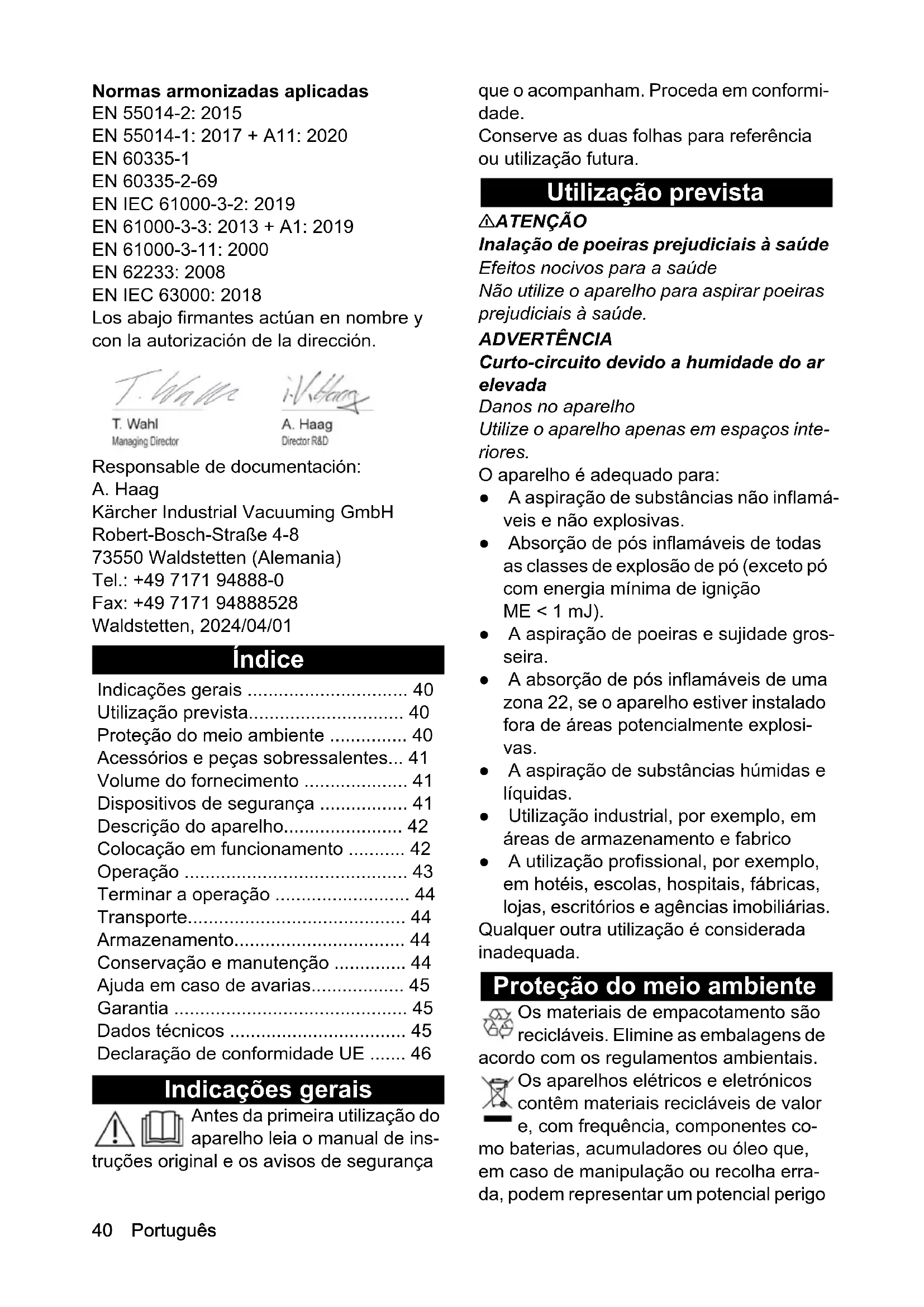 - EN 61000-3-3: 2013 + A1: 2019 EN 61000-3-11: 2000 EN 62233: 2008 EN IEC 63000: 2018 Los abajo firmantes actúan en nombre y con la autorización de la dirección. Responsable de documentación: A. Haag Kärcher Industrial Vacuuming GmbH Robert-Bosch-Straße 4-8 73550 Waldstetten (Alemania) Tel.: +49 7171 94888-0 Fax: +49 7171 94888528 Waldstetten, 2024/04/01 Índice Indicações gerais Antes da primeira utilização do aparelho leia o manual de ins- truções original e os avisos de segurança que o acompanham. Proceda em conformi- dade. Conserve as duas folhas para referência ou utilização futura. Utilização prevista 몇 ATENÇÃO Inalação de poeiras prejudiciais à saúde Efeitos nocivos para a saúde Não utilize o aparelho para aspirar poeiras prejudiciais à saúde. ADVERTÊNCIA Curto-circuito devido a humidade do ar elevada Danos no aparelho Utilize o aparelho apenas em espaços inte- riores. O aparelho é adequado para: ● A aspiração de substâncias não inflamá- veis e não explosivas. ● Absorção de pós inflamáveis de todas as classes de explosão de pó (exceto pó com energia mínima de ignição ME < 1 mJ). ● A aspiração de poeiras e sujidade gros- seira. ● A absorção de pós inflamáveis de uma zona 22, se o aparelho estiver instalado fora de áreas potencialmente explosi- vas. ● A aspiração de substâncias húmidas e líquidas. ● Utilização industrial, por exemplo, em áreas de armazenamento e fabrico ● A utilização profissional, por exemplo, em hotéis, escolas, hospitais, fábricas, lojas, escritórios e agências imobiliárias. Qualquer outra utilização é considerada inadequada. Proteção do meio ambiente Os materiais de empacotamento são recicláveis. Elimine as embalagens de acordo com os regulamentos ambientais. Os aparelhos elétricos e eletrónicos contêm materiais recicláveis de valor e, com frequência, componentes co- mo baterias, acumuladores ou óleo que, em caso de manipulação ou recolha erra- da, podem representar um potencial perigo Indicações gerais p. 40