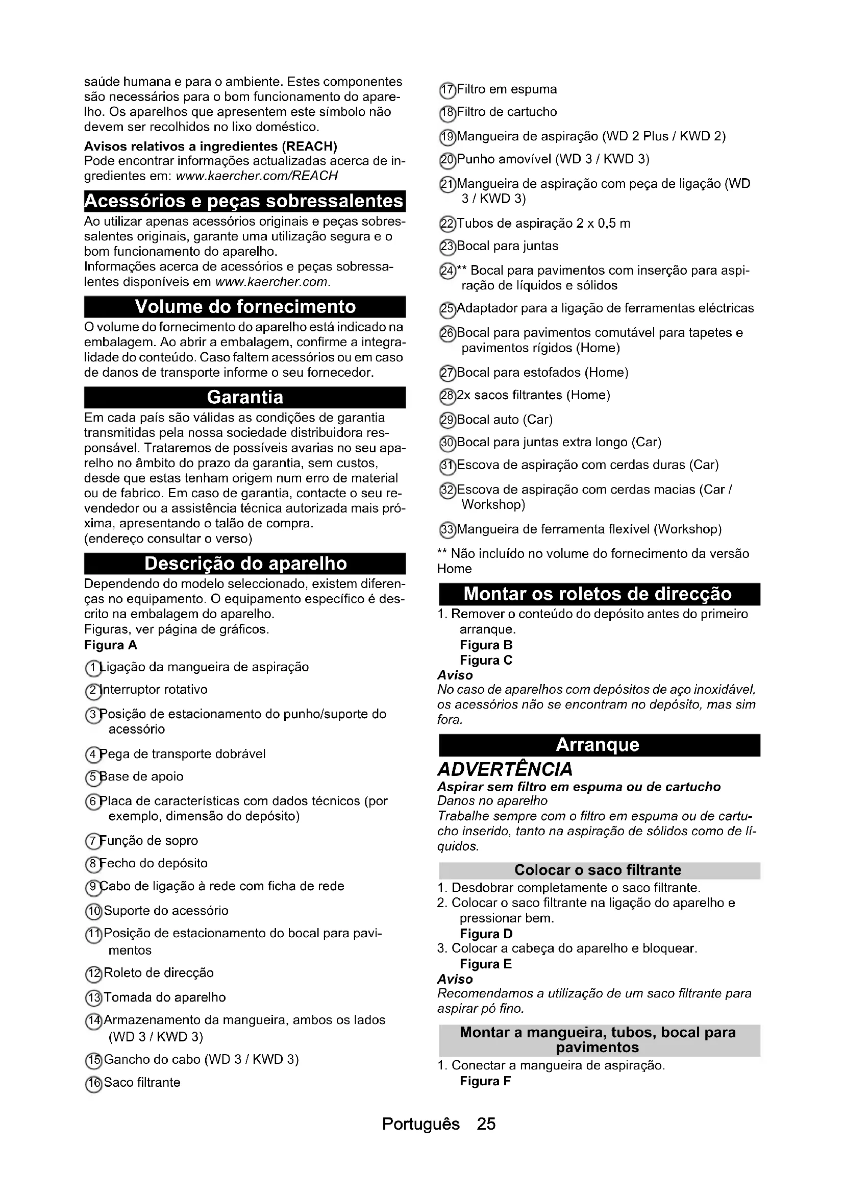 Figura T Ayuda en caso de fallos A menudo, las causas de los fallos son simples y pue- den solucionarse con ayuda del siguiente resumen. En caso de duda o fallos no mencionados aquí, póngase en contacto con el servicio de posventa. Potencia de aspiración decreciente El accesorio, la manguera de aspiración y el tubo de as- piración están obstruidos. Eliminar la obstrucción con un elemento adecuado. La bolsa de filtro está llena. Reemplazar la bolsa de filtro. El filtro para espumosa/filtro de cartucho está sucio. Limpiar el filtro para espumosa/filtro de cartucho (véase el apartado Limpieza del filtro para espumo- sa/filtro de cartucho). El filtro para espumosa/filtro de cartucho tiene daños. Sustituir el filtro para espumosa/filtro de cartucho. Datos técnicos Nota Los datos técnicos se encuentran en la placa de carac- terísticas. Indicações gerais Antes da primeira utilização do aparelho leia o manual de instruções original e os avisos de segurança que o acompa- nham. Proceda em conformidade. Conserve as duas folhas para referência ou utilização futura. Utilização prevista Utilize o aparelho exclusivamente na habitação privada. O aparelho destina-se à utilização como aspirador de lí- quidos e sólidos em conformidade com as descrições e os avisos de segurança contidos neste manual de ins- truções. As cinzas frias só podem ser aspiradas com acessórios adequados. Proteger o aparelho da chuva e não o guardar no exte- rior. Aviso O fabricante não se responsabiliza por eventuais danos resultantes da utilização para fins não previstos ou da operação incorrecta do aparelho. Protecção do meio ambiente Os materiais de empacotamento são recicláveis. Elimine as embalagens de acordo com os regula- mentos ambientais. Os aparelhos eléctricos e electrónicos contêm materiais recicláveis de valor e, com frequência, componentes como baterias, acumuladores ou óleo que, em caso de manipulação ou recolha er- rada, podem representar um potencial perigo para aPortuguês 25 saúde humana e para o ambiente. Estes componentes são necessários para o bom funcionamento do apare- lho. Os aparelhos que apresentem este símbolo não devem ser recolhidos no lixo doméstico. Avisos relativos a ingredientes (REACH) Pode encontrar informações actualizadas acerca de in- gredientes em: www.kaercher.com/REACH Acessórios e peças sobressalentes Ao utilizar apenas acessórios originais e peças sobres- salentes originais, garante uma utilização segura e o bom funcionamento do aparelho. Informações acerca de acessórios e peças sobressa- lentes disponíveis em www.kaercher.com. Volume do fornecimento O volume do fornecimento do aparelho está indicado na embalagem. Ao abrir a embalagem, confirme a integra- lidade do conteúdo. Caso faltem acessórios ou em caso de danos de transporte informe o seu fornecedor. Garantia Em cada país são válidas as condições de garantia transmitidas pela nossa sociedade distribuidora res- ponsável. Trataremos de possíveis avarias no seu apa- relho no âmbito do prazo da garantia, sem custos, desde que estas tenham origem num erro de material ou de fabrico. Em caso de garantia, contacte o seu re- vendedor ou a assistência técnica autorizada mais pró- xima, apresentando o talão de compra. (endereço consultar o verso) Descrição do aparelho Dependendo do modelo seleccionado, existem diferen- ças no equipamento. O equipamento específico é des- crito na embalagem do aparelho. Figuras, ver página de gráficos. Figura A 1 Ligação da mangueira de aspiração 2 Interruptor rotativo 3 Posição de estacionamento do punho/suporte do acessório 4 Pega de transporte dobrável 5 Base de apoio 6 Placa de características com dados técnicos (por exemplo, dimensão do depósito) 7 Função de sopro 8 Fecho do depósito 9 Cabo de ligação à rede com ficha de rede 10 Suporte do acessório 11 Posição de estacionamento do bocal para pavi- mentos 12 Roleto de direcção 13 Tomada do aparelho 14 Armazenamento da mangueira, ambos os lados (WD 3 / KWD 3) 15 Gancho do cabo (WD 3 / KWD 3) 16 Saco filtrante 17 Filtro em espuma 18 Filtro de cartucho 19 Mangueira de aspiração (WD 2 Plus / KWD 2) 20 Punho amovível (WD 3 / KWD 3) 21 Mangueira de aspiração com peça de ligação (WD 3 / KWD 3) 22 Tubos de aspiração 2 x 0,5 m 23 Bocal para juntas 24 ** Bocal para pavimentos com inserção para aspi- ração de líquidos e sólidos 25 Adaptador para a ligação de ferramentas eléctricas 26 Bocal para pavimentos comutável para tapetes e pavimentos rígidos (Home) 27 Bocal para estofados (Home) 28 2x sacos filtrantes (Home) 29 Bocal auto (Car) 30 Bocal para juntas extra longo (Car) 31 Escova de aspiração com cerdas duras (Car) 32 Escova de aspiração com cerdas macias (Car / Workshop) 33 Mangueira de ferramenta flexível (Workshop) ** Não incluído no volume do fornecimento da versão Home Montar os roletos de direcção